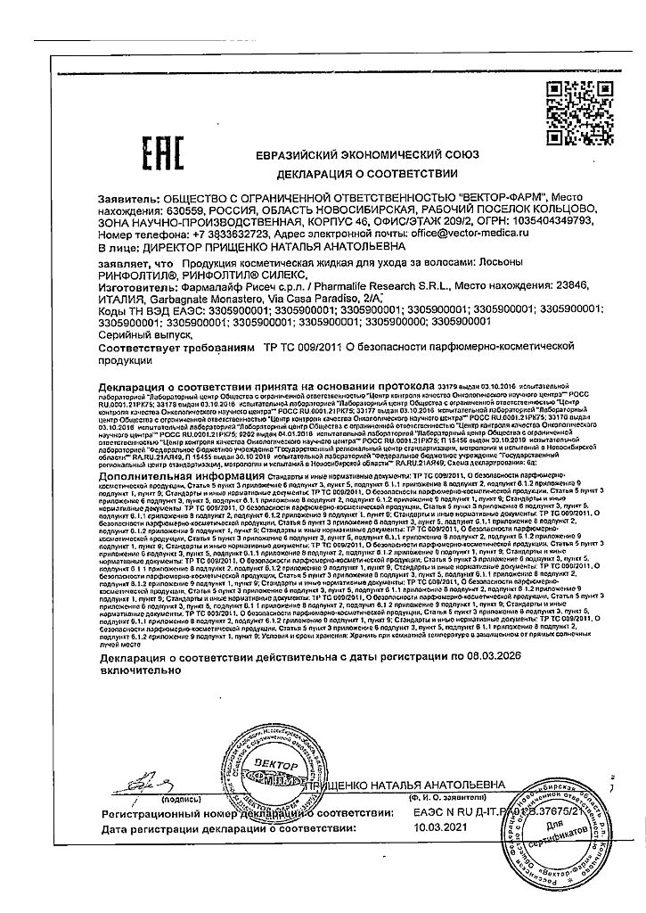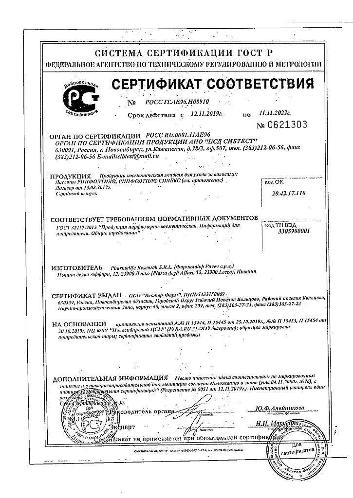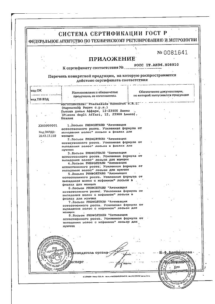 Ринфолтил лосьон + шампунь. Флакон с лосьоном рассчитан на 50 дней использования. Флакон с шампунем рассчитан на 90-100 дней использования. Курс лечения 3-4 месяца непрерывно.