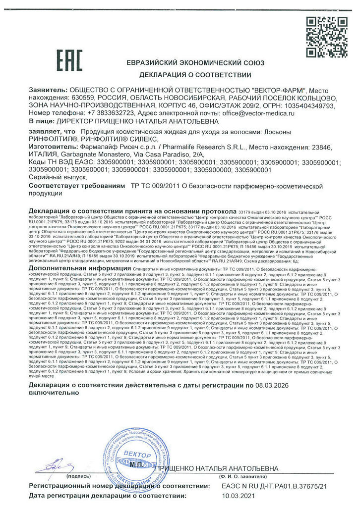 Ринфолтил ампулы + шампунь. Упаковка с ампулами рассчитана на 25-50 дней использования. Флакон с шампунем рассчитан на 90-100 дней использования. Курс лечения 3-4 месяца непрерывно.