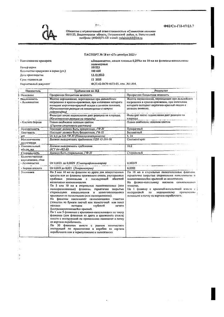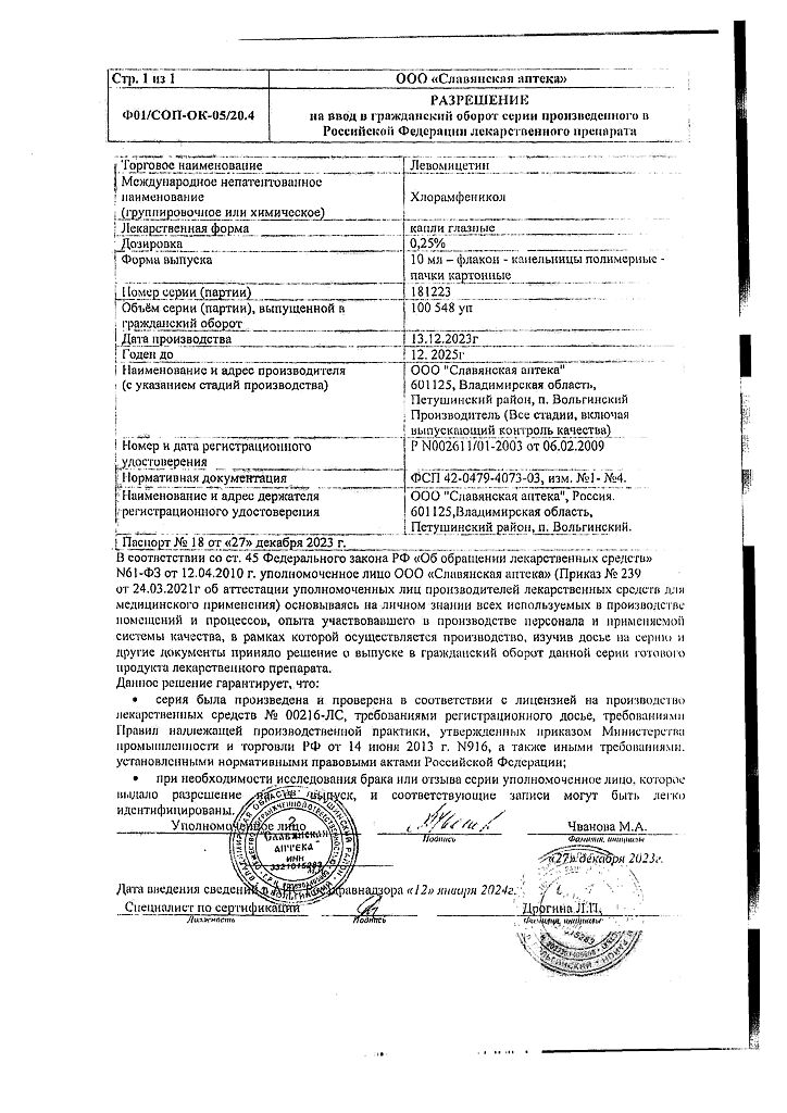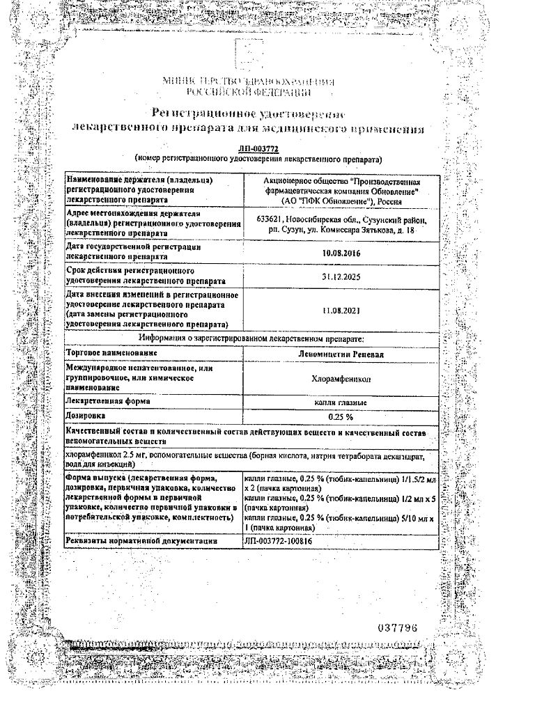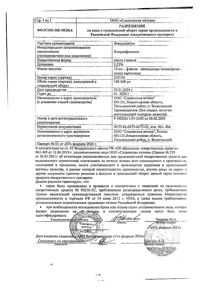Устойчивость микроорганизмов к левомицетину развивается медленно. После перорального применения препарат быстро абсорбируется в желудочно-кишечном тракте. Биодоступность при пероральном применении достигает 80%. Пик плазменных концентраций отмечается спустя 1-3 часа после приема.После перорального применения терапевтически значимые концентрации сохраняются в плазме крови в течение 4-6 часов, после парентерального введения – в течение 8-12 часов.