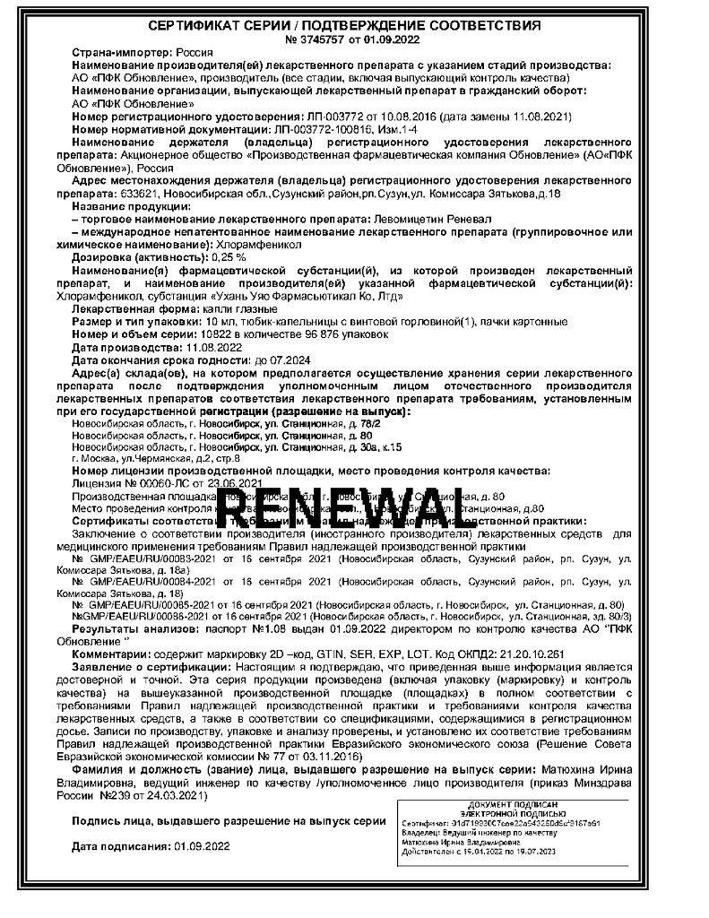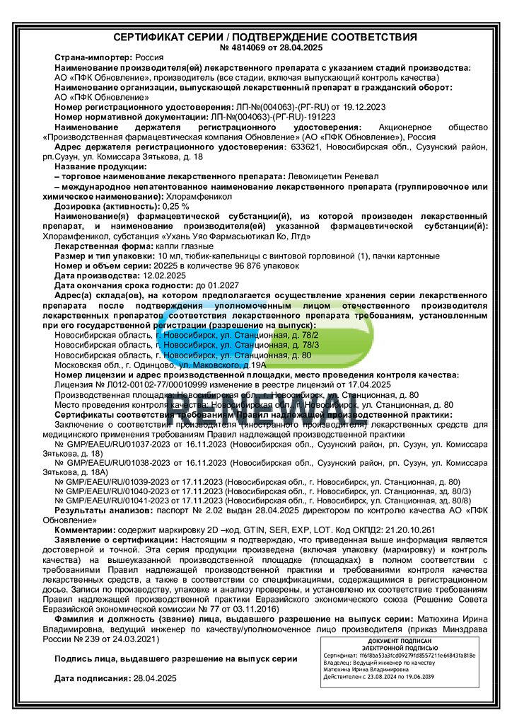 Степень связи хлорфенирамина с белками плазмы составляет около 50%. Левомицетин проникает через гематоплацентарный и гематоэнцефалический барьер, выделяется с грудным молоком. Метаболизируется в печени, выводится преимущественно почками, некоторая часть препарата выводится кишечником. Период полувыведения достигает 1,5-3,5 часов.