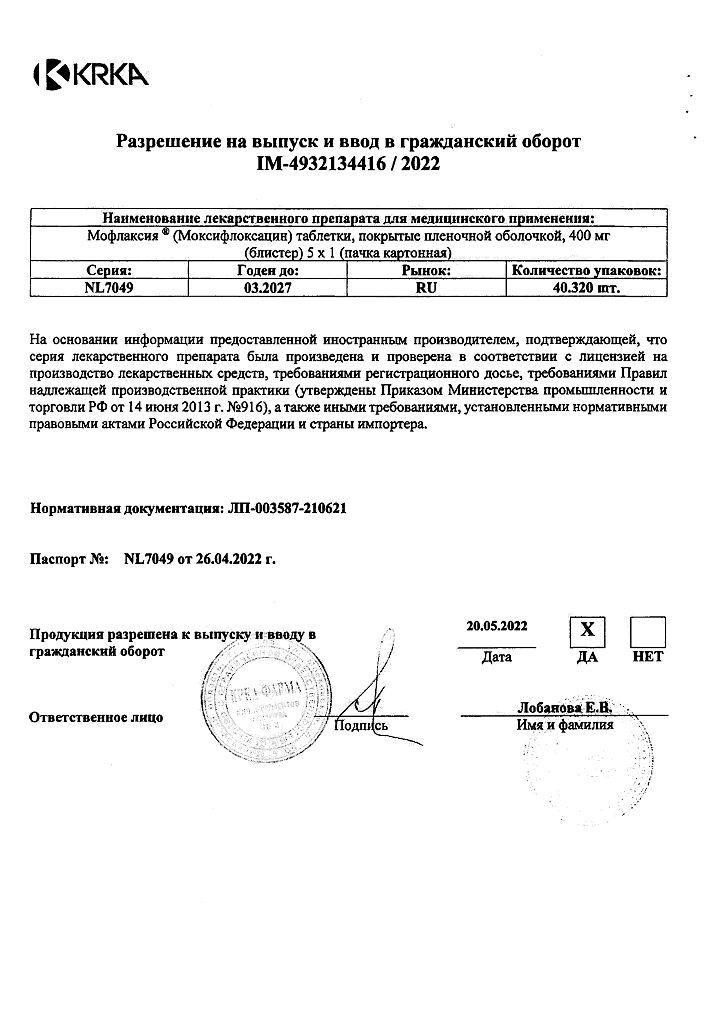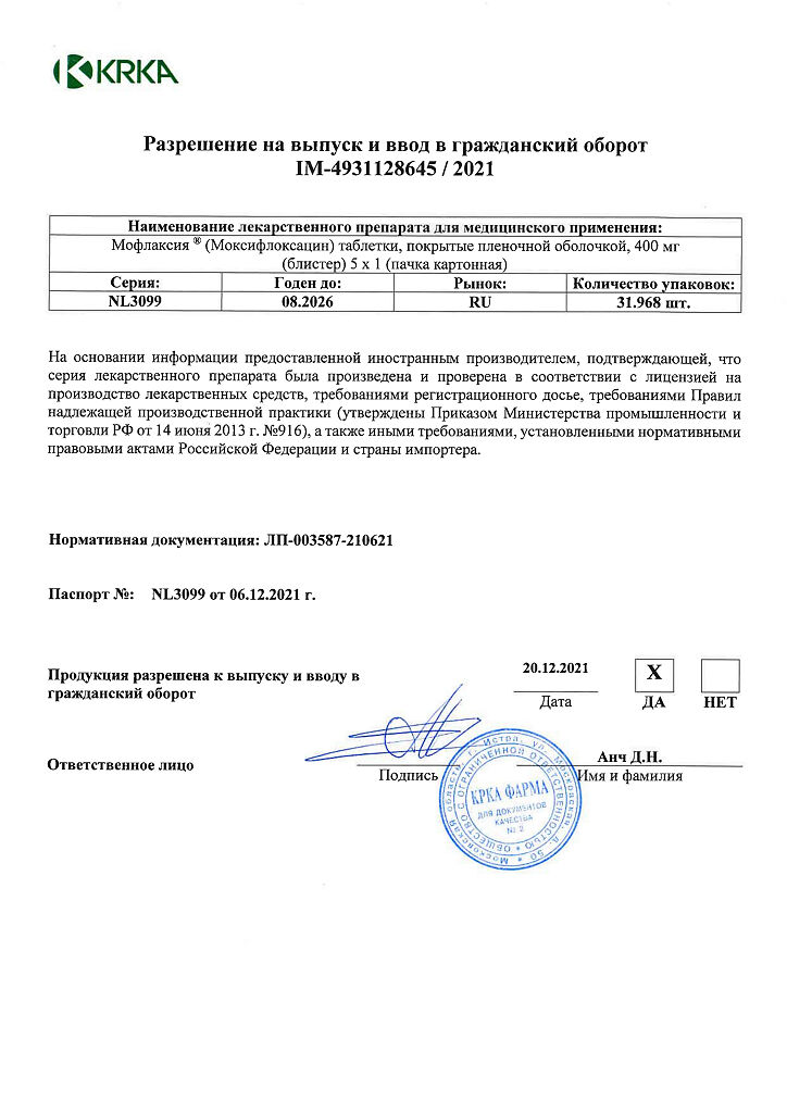 После однократной инфузии моксифлоксацина в дозе 400 мг в течение 1 ч С max достигается в конце инфузии и составляет приблизительно 4,1 мг/л, что соответствует ее увеличению приблизительно на 26% по сравнению с величиной этого показателя при приеме моксифлоксацина внутрь. Экспозиция моксифлоксацина, определяемая по показателю AUG, незначительно превышает таковую при приеме моксифлоксацина внутрь. Абсолютная биодоступность составляет приблизительно 91%. После многократных внутривенных инфузии моксифлоксацина в дозе 400 мг продолжительностью 1 ч максимальная и минимальная стационарная концентрация варьируют в пределах от 4,1 мг/л до 5,9 мг/л и от 0,43 мг/л до 0,84 мг/л, соответственно. Средняя стабильная концентрация, равная 4,4 мг/л, достигается в конце инфузии.