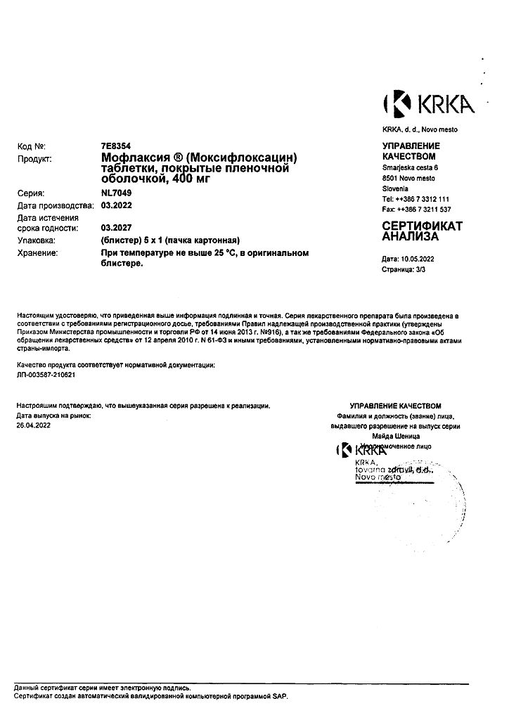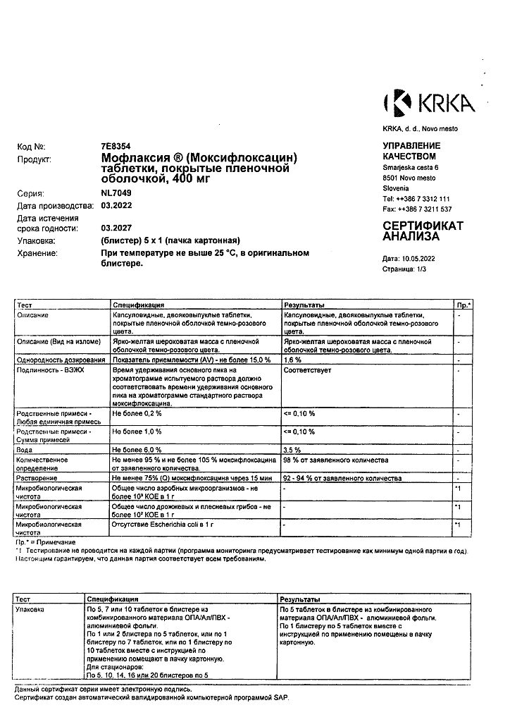 Период полувыведения моксифлоксацина составляет примерно 12 ч. Средний общий клиренс после введения в дозе 400 мг составляет 1 79-246 мл/мин. Почечный клиренс составляет 24-53 мл/мин. Это свидетельствует о частичной канальцевой реабсорбции моксифлоксацина.