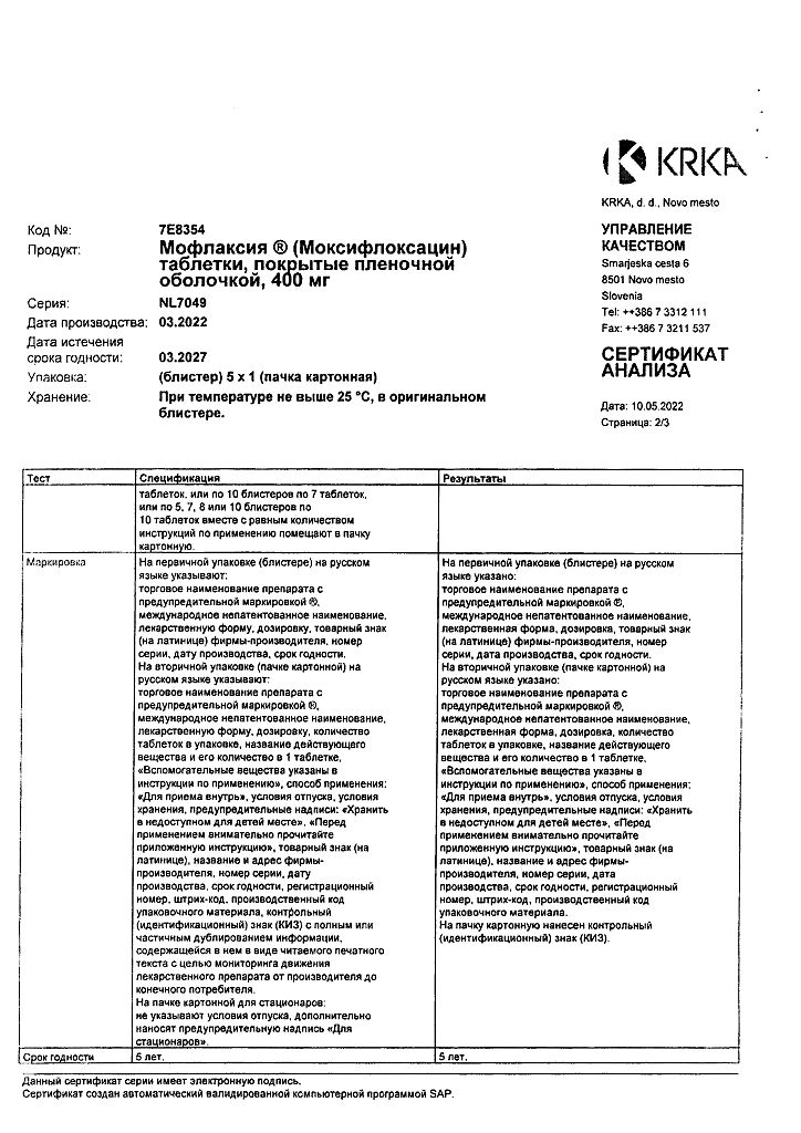 Моксифлоксацин подвергается биотрансформации 2-ой фазы и выводится из организма почками, а также кишечником, как в неизмененном виде, так и в виде неактивных сульфосоеди нений (Ml) и глюкуронидов (М2).