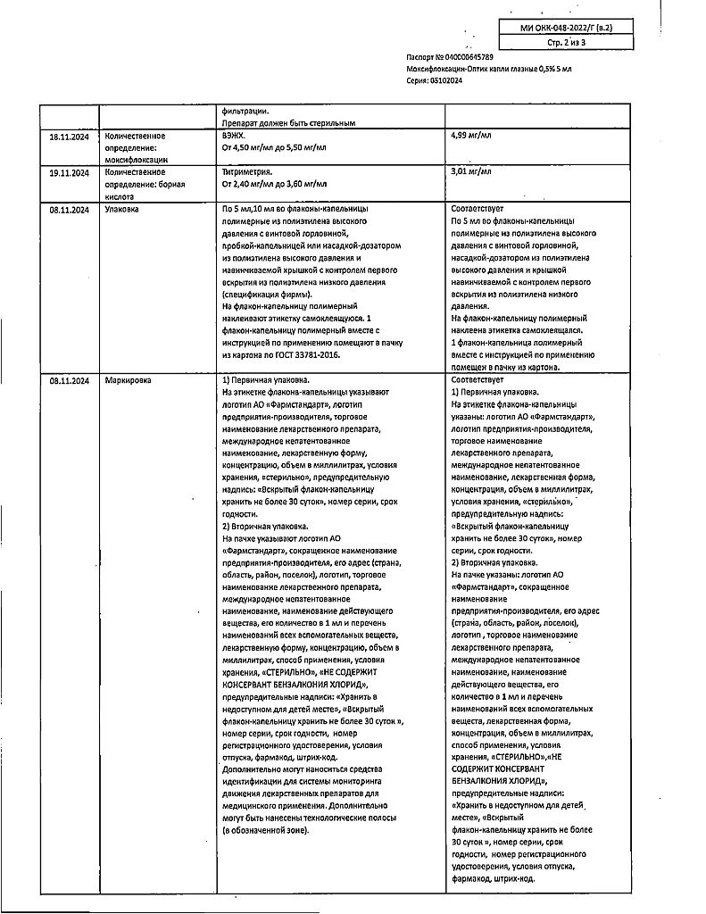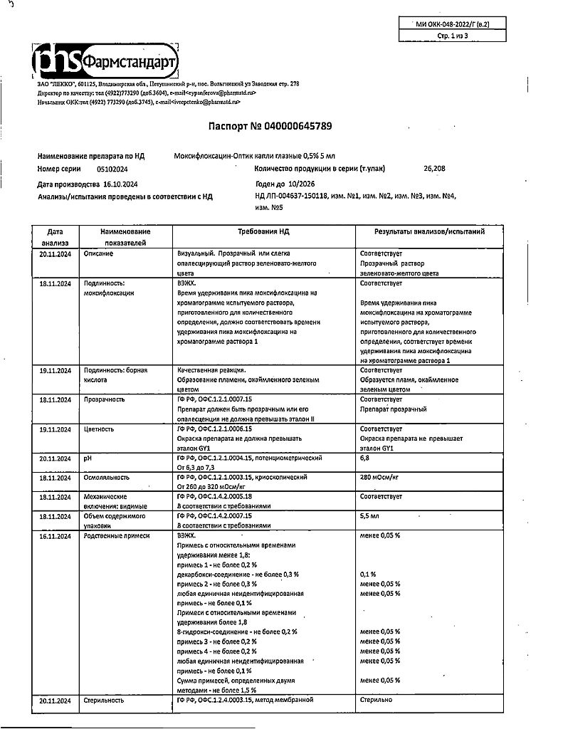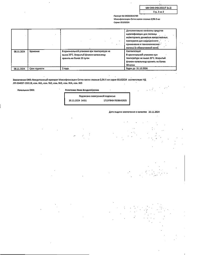 Моксифлоксацин не подвергается биотрансформации микросомальной системой цитохрома Р450. Метаболиты Ml и М2 присутствуют в плазме крови в концентрациях ниже, чем исходное соединение. По результатам доклинических исследований было доказано, что указанные метаболиты не имеют негативного воздействия на организм с точки зрения безопасности и переносимости.