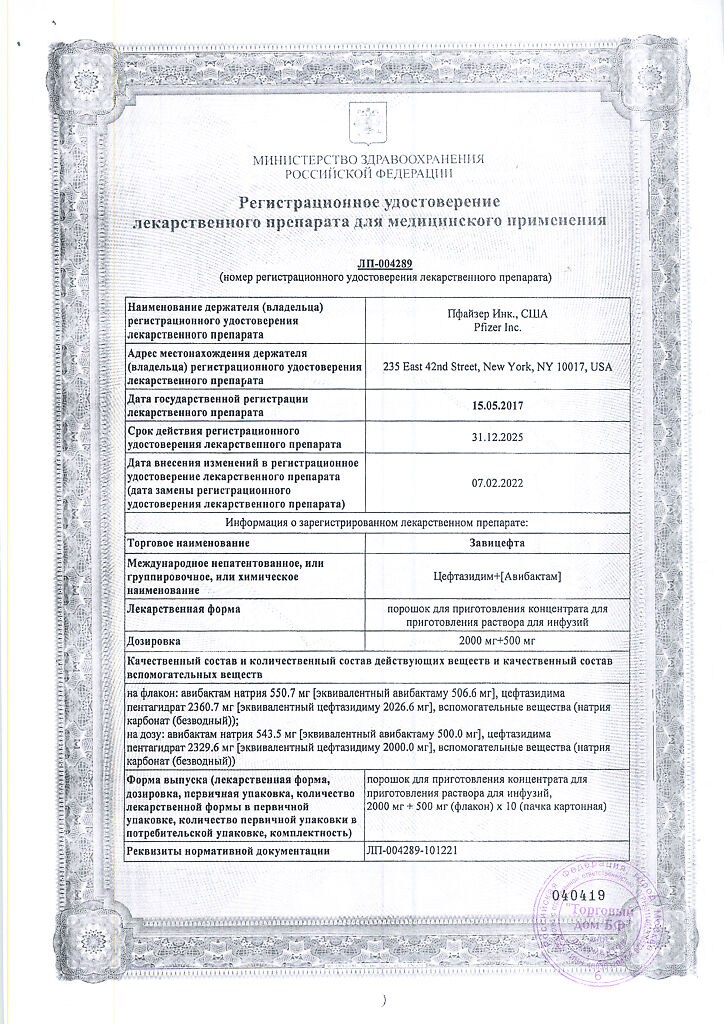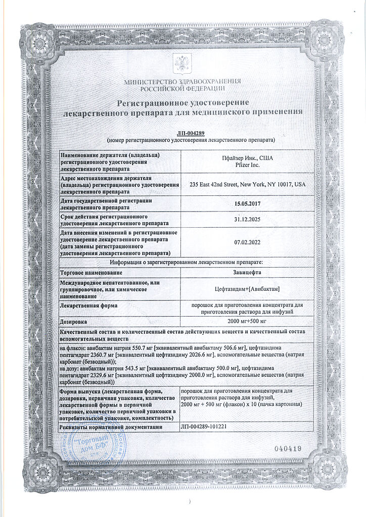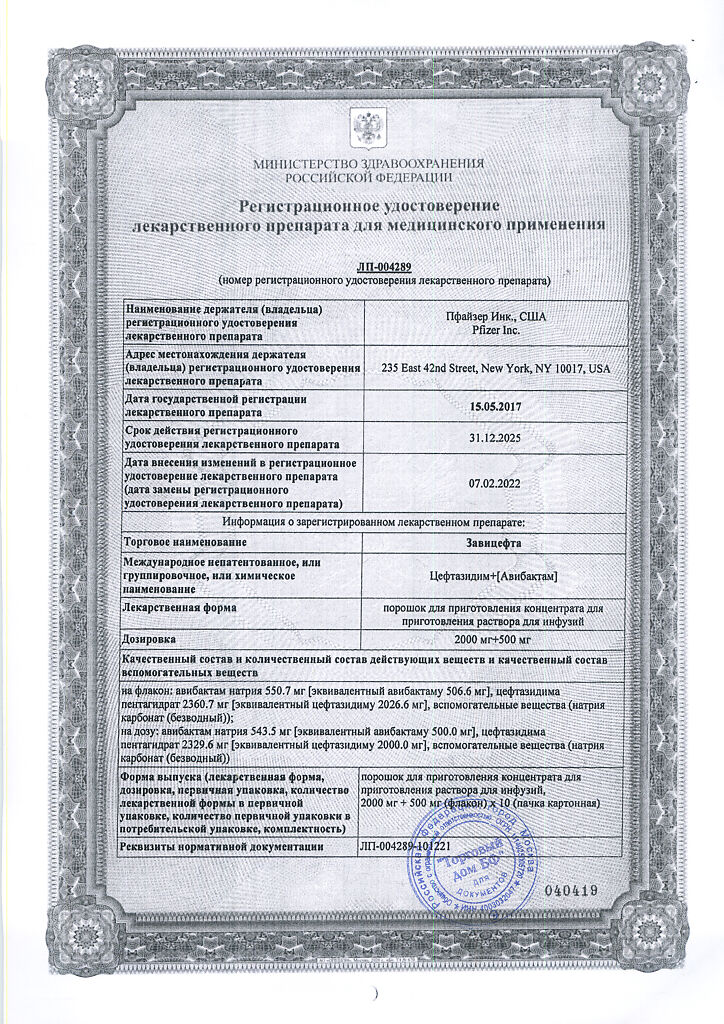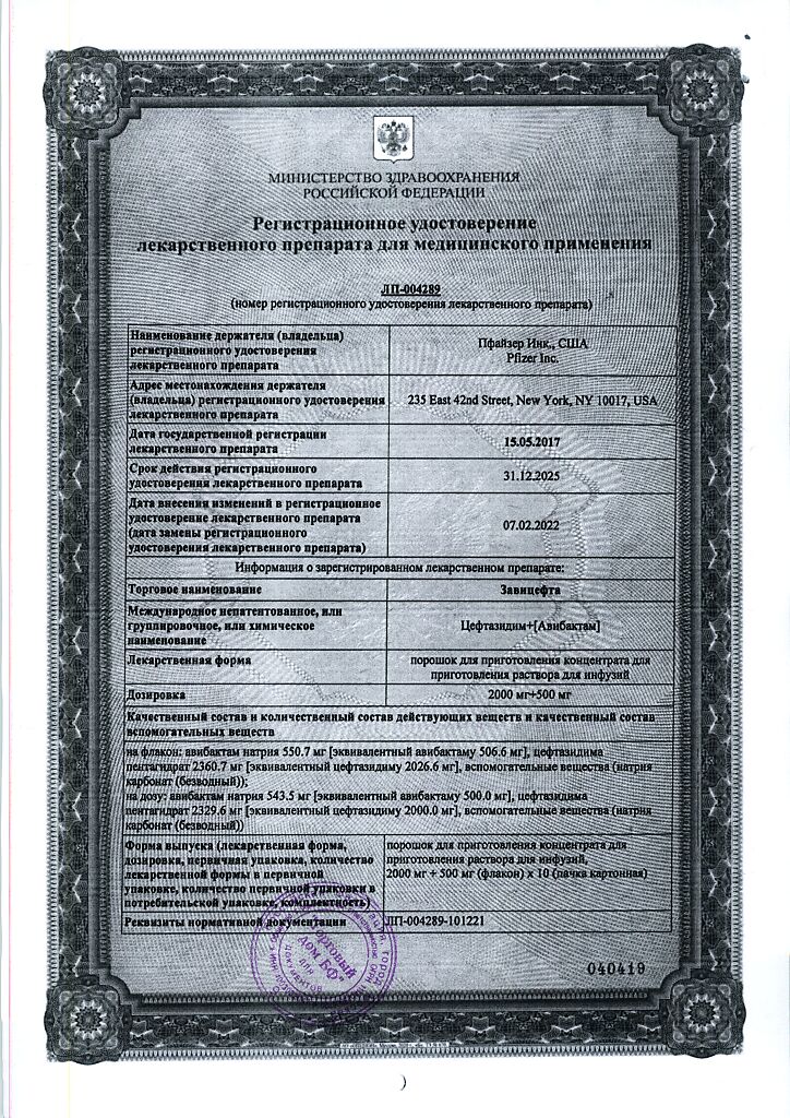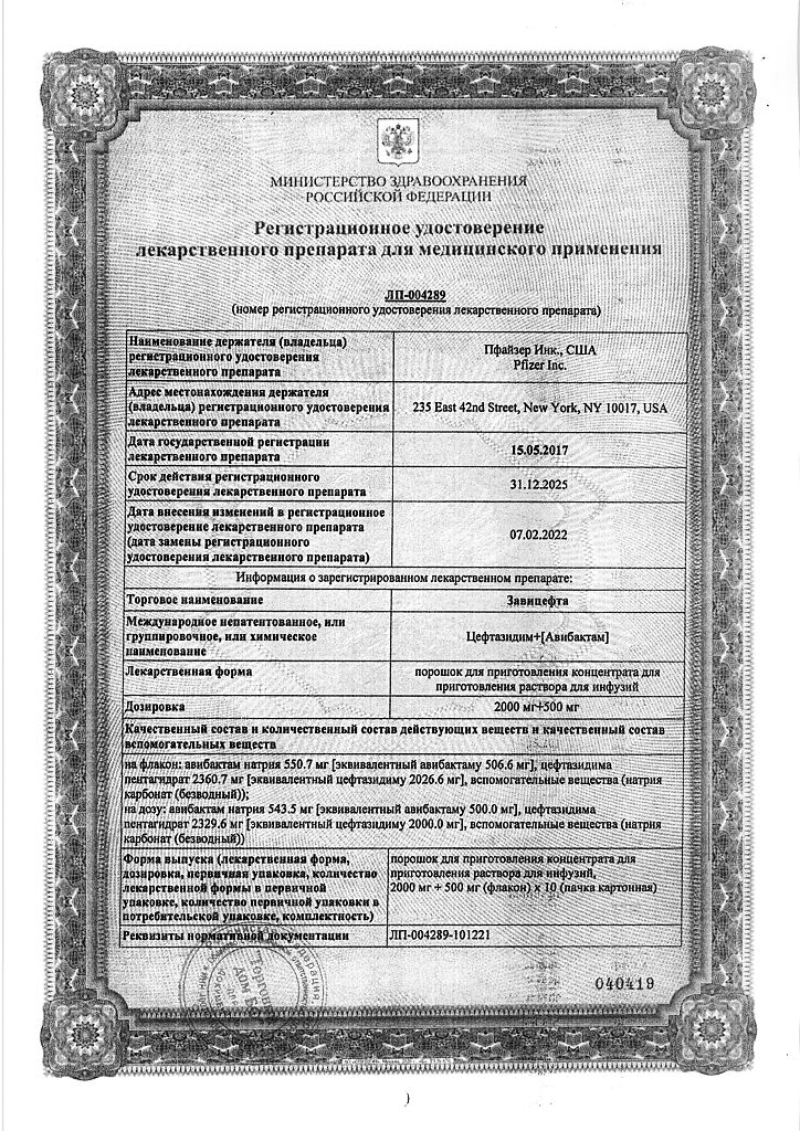 Активные вещества: авибактам натрия 543.5 мг, что соответствует содержанию авибактама 500 мг; цефтазидима пентагидрат 2329.6 мг, что соответствует содержанию цефтазидима 2000 мг;