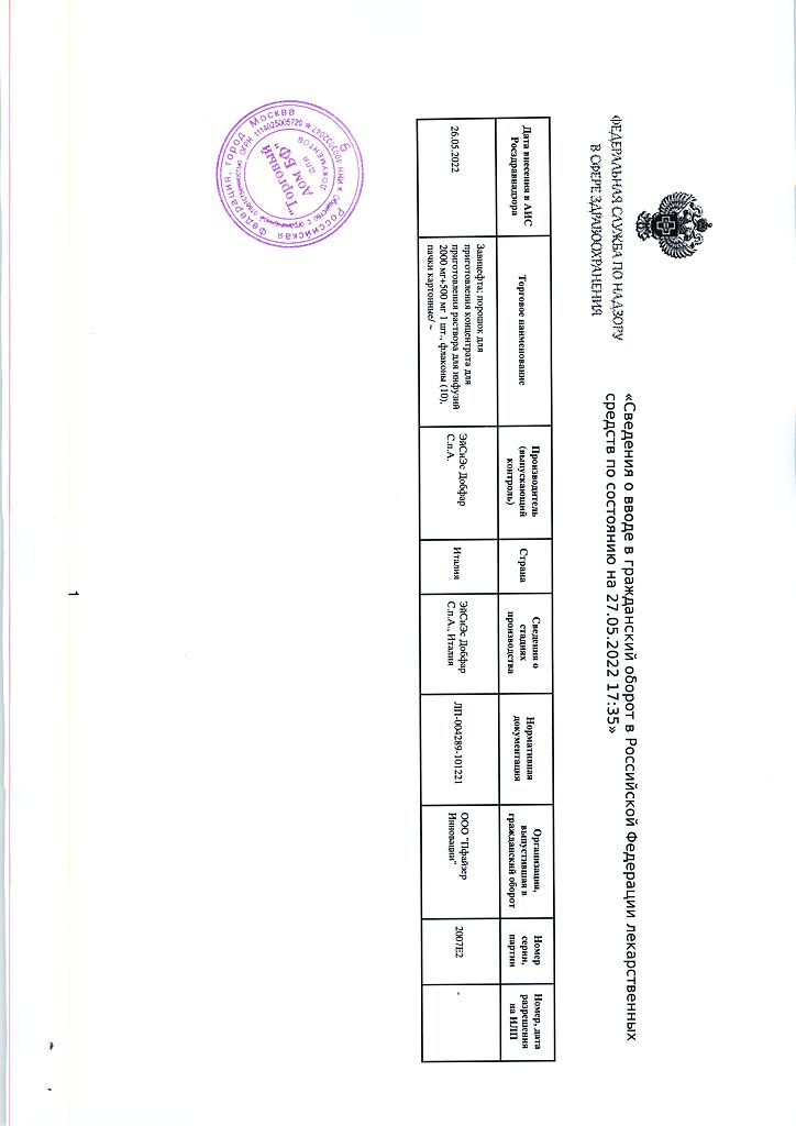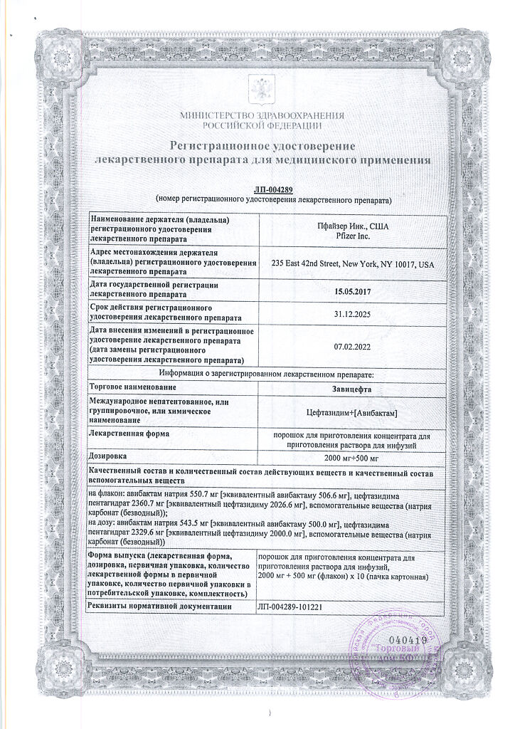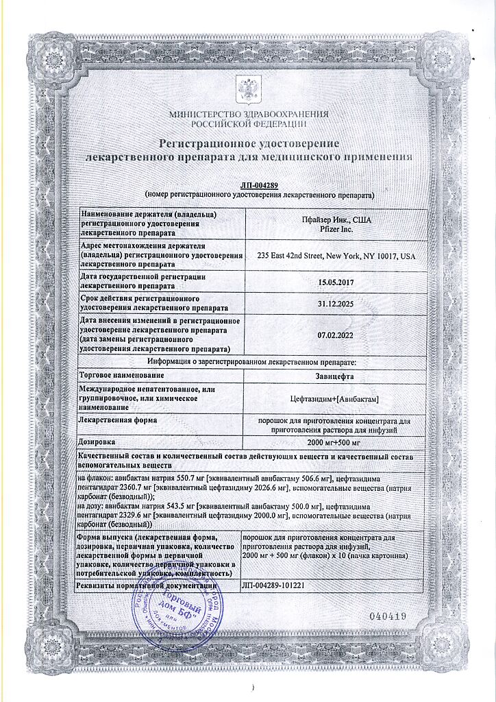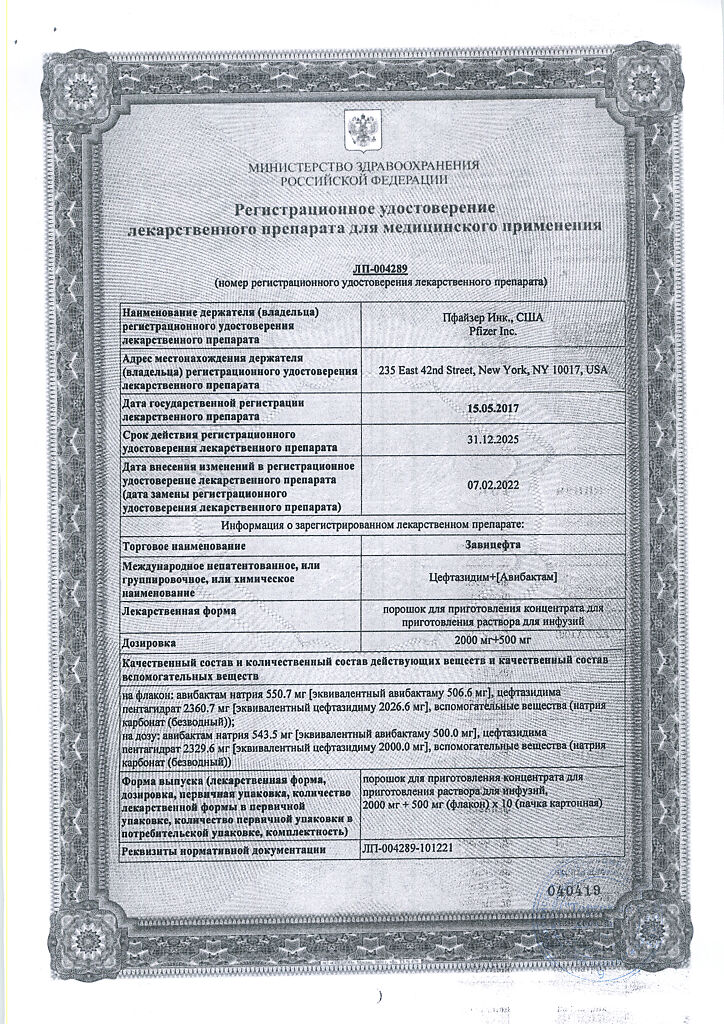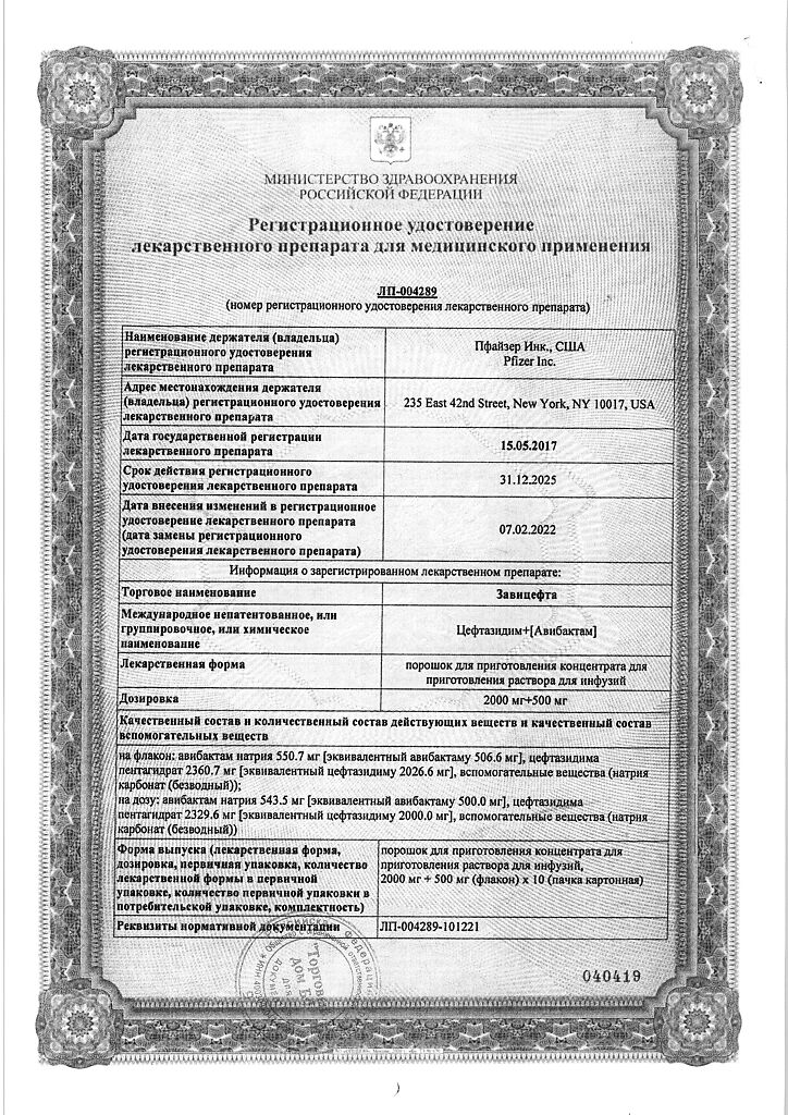 Активные вещества: авибактам натрия 543.5 мг, что соответствует содержанию авибактама 500 мг; цефтазидима пентагидрат 2329.6 мг, что соответствует содержанию цефтазидима 2000 мг;