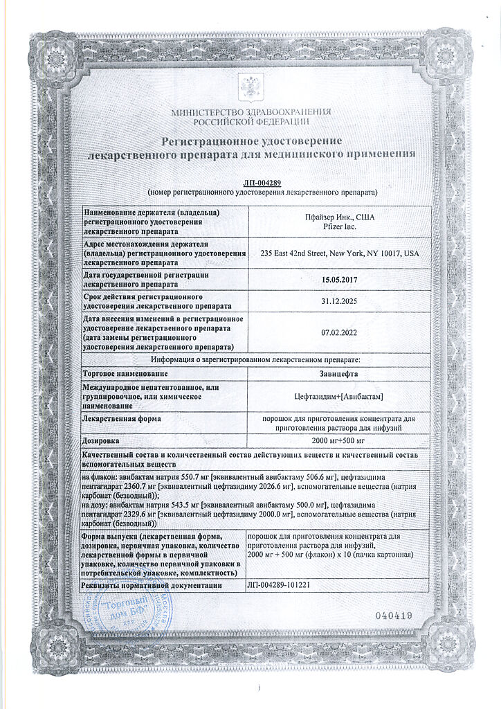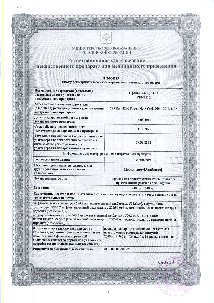 Механизм резистентности. Препарат не активен в отношении бактерий, продуцирующих металло-β-лактамазы. Механизмы бактериальной резистентности, которые потенциально могут повлиять на активность препарата, включают мутантные или приобретенные ПСБ, снижение проницаемости внешней мембраны для авибактама или цефтазидима, активное выведение (эффлюкс) авибактама или цефтазидима, а также β-лактамазы, устойчивые к ингибированию авибактамом и способные гидролизировать цефтазидим.