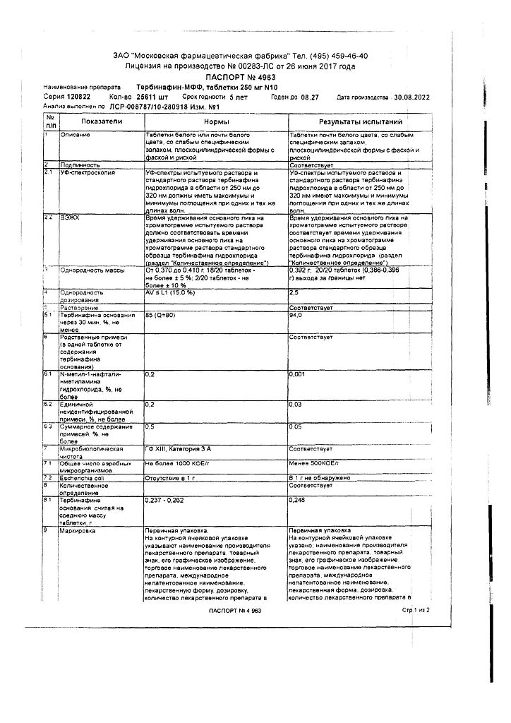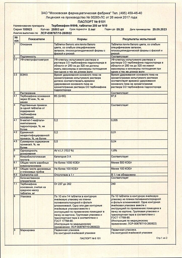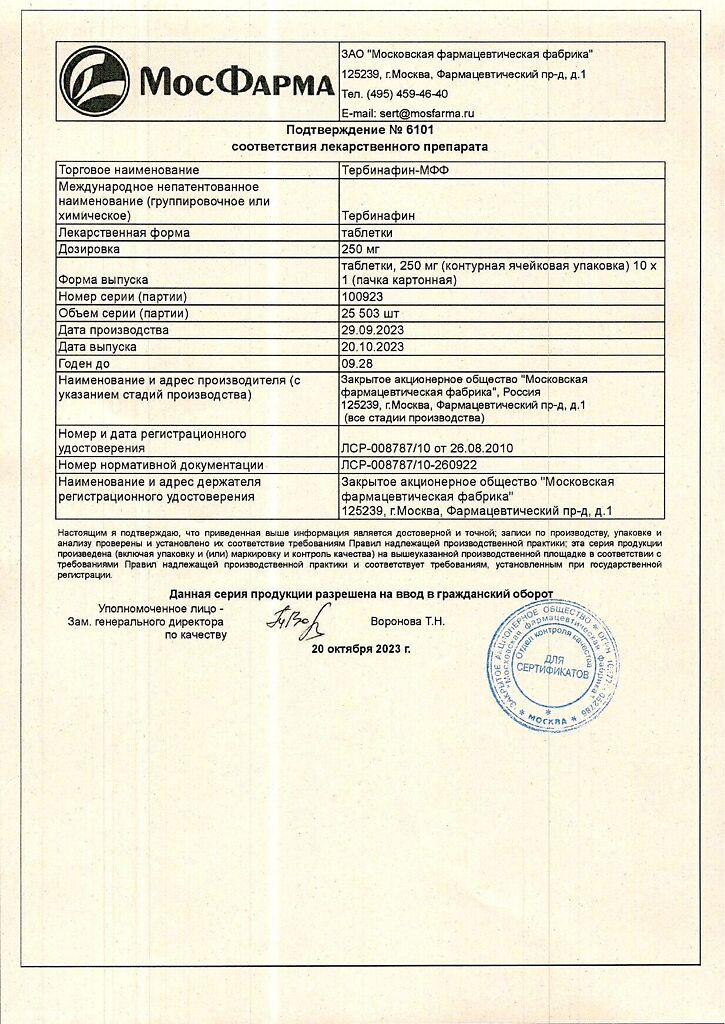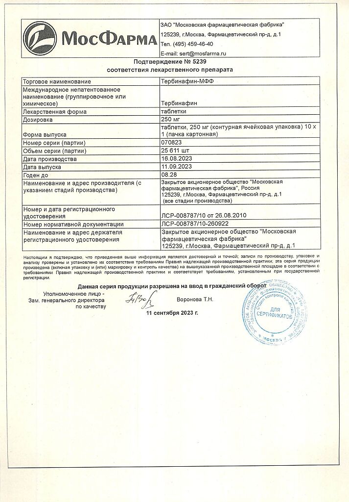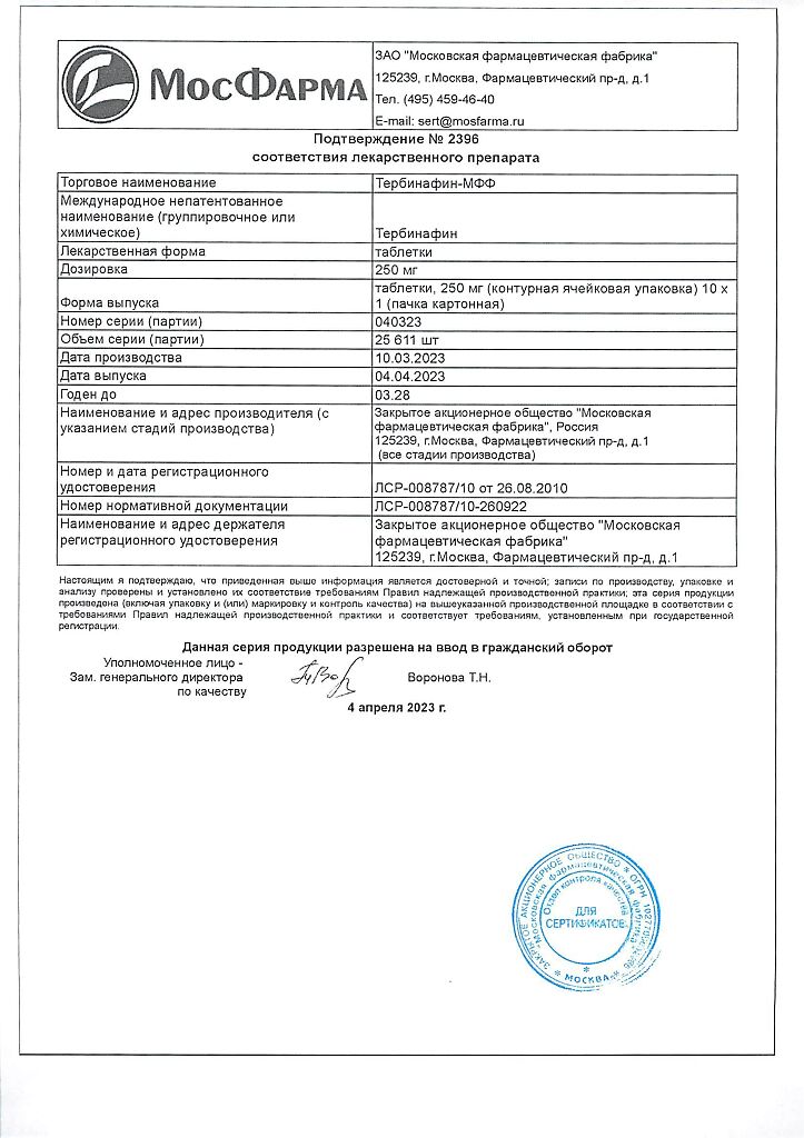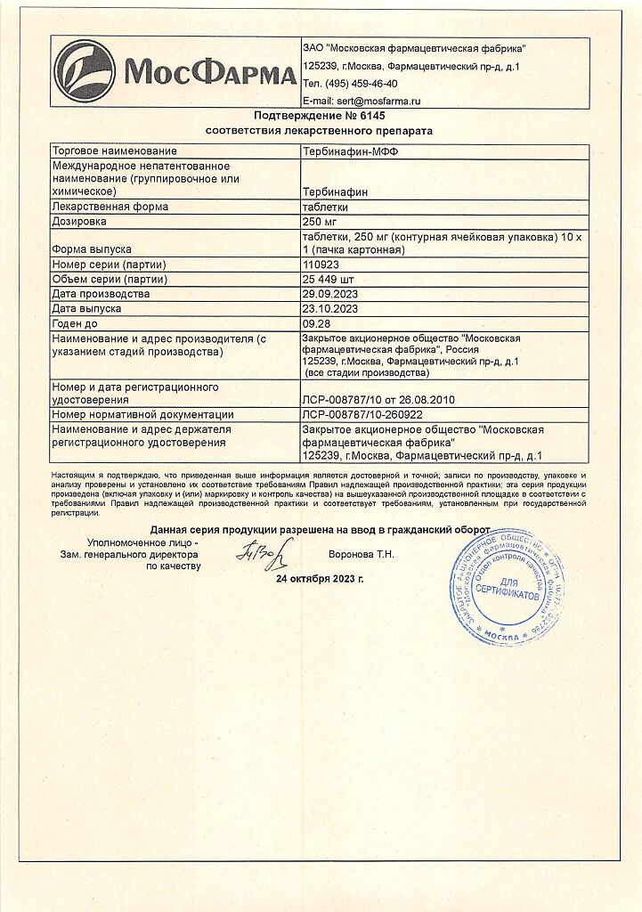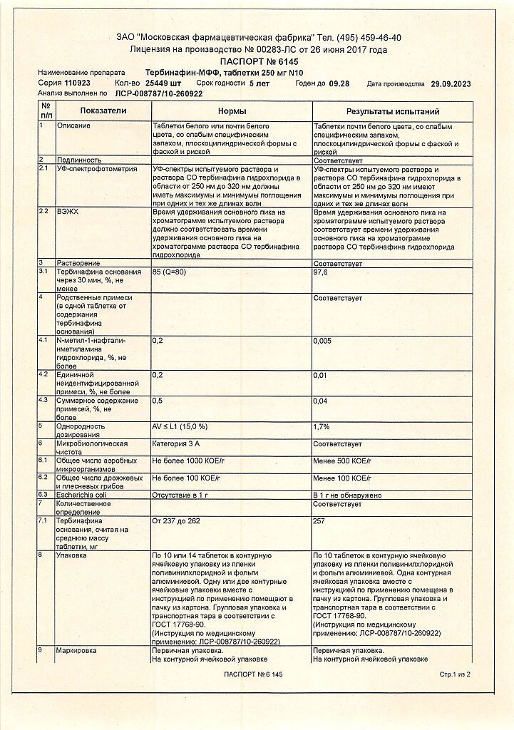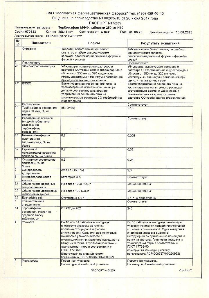 действуюшие вещества:тербинафина гидрохлорид 250 мг;