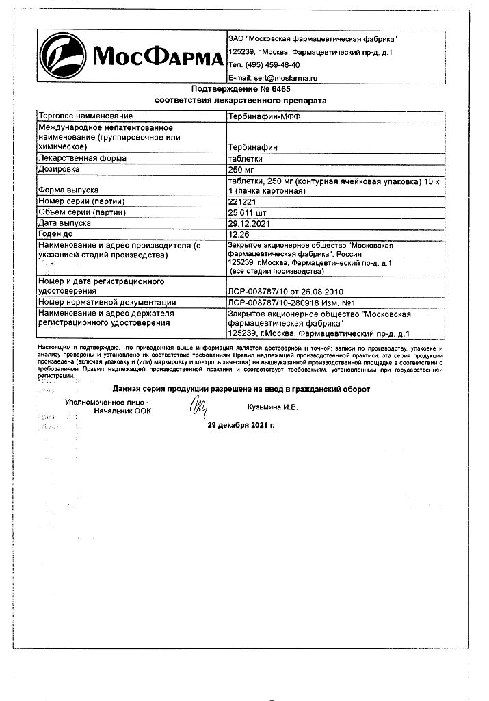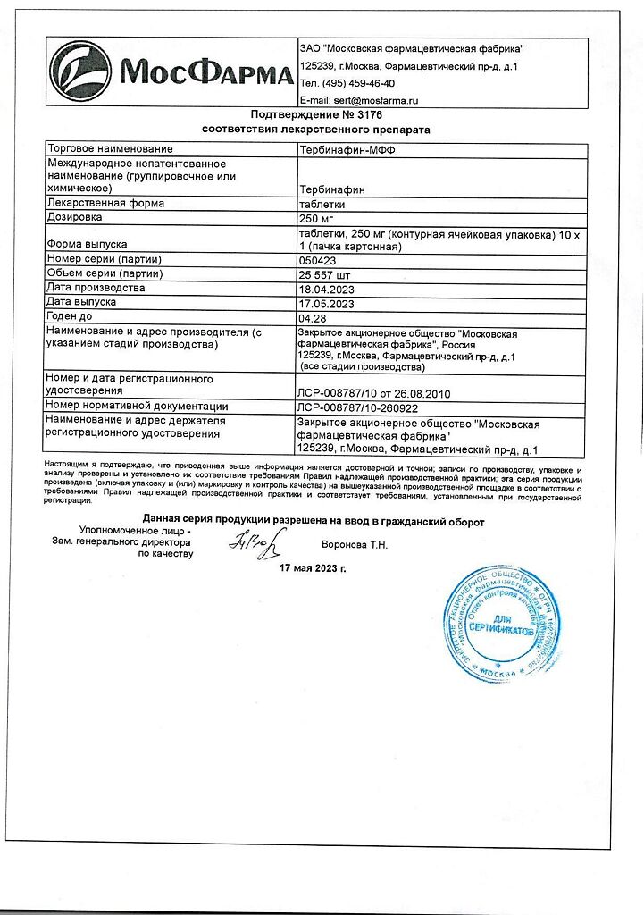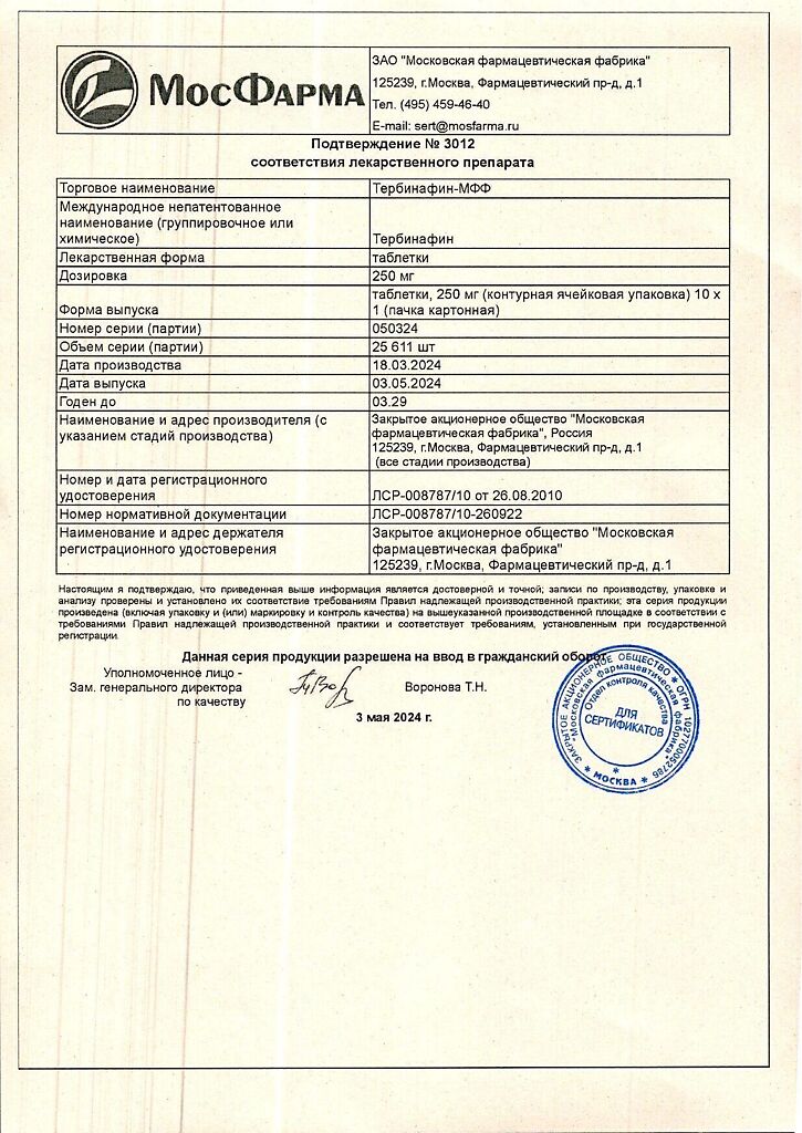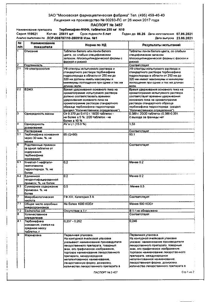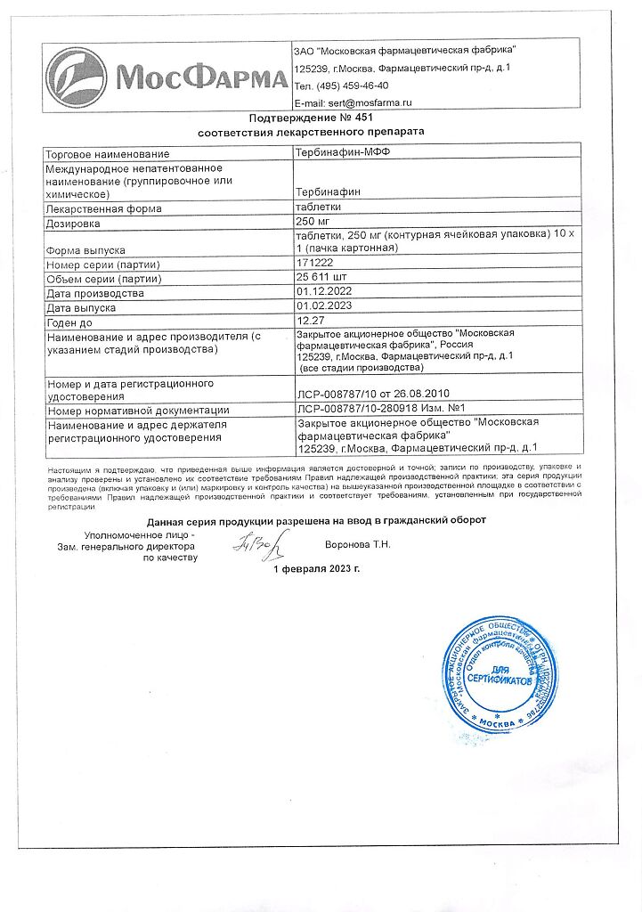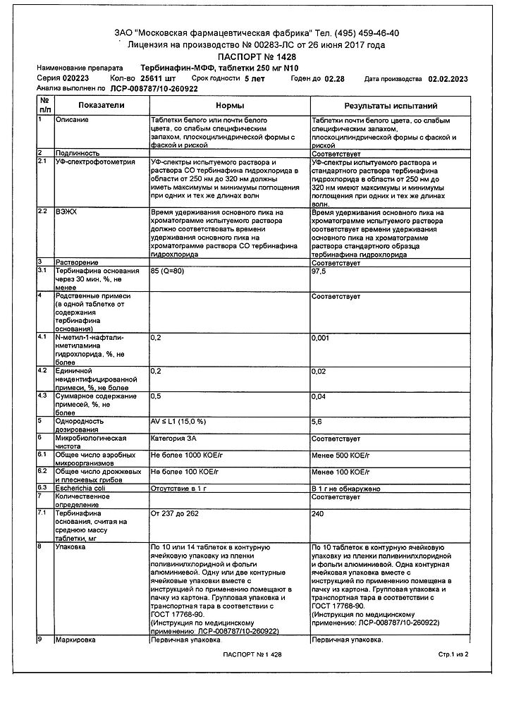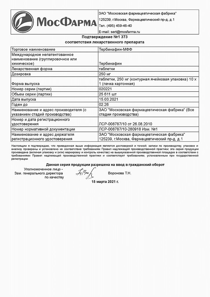 действуюшие вещества:тербинафина гидрохлорид 250 мг;