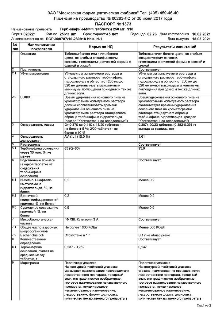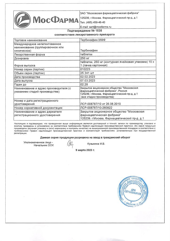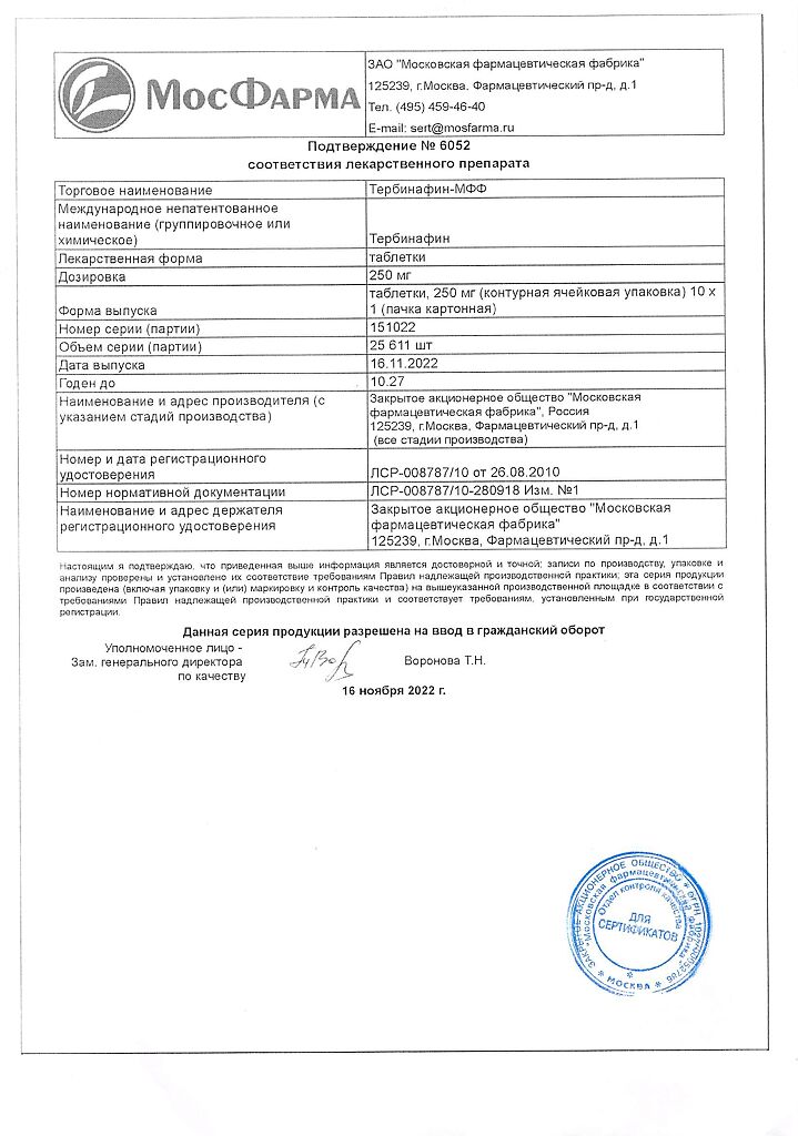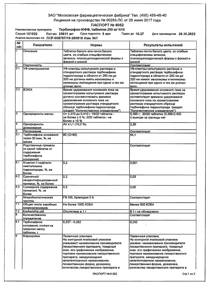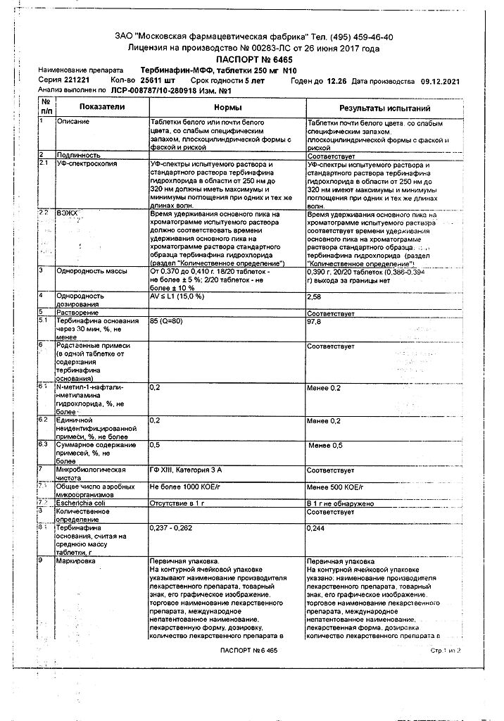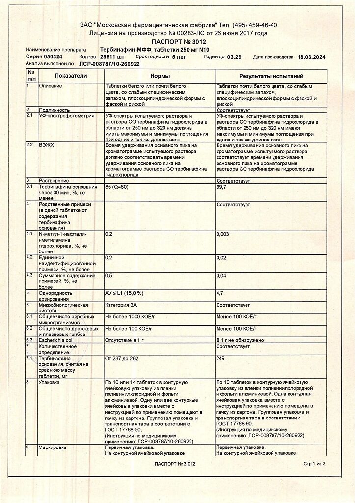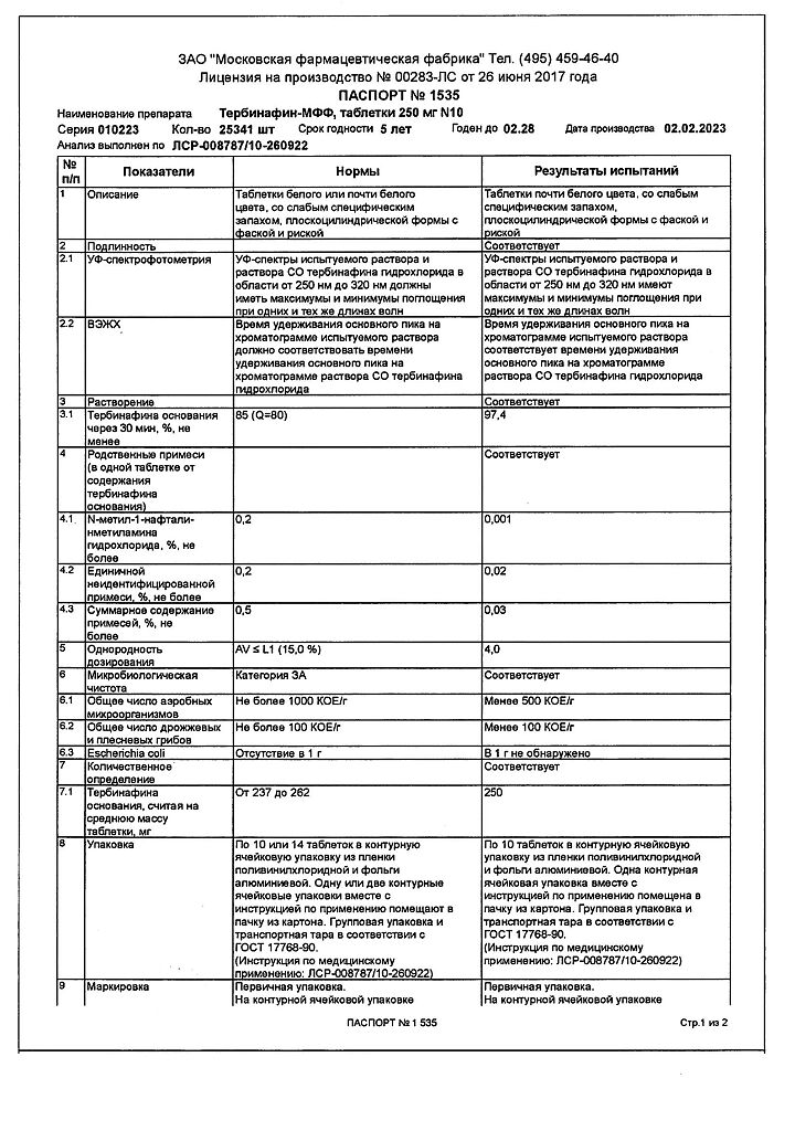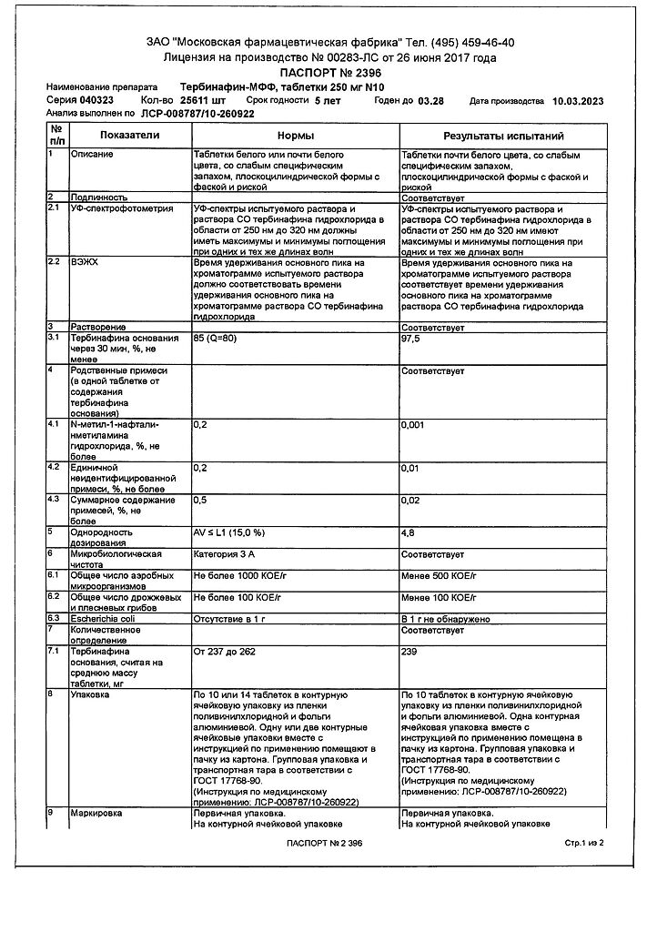 действуюшие вещества:тербинафина гидрохлорид 250 мг;