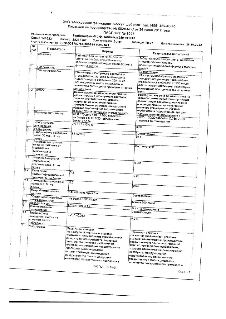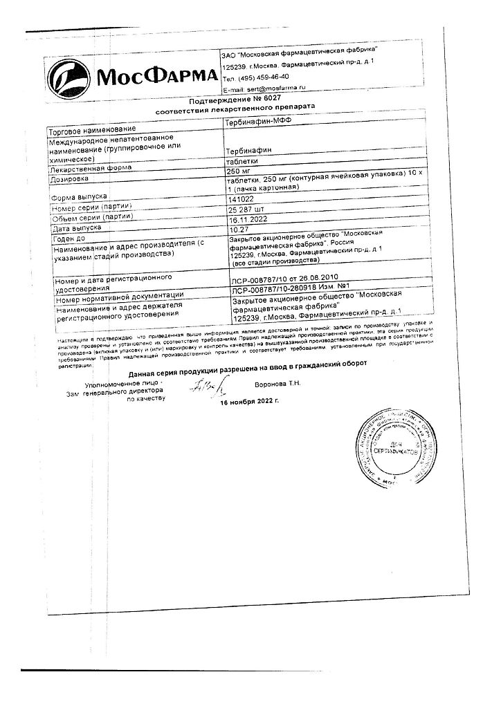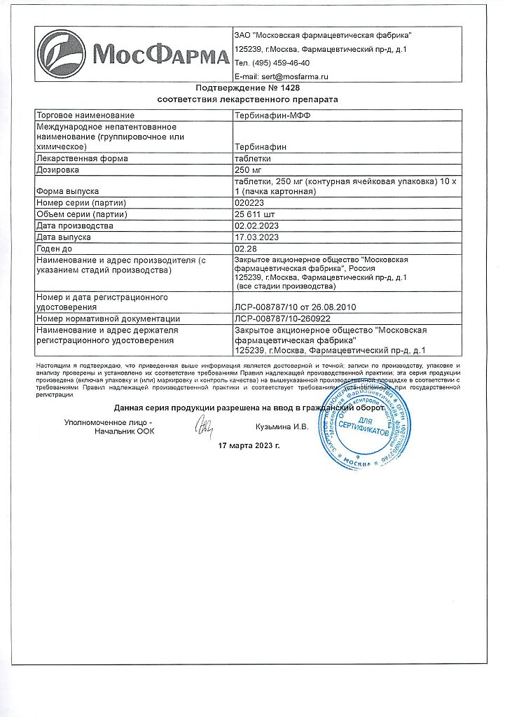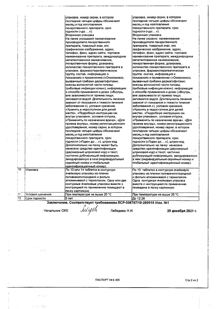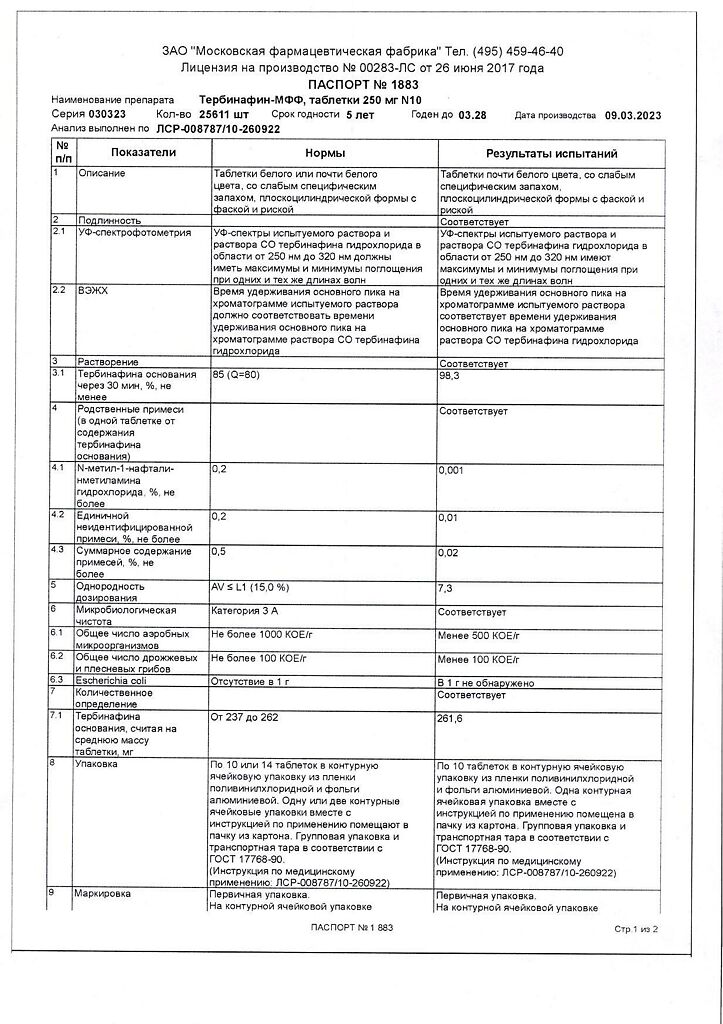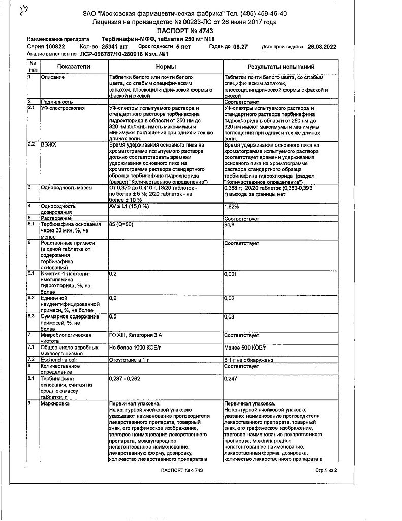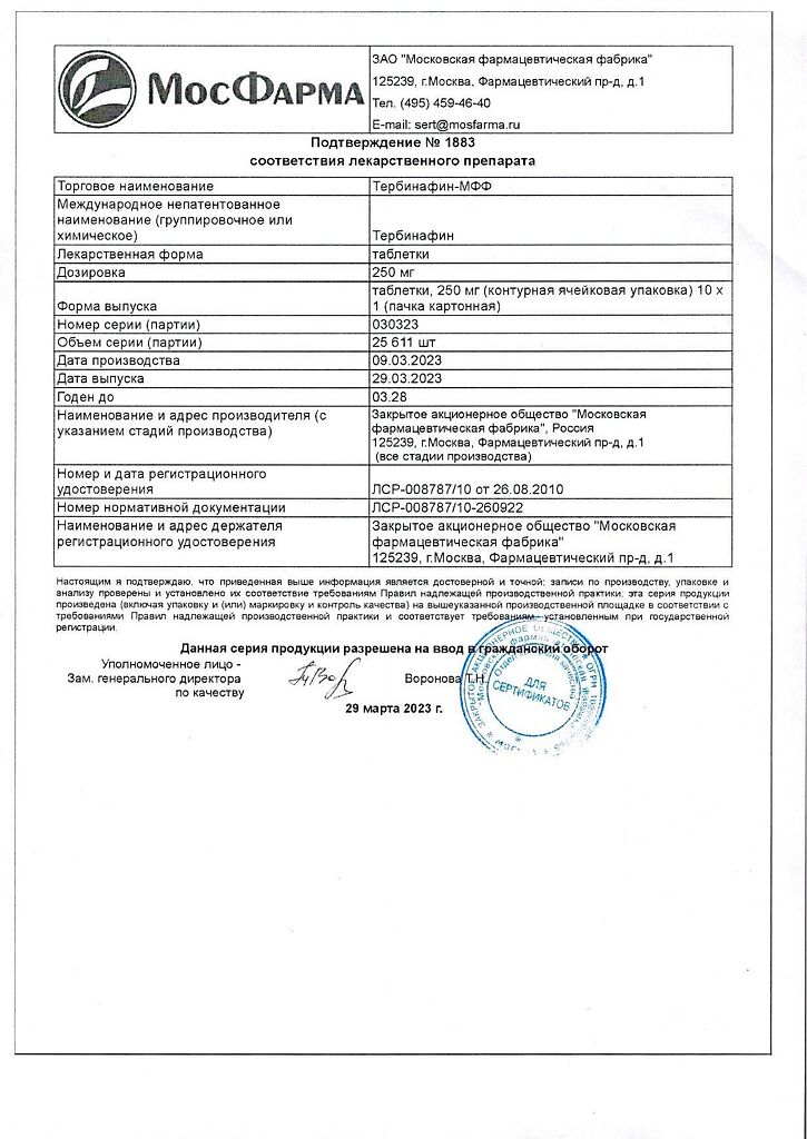 действуюшие вещества:тербинафина гидрохлорид 250 мг;