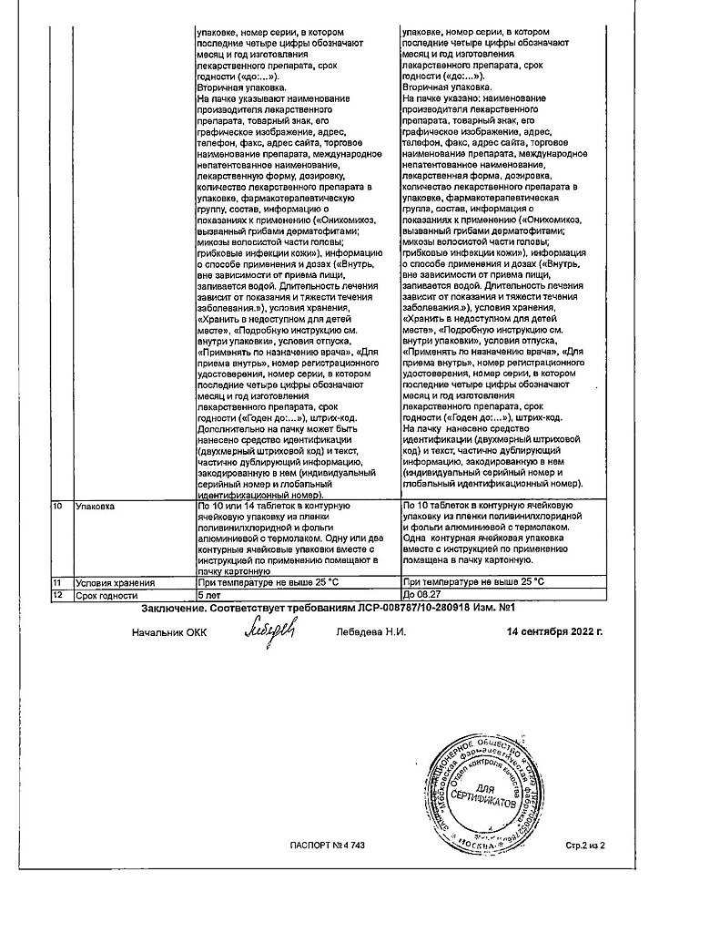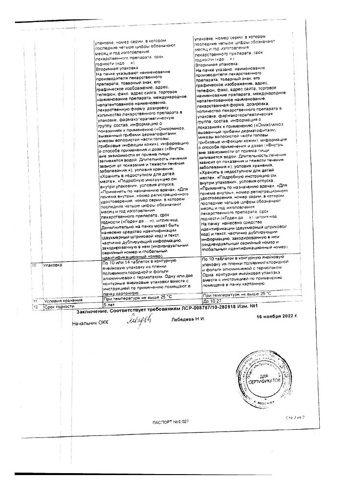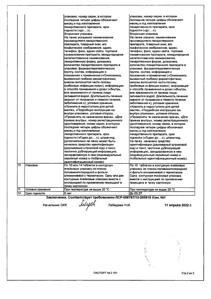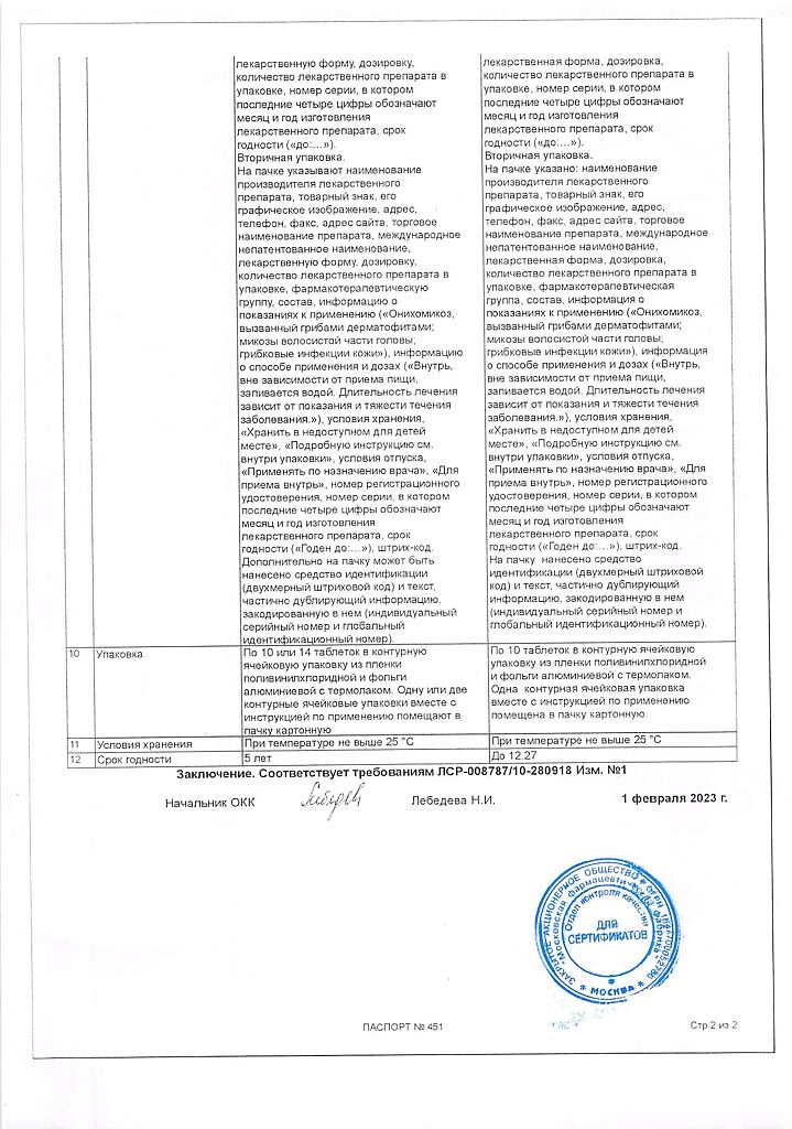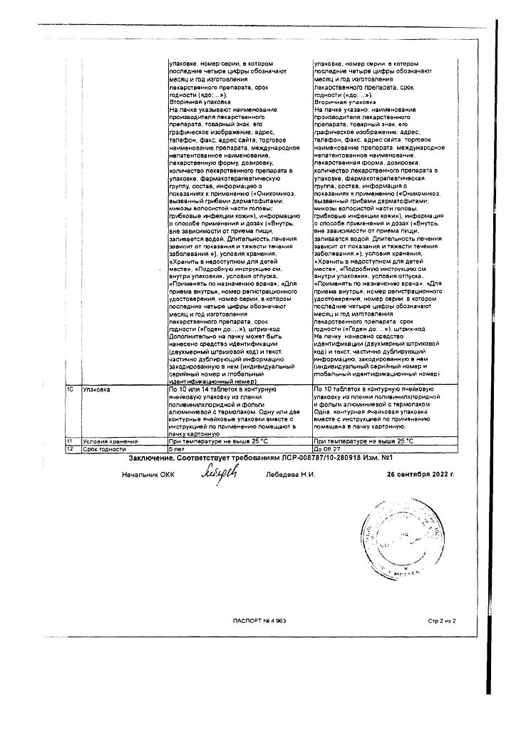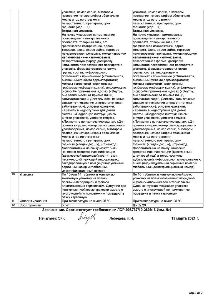 Онихомикоз: продолжительность терапии в среднем 6-12 недель. При поражении ногтей пальцев кистей и стоп (за исключением большого пальца стопы), или при молодом возрасте больного длительность лечения может быть менее 12 недель. При инфекции большого пальца стопы обычно достаточно 3-месячного курса лечения.