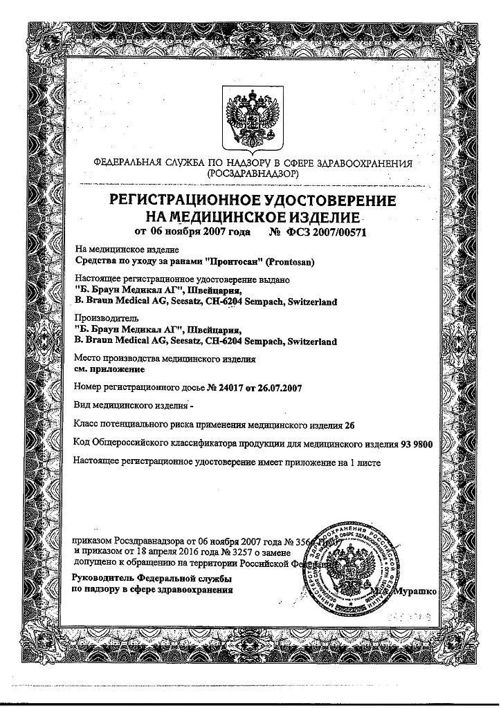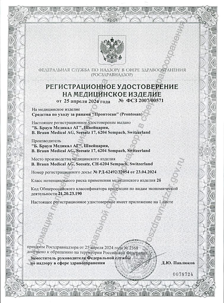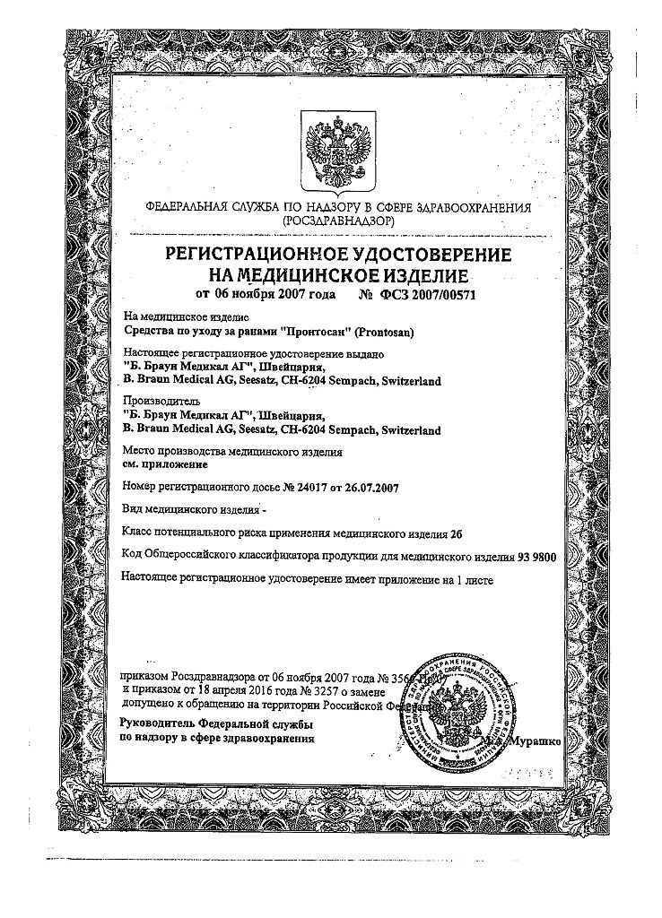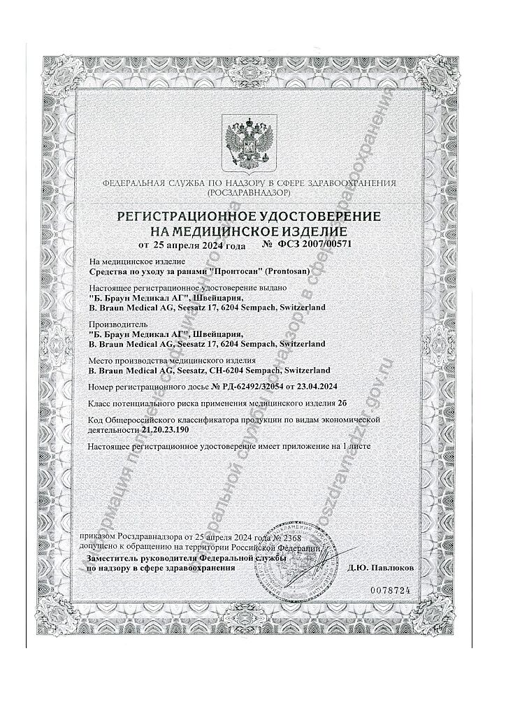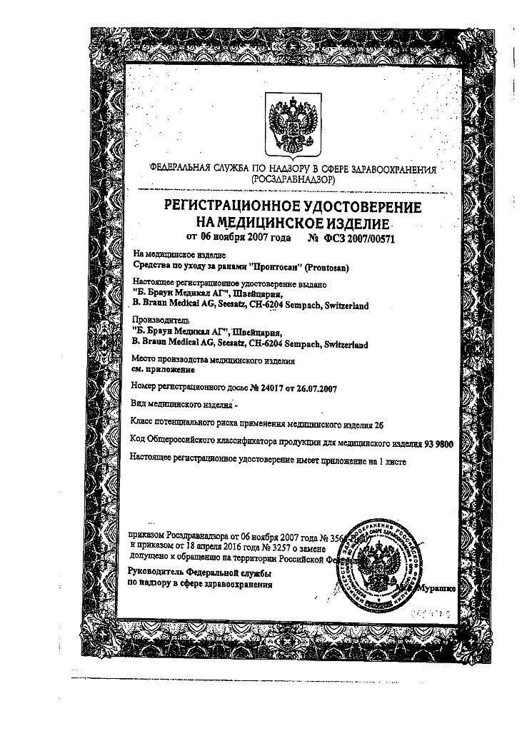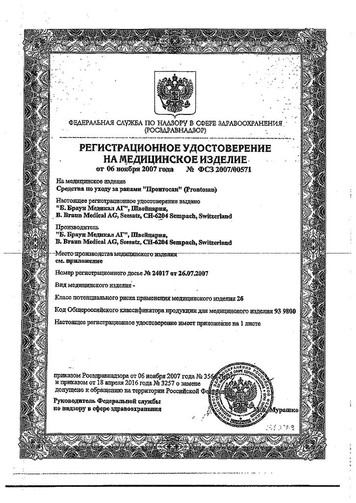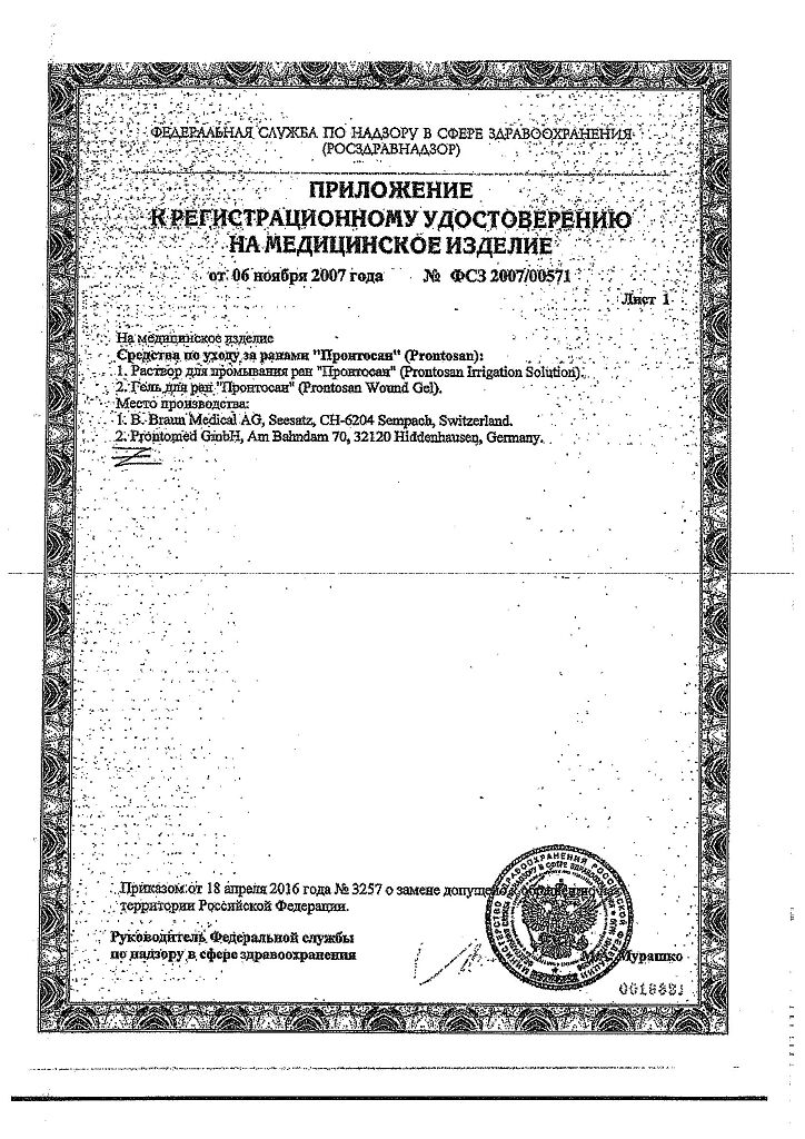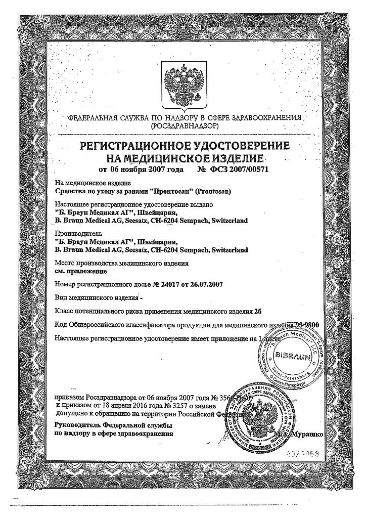 Пронтосан позволяет проводить тщательное очищение раневой поверхности, увлажнять рану и подавлять бактериальную флору, что создает условия для скорейшего раневого заживления. Благодаря антибактериальному компоненту Пронтосан может с успехом использоваться для предупреждения инфицирования ран патогенными микроорганизмами и профилактики развития инфекционных осложнений в ране.