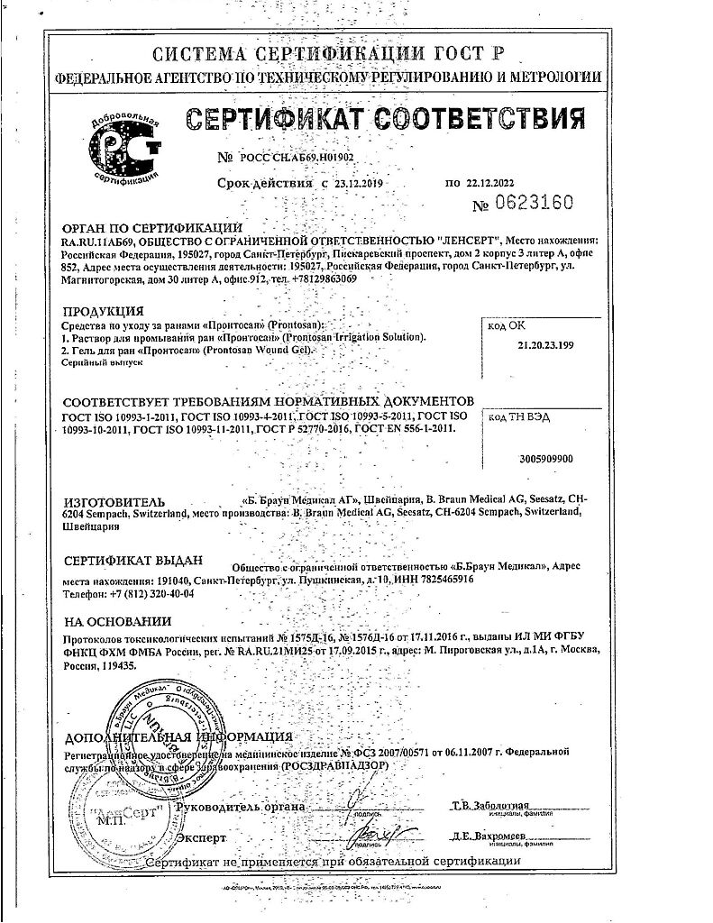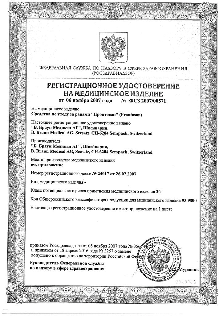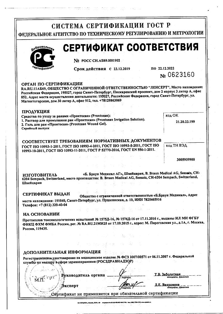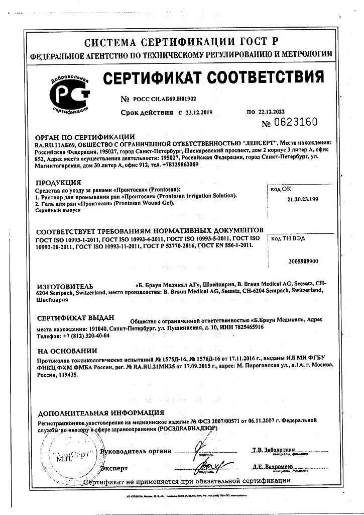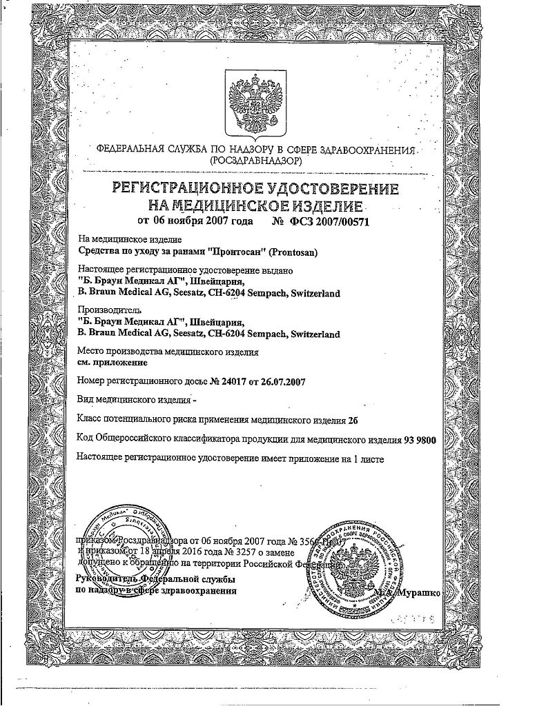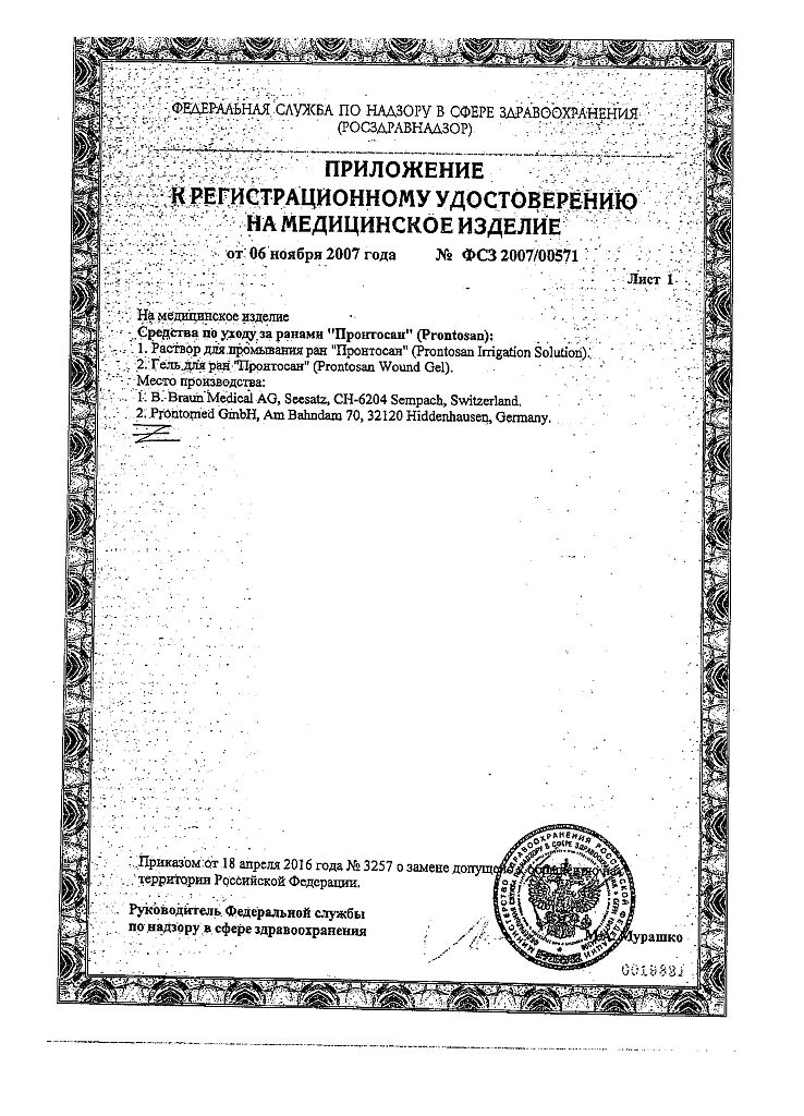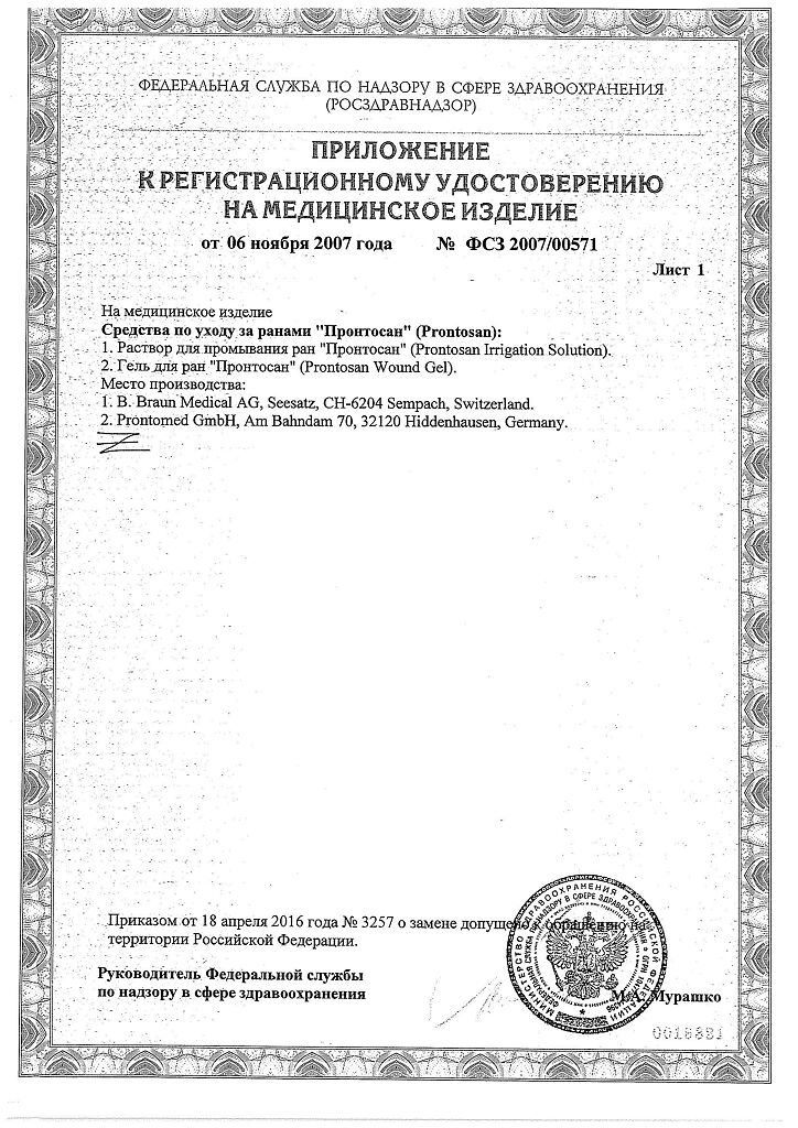 Пронтосан позволяет проводить тщательное очищение раневой поверхности, увлажнять рану и подавлять бактериальную флору, что создает условия для скорейшего раневого заживления. Благодаря антибактериальному компоненту Пронтосан может с успехом использоваться для предупреждения инфицирования ран патогенными микроорганизмами и профилактики развития инфекционных осложнений в ране.