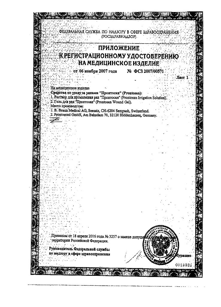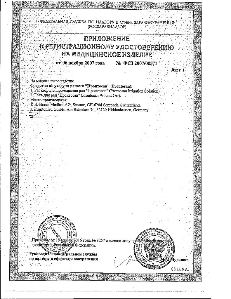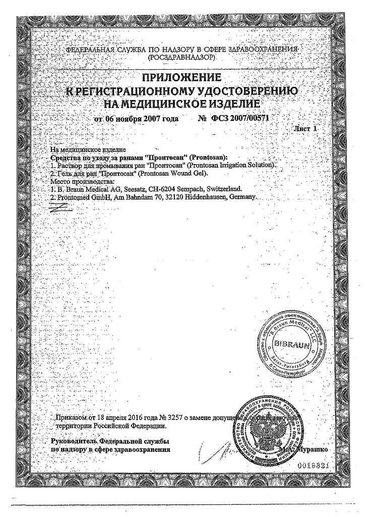 Поверхность раны должна покрываться слоем геля не менее 3 мм толщиной. Пронтосан наносится на рану или вводится в полость раны. Сверху слой геля покрывается двумя-тремя стерильными марлевыми салфетками или другими перевязочными средствами. Пронтосан должен оставаться на ране до следующей перевязки. Перевязки делаются ежедневно. По мере очищения раны от некротических тканей перевязки можно делать через день.
