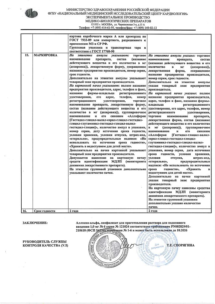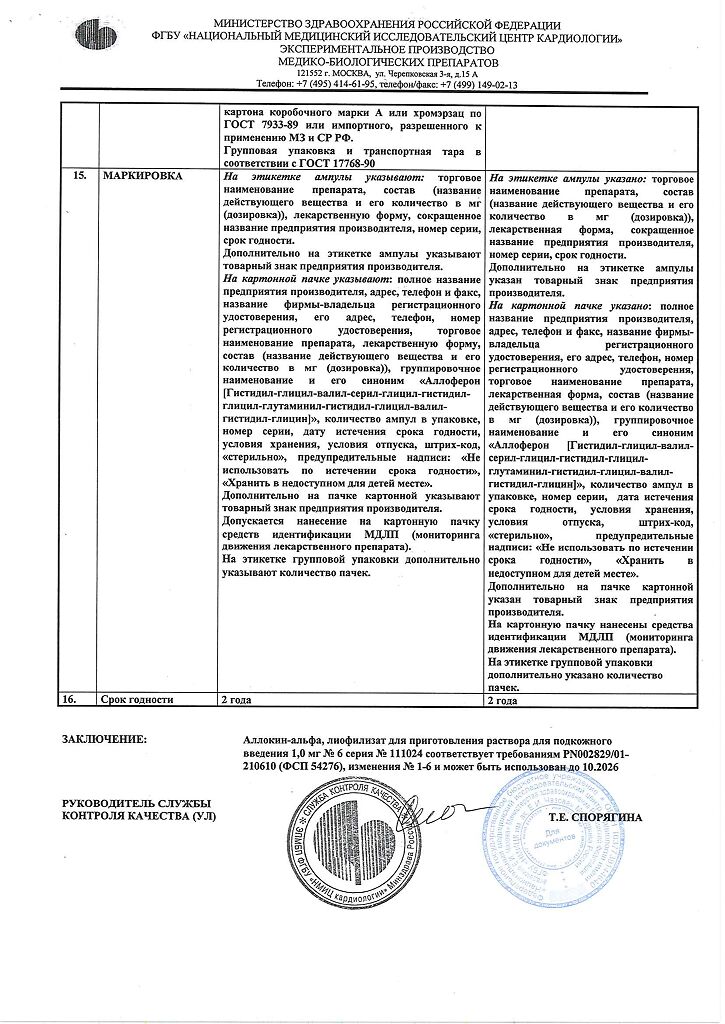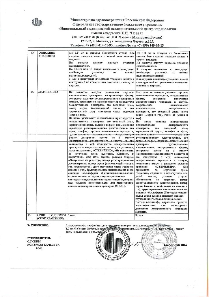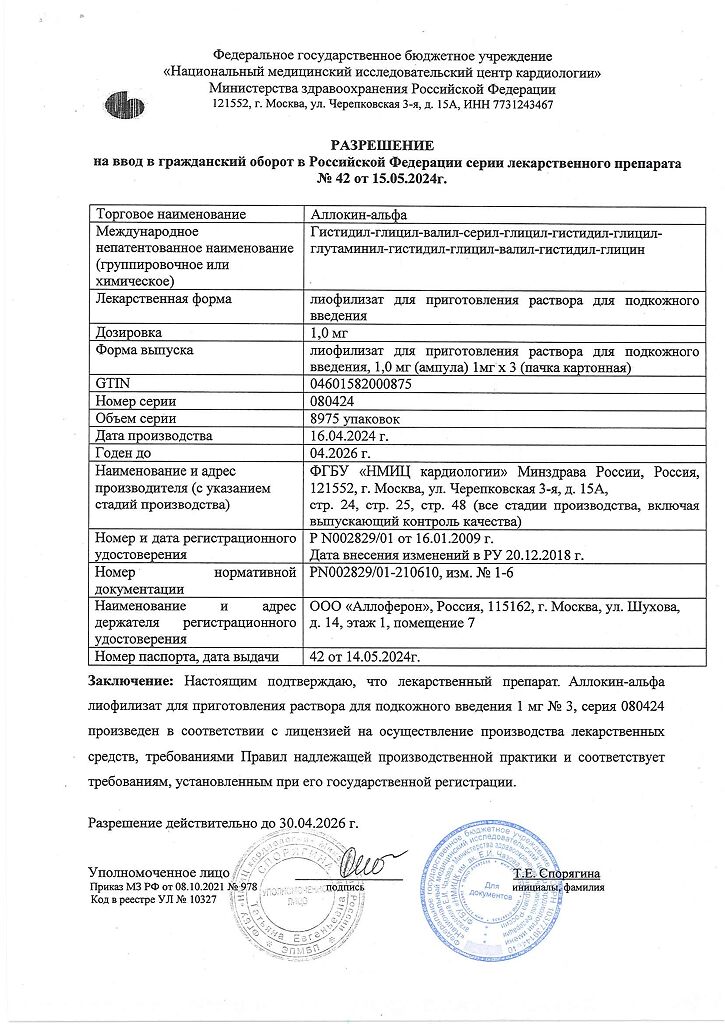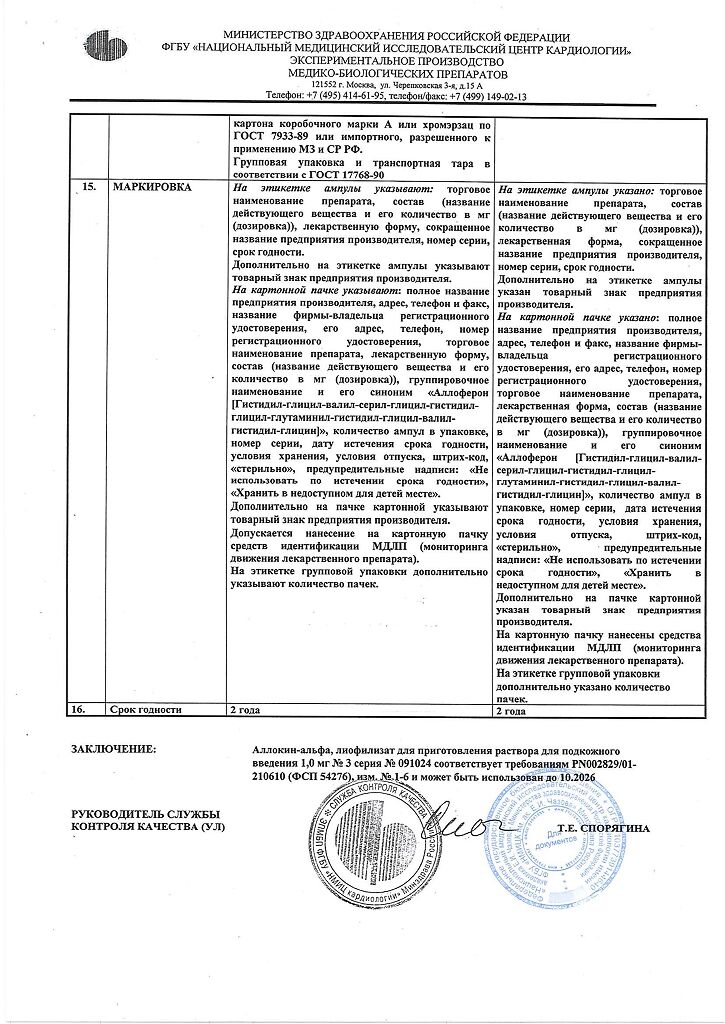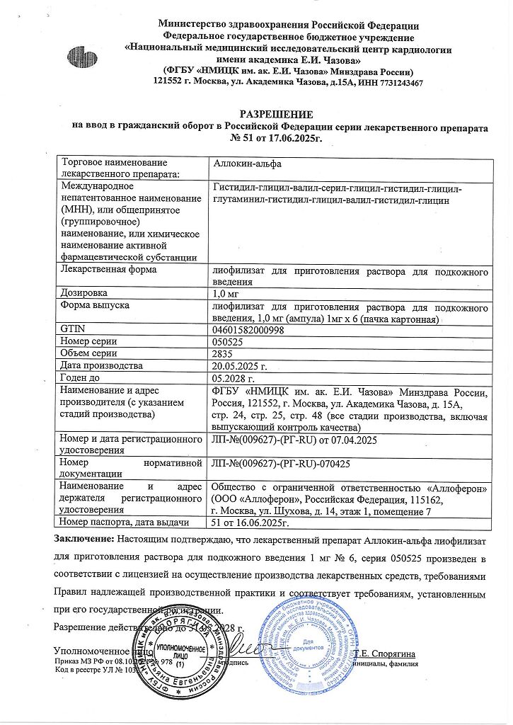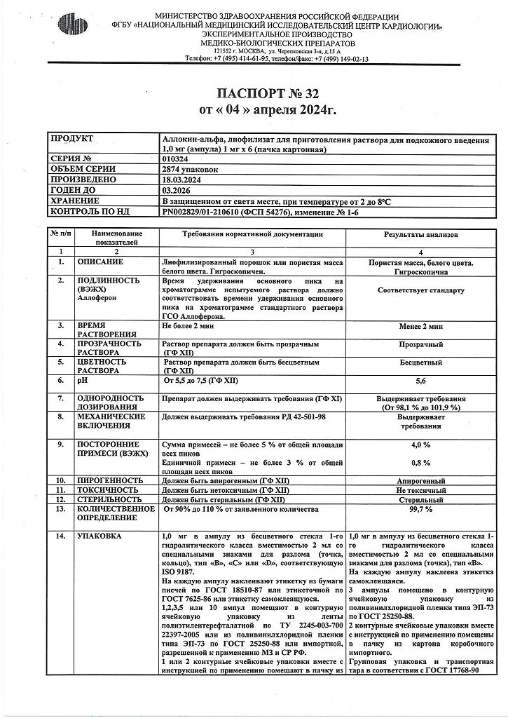 Аллоферон представляет собой олигопептид. По характеру фармакологического действия наиболее сходен с интерфероном альфа. Аллоферон является эффективным индуктором синтеза эндогенных интерферонов и активатором системы естественных киллеров, способен стимулировать распознавание и лизис дефектных клеток цитотоксическими лимфоцитами. В экспериментах продемонстрирована высокая эффективность в отношении инфекций, вызываемых вирусами гриппа А и В, гепатита В и С, герпеса 1 и 2 типов и папилломы человека. Аллоферон не обладает общей токсичностью, аллергенными свойствами, мутагенным и канцерогенным действием, не оказывает эмбриотоксического действия и не влияет на репродуктивную функцию.