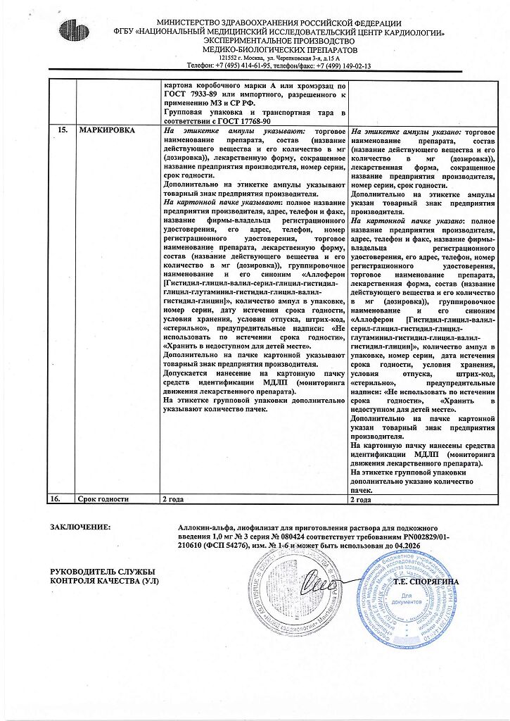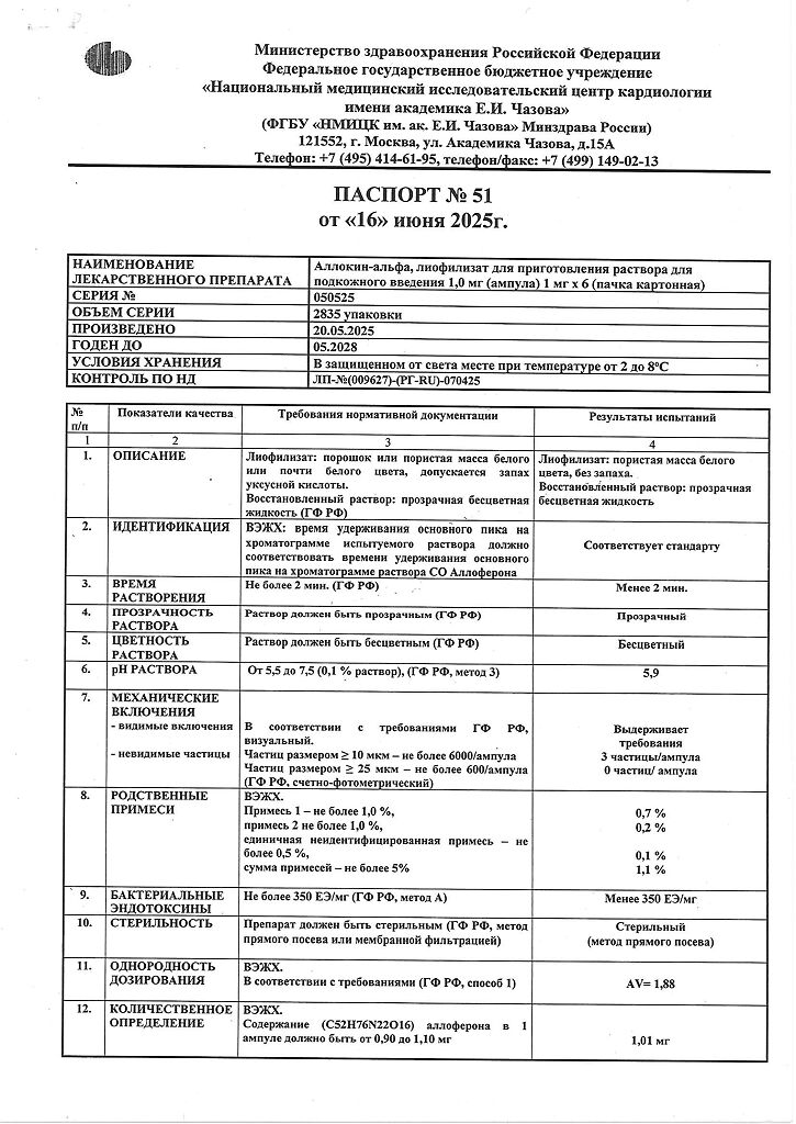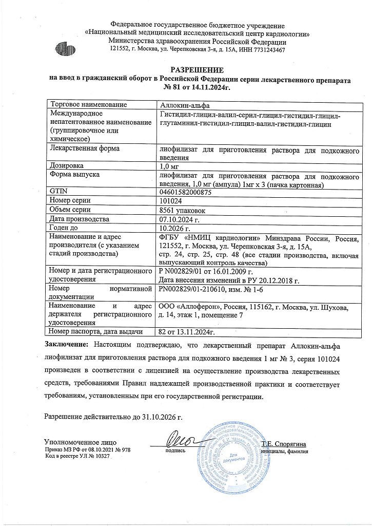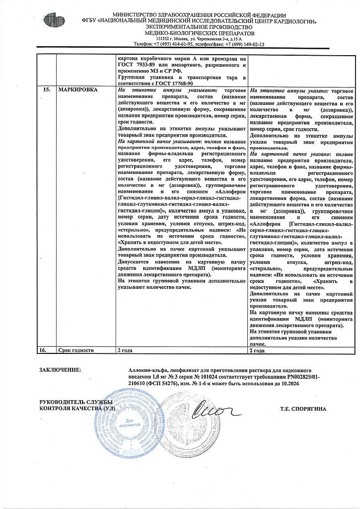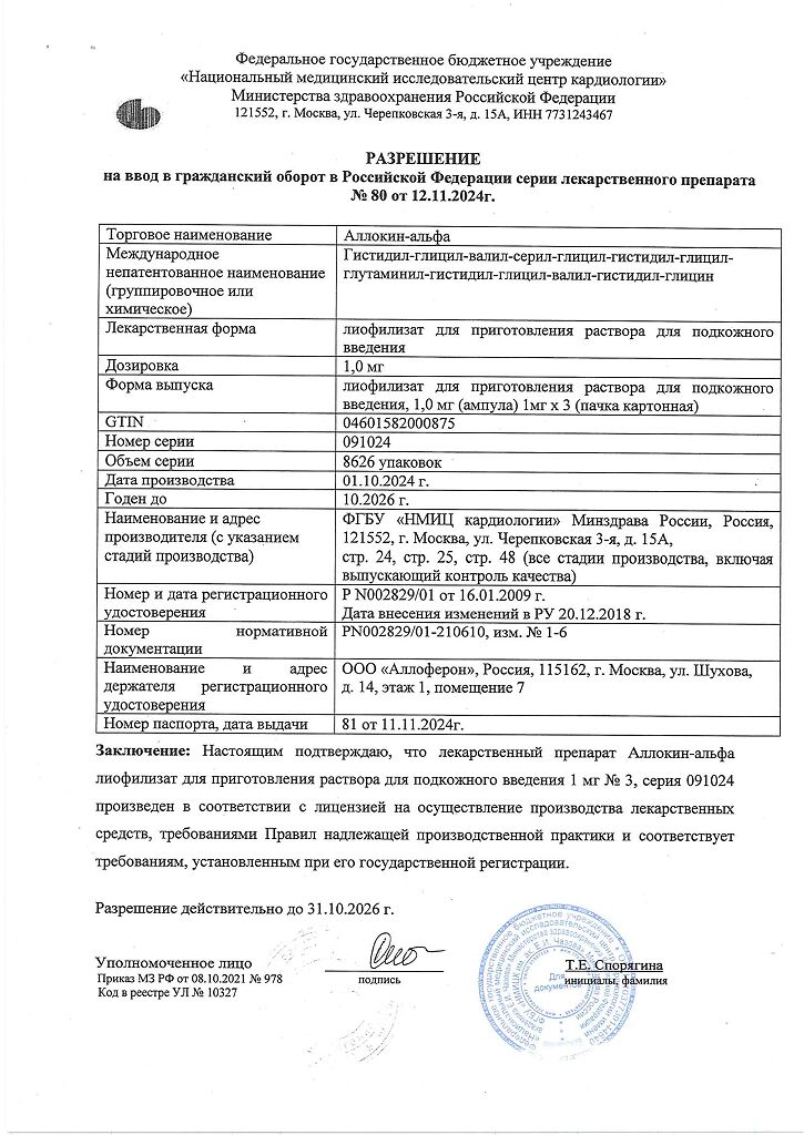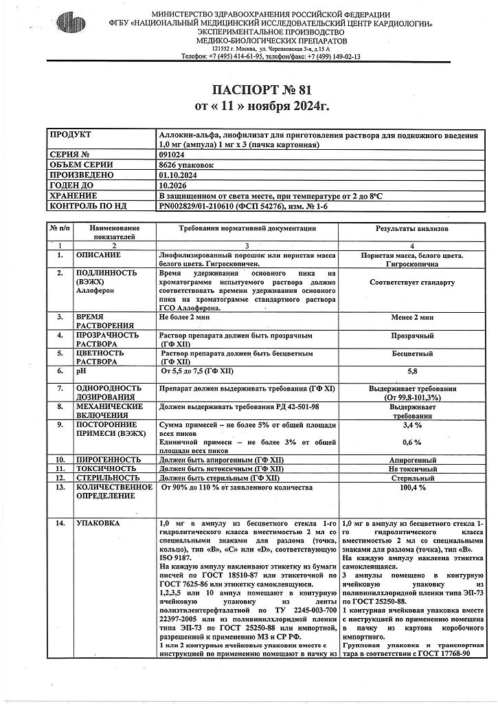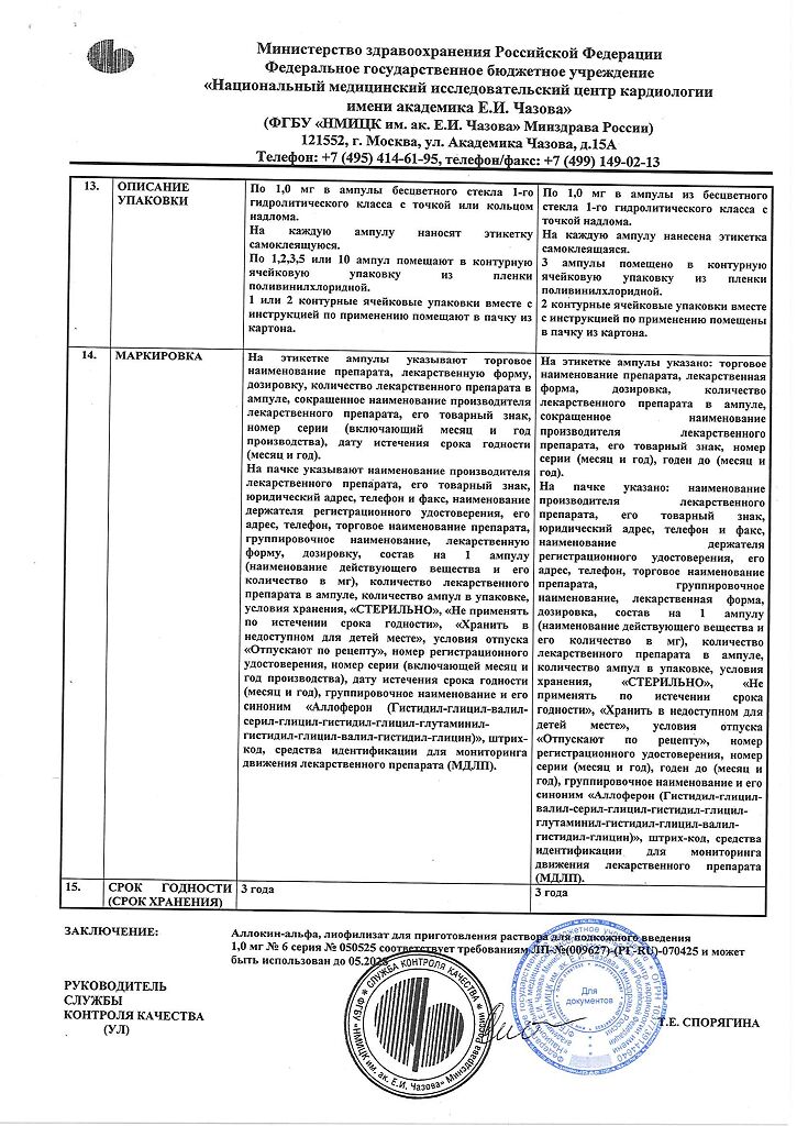 Аллоферон представляет собой олигопептид. По характеру фармакологического действия наиболее сходен с интерфероном альфа. Аллоферон является эффективным индуктором синтеза эндогенных интерферонов и активатором системы естественных киллеров, способен стимулировать распознавание и лизис дефектных клеток цитотоксическими лимфоцитами. В экспериментах продемонстрирована высокая эффективность в отношении инфекций, вызываемых вирусами гриппа А и В, гепатита В и С, герпеса 1 и 2 типов и папилломы человека. Аллоферон не обладает общей токсичностью, аллергенными свойствами, мутагенным и канцерогенным действием, не оказывает эмбриотоксического действия и не влияет на репродуктивную функцию.