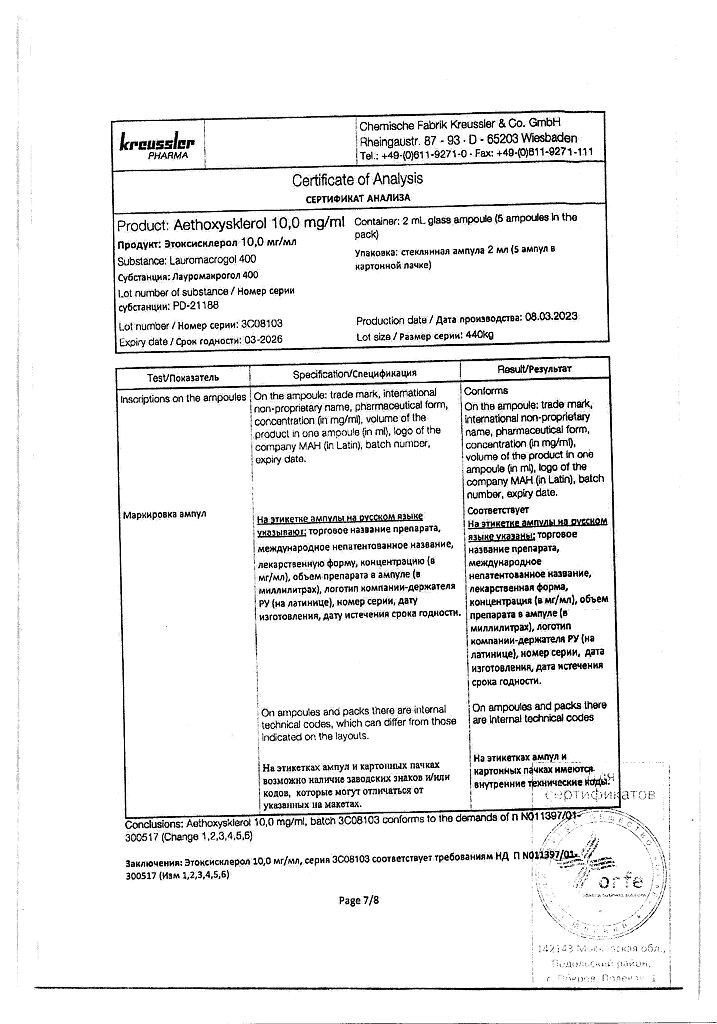 Этоксисклерол оказывает веносклерозирующее, местноанестезирующее действие. Повреждает эндотелий сосудов, вызывая денатурацию белков, стимулирует быстрое образование тромба и его организацию в течение 7 дней. Этоксисклерол снижает возбудимость нервных окончаний и проводимость болевого импульса, обеспечивая безболезненность склеротерапии.