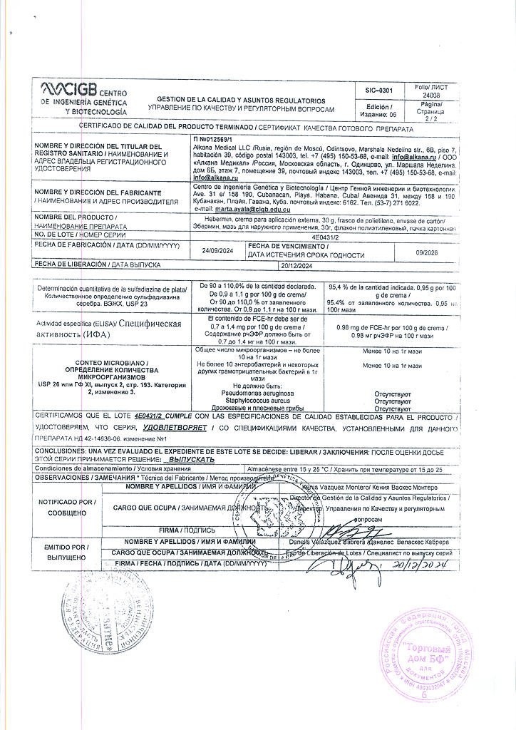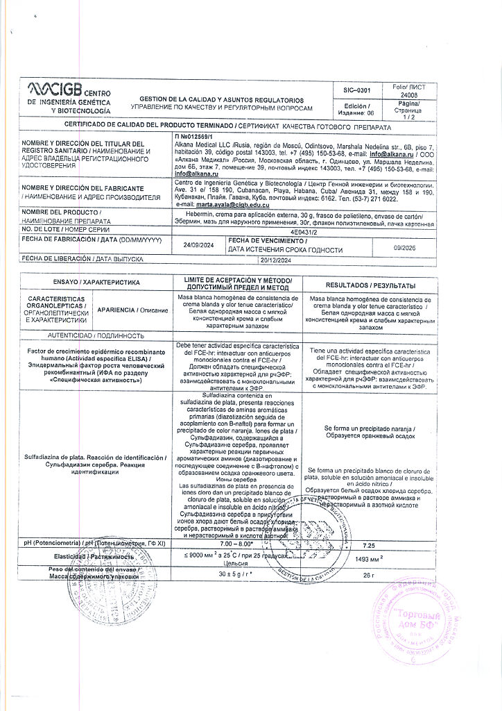 действующие вещества :эпидермальный фактор роста человеческий рекомбинантный 1 мг, сульфадиазин серебра 1 г,