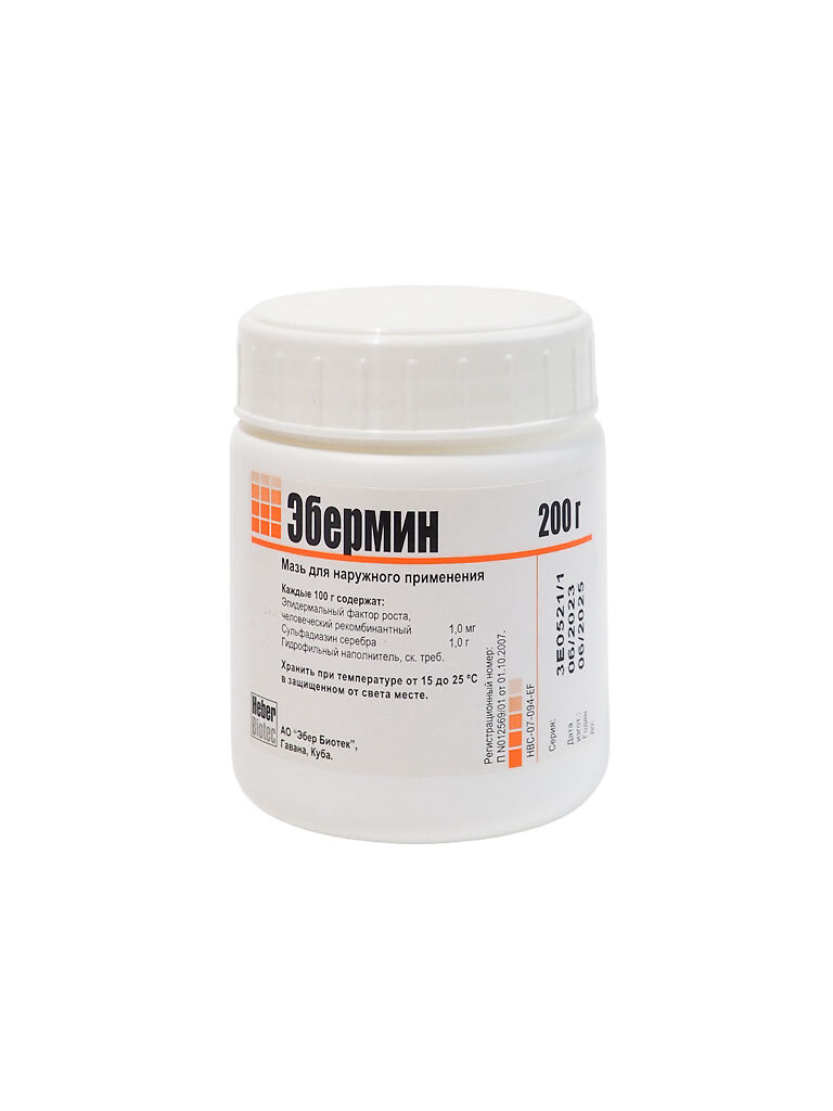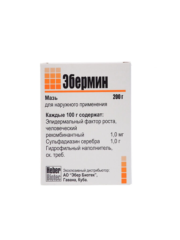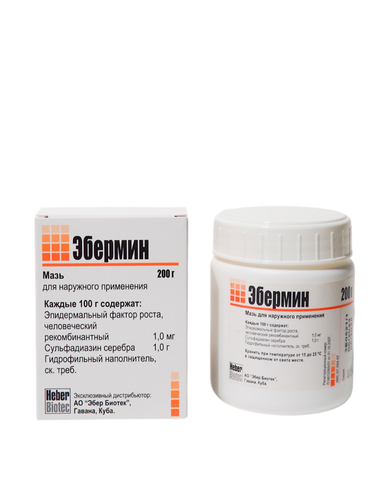 Гидрофильная основа мази обеспечивает умеренный дегидратирующий эффект, уменьшает болевые ощущения, создает и поддерживает необходимые терапевтические концентрации действующих веществ в очаге поражения. Эбермин обладает косметическим эффектом, обеспечивает эстетику рубца за счет нормализации ориентации и вызревания коллагеновых волокон, предупреждая патологическое рубцевание.