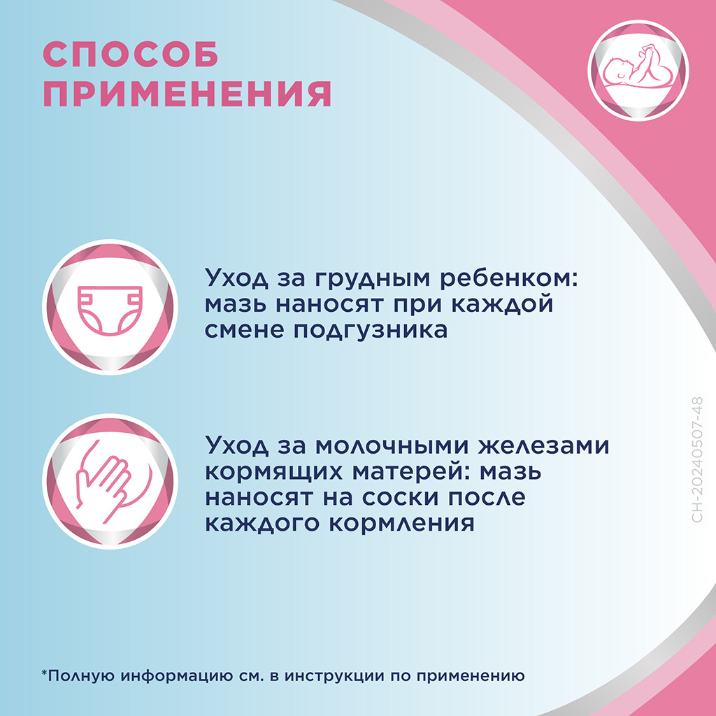 Кормящим матерям смазывать поверхность соска мазью после каждого кормления грудью.