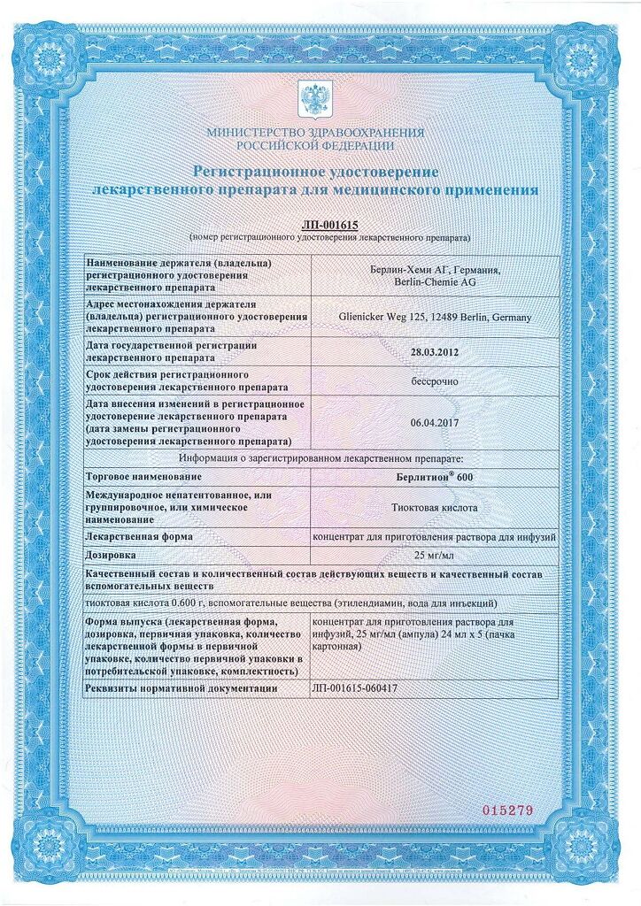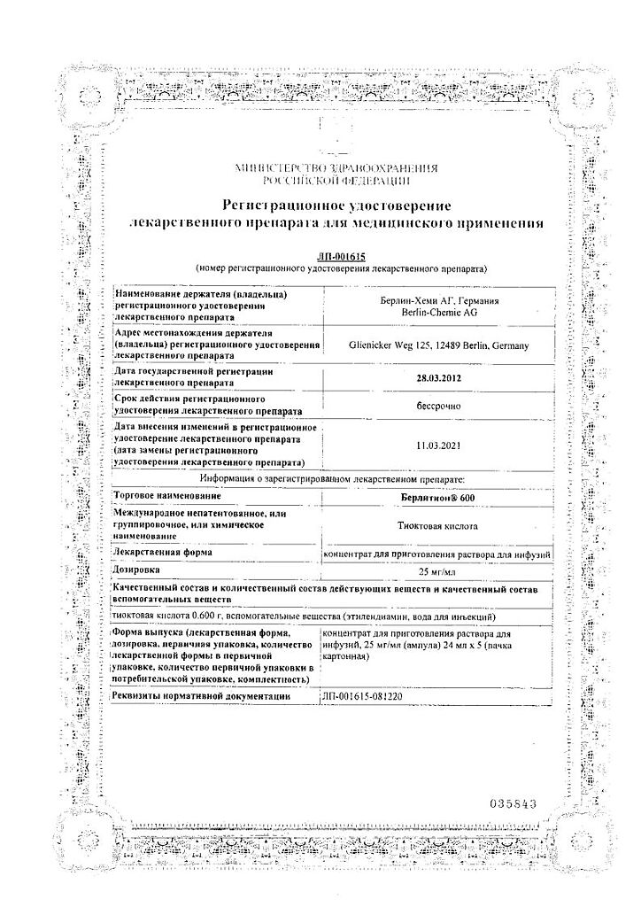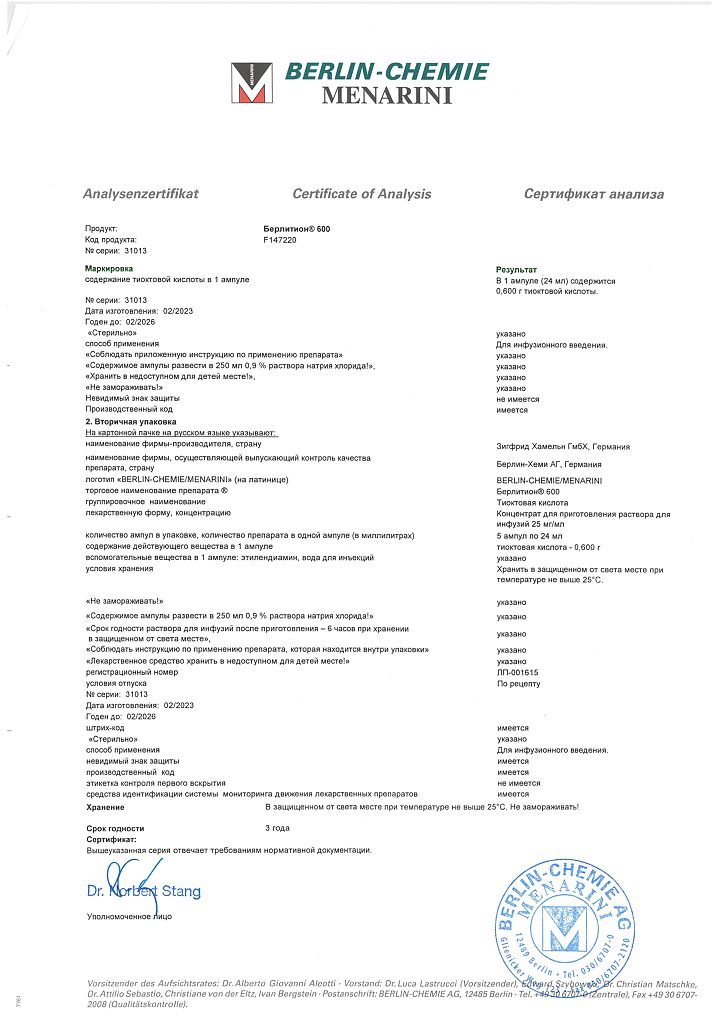 В начале лечения препарат Берлитион 600 назначают в/в капельно в суточной дозе 600 мг (1 ампула).
