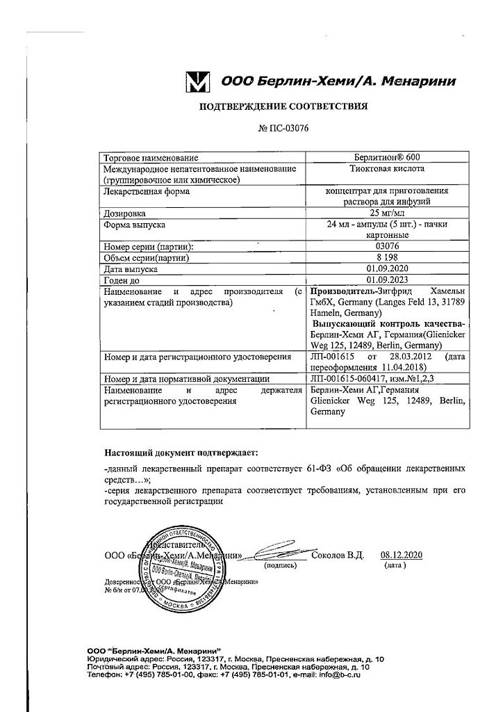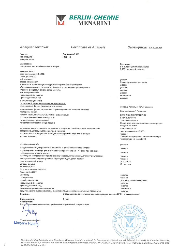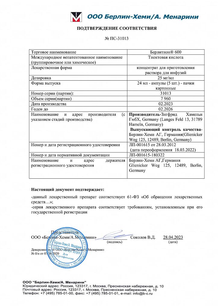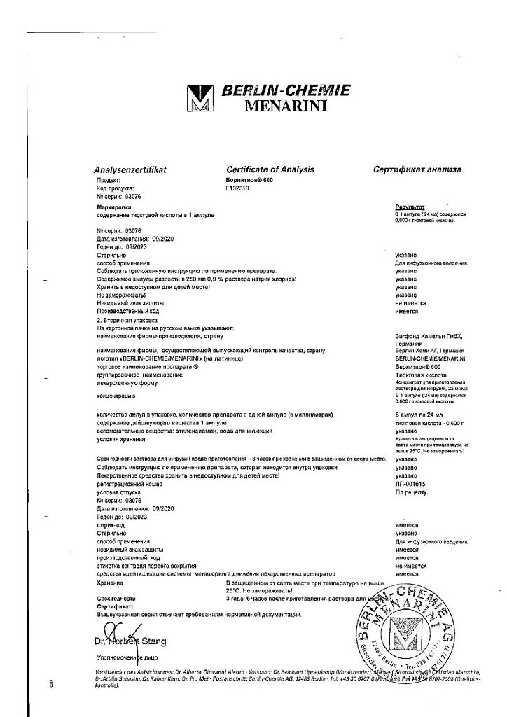 Растворителем для препарата Берлитион 600 может служить только 0,9% раствор натрия хлорида. Свежеприготовленный раствор для инфузий необходимо защищать от воздействия света, например, с помощью алюминиевой фольги.