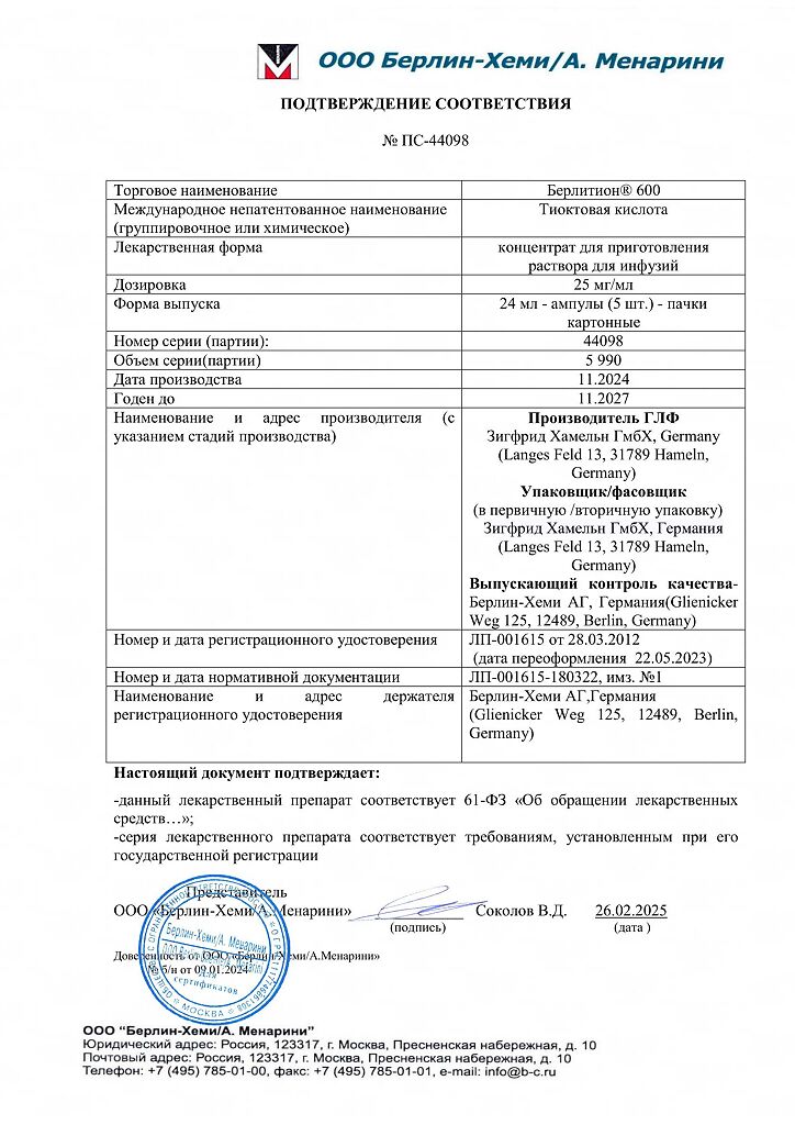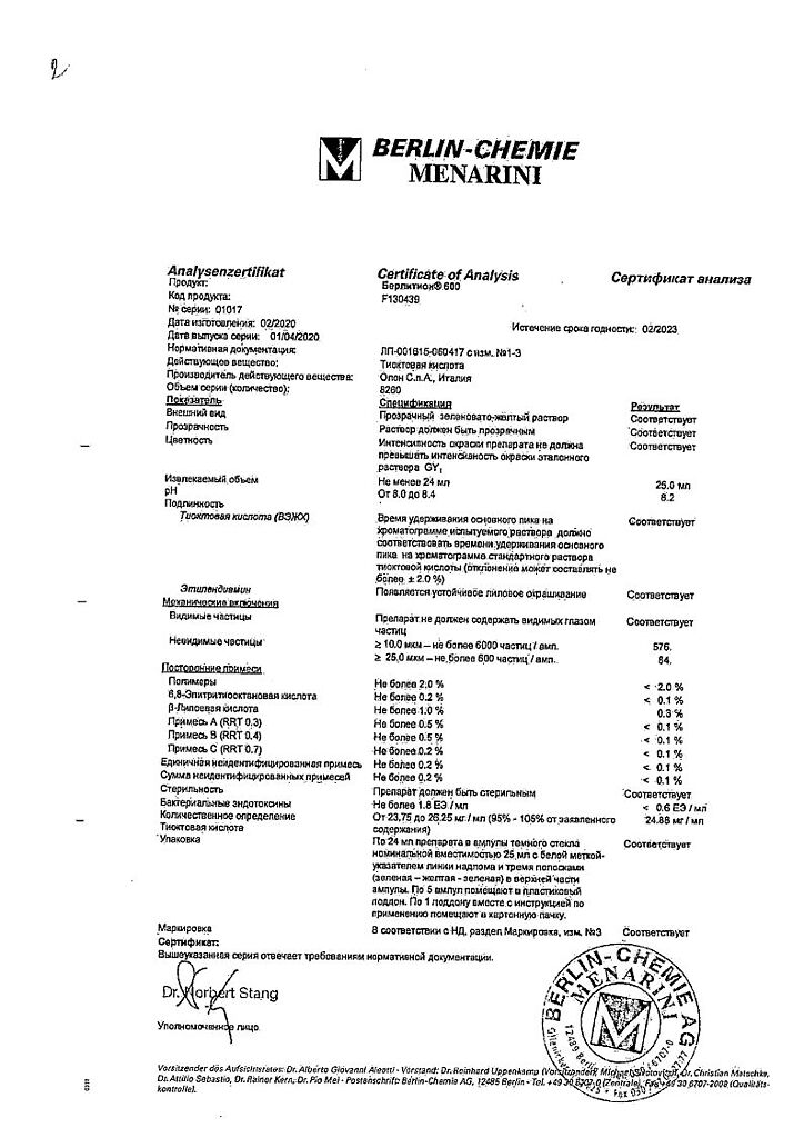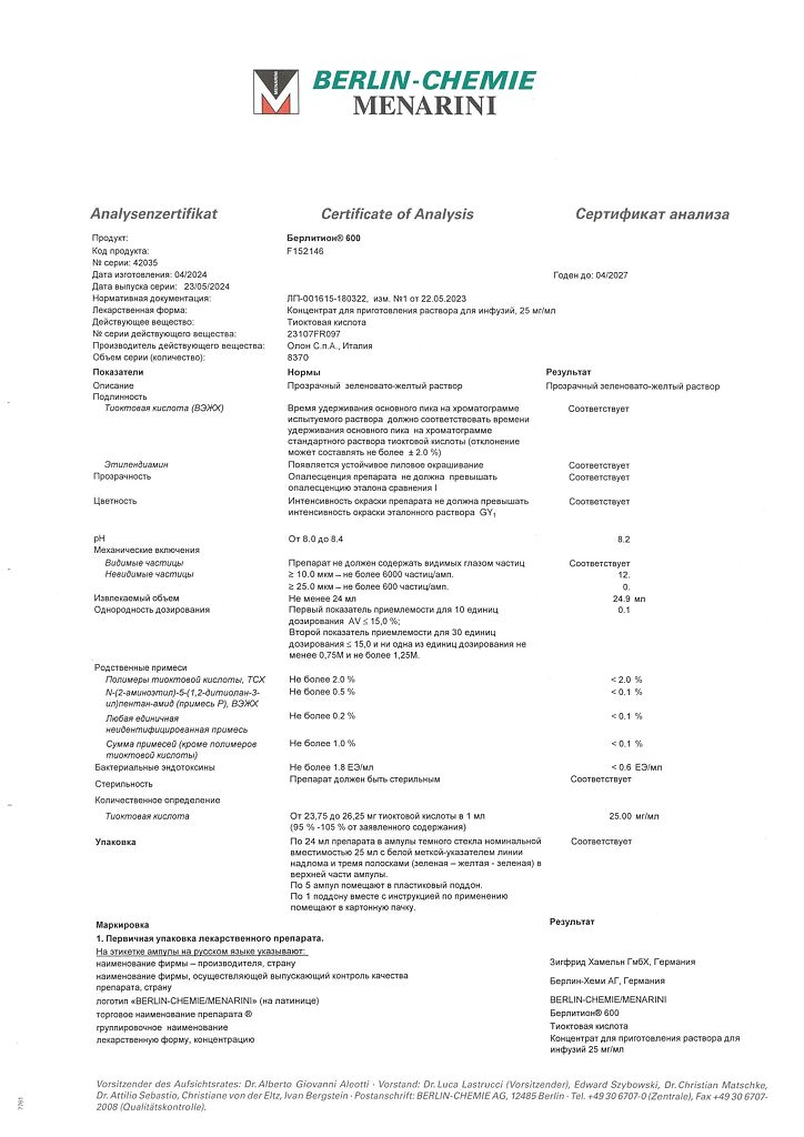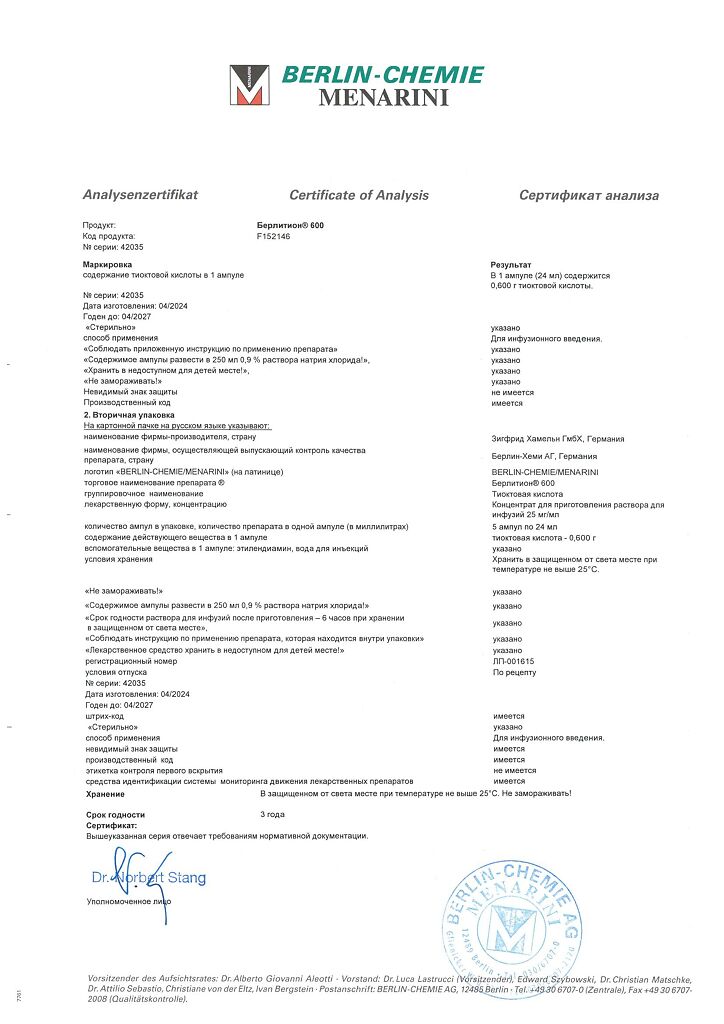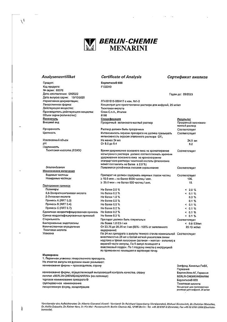 Действующие вещества: тиоктовая кислота 25 мг 600 мг.