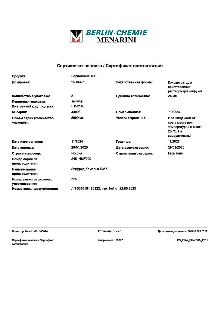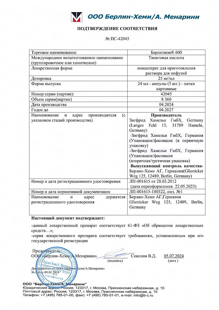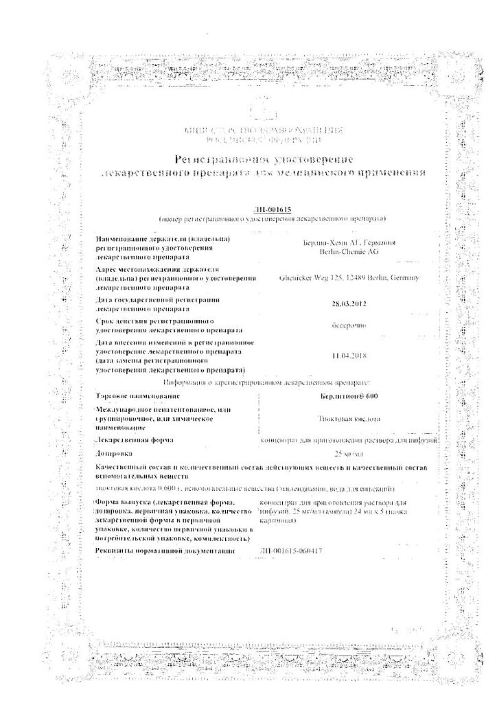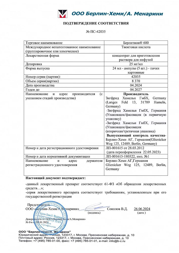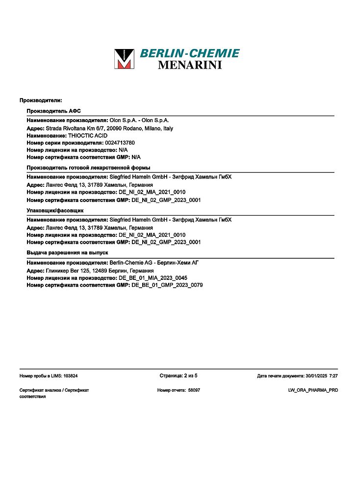Действующие вещества: тиоктовая кислота 25 мг 600 мг.