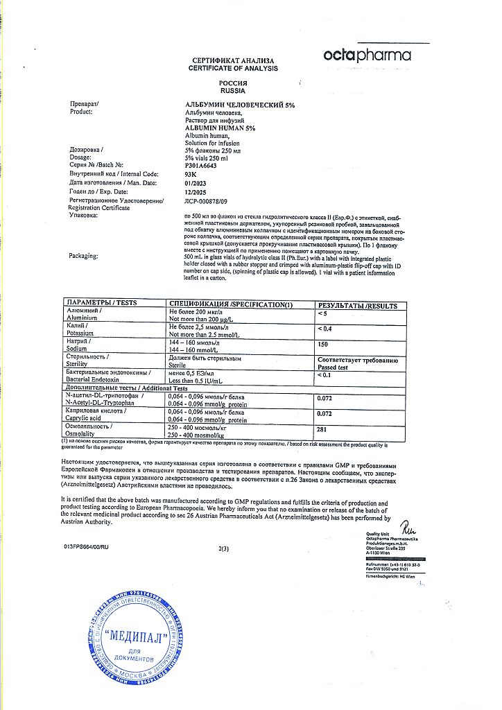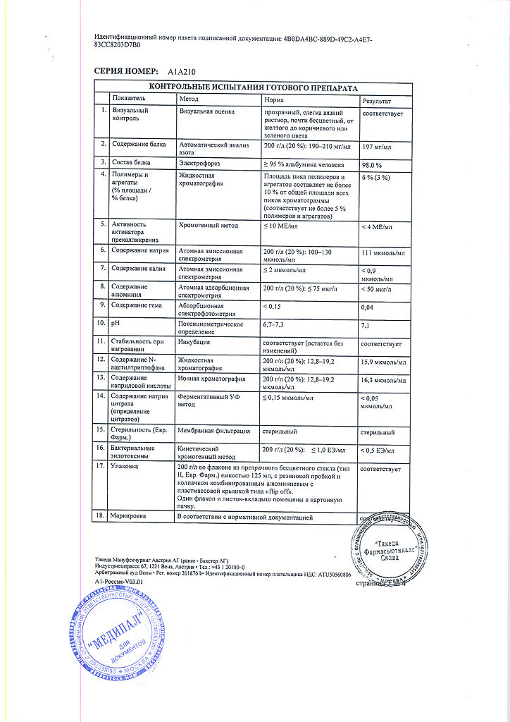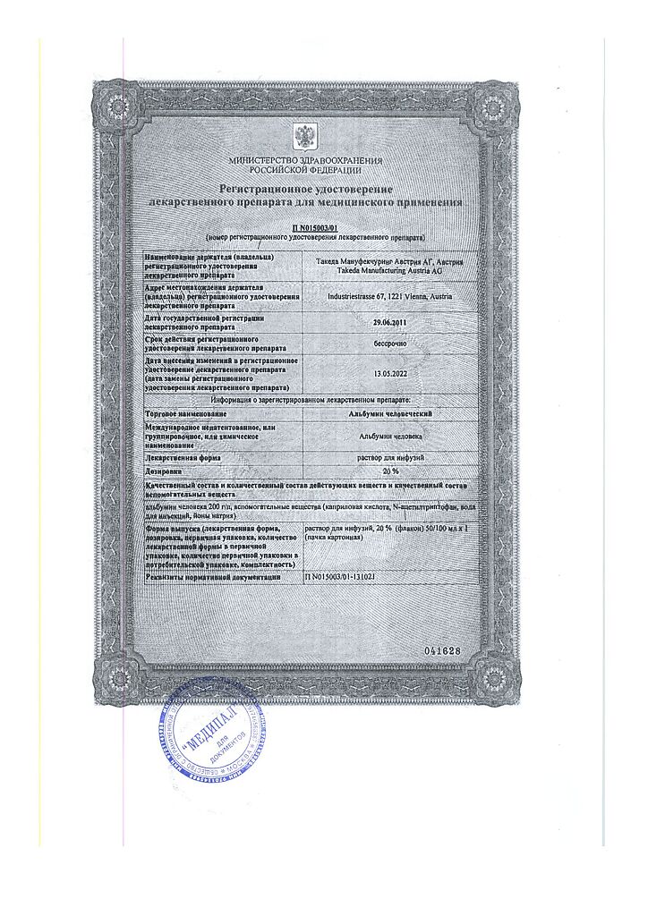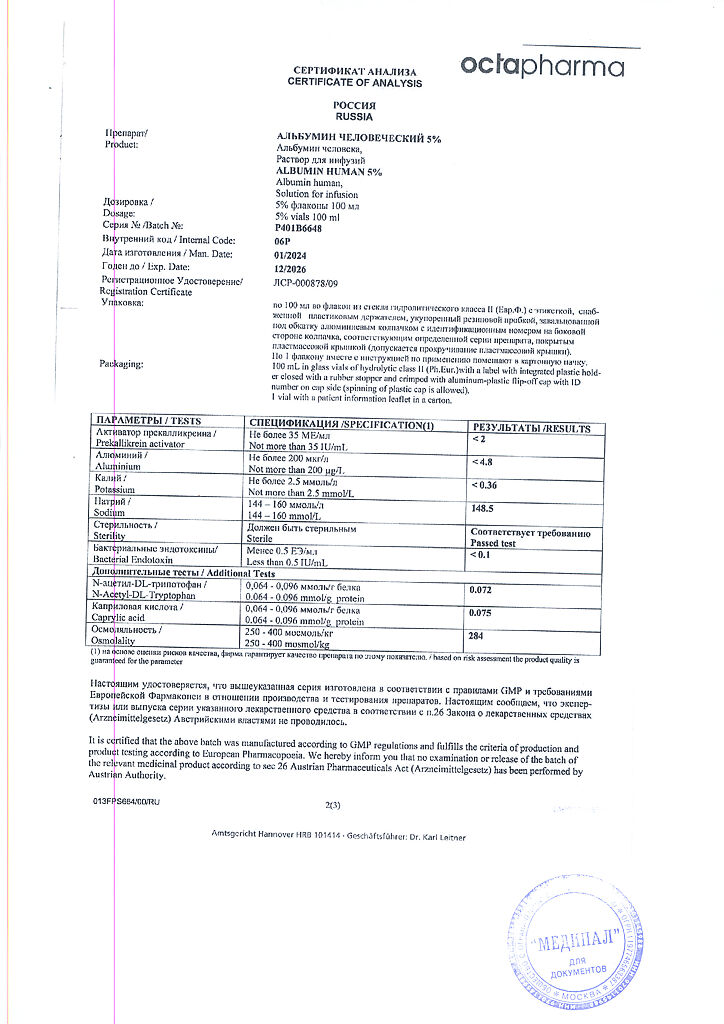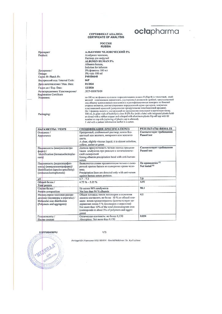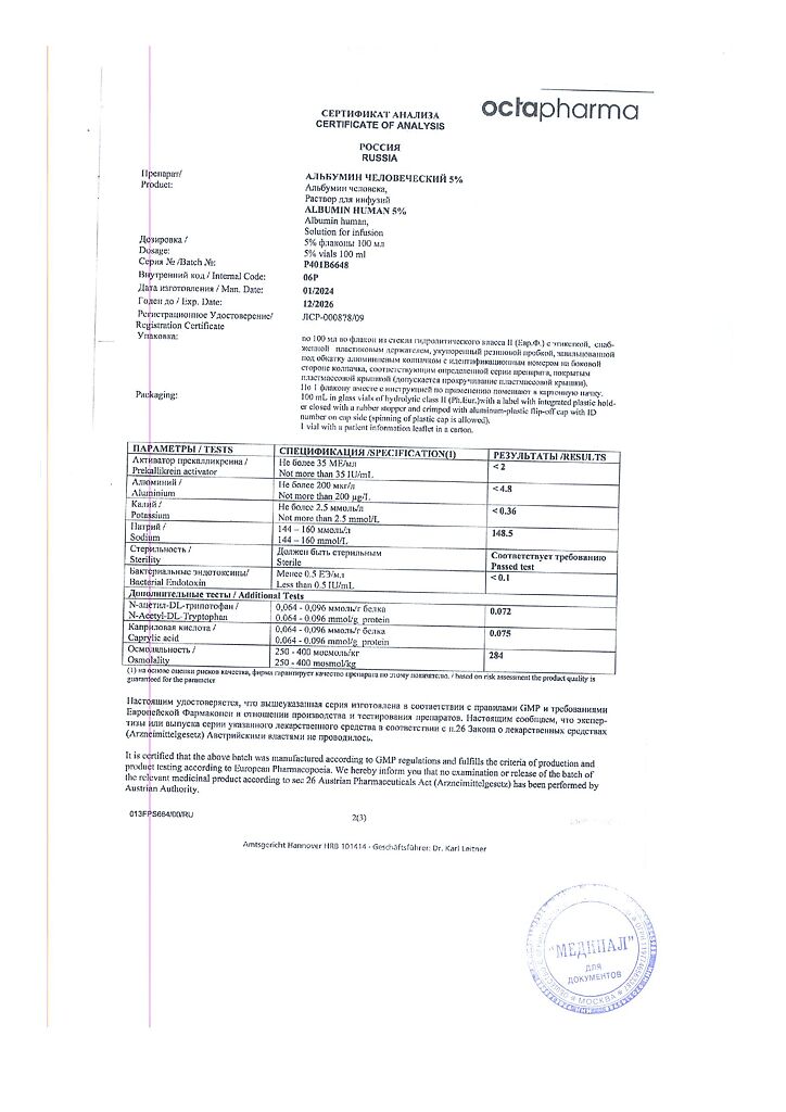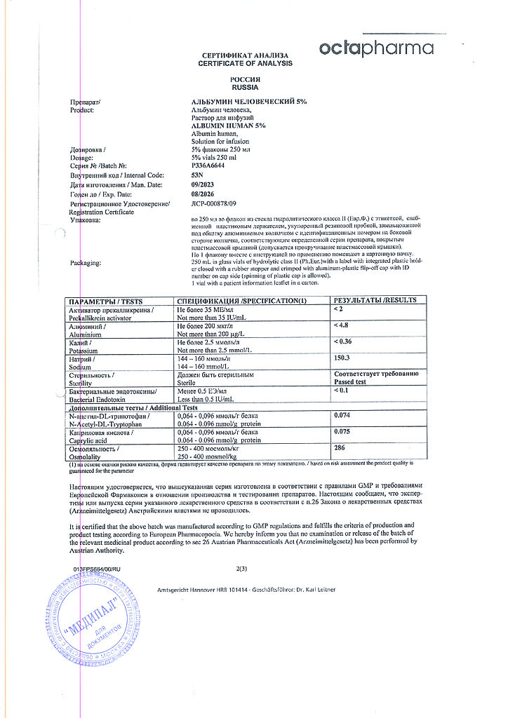 Не было сообщений о передаче вирусов с растворами альбумина, произведенными общепринятыми методами в соответствии со спецификациями Европейской Фармакопеи.