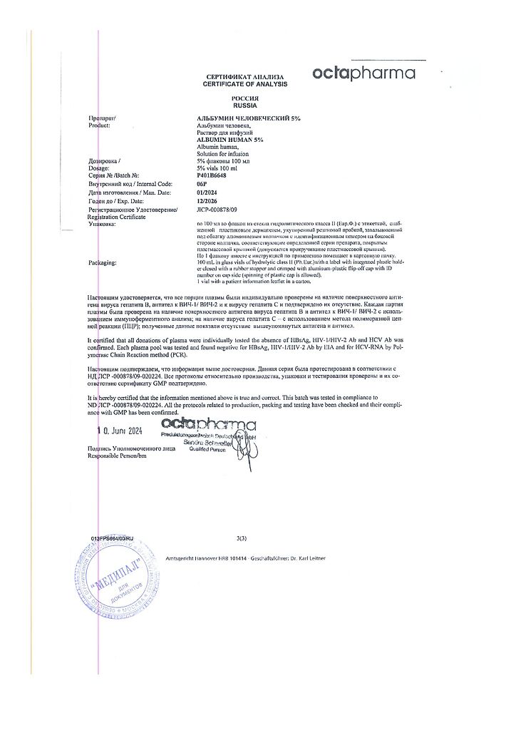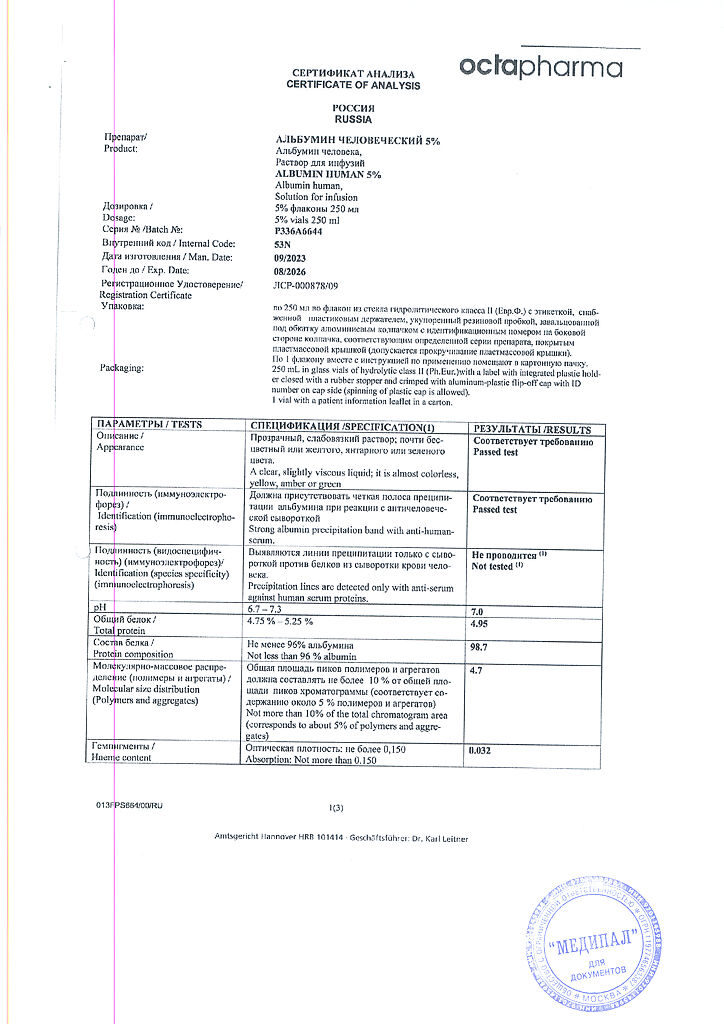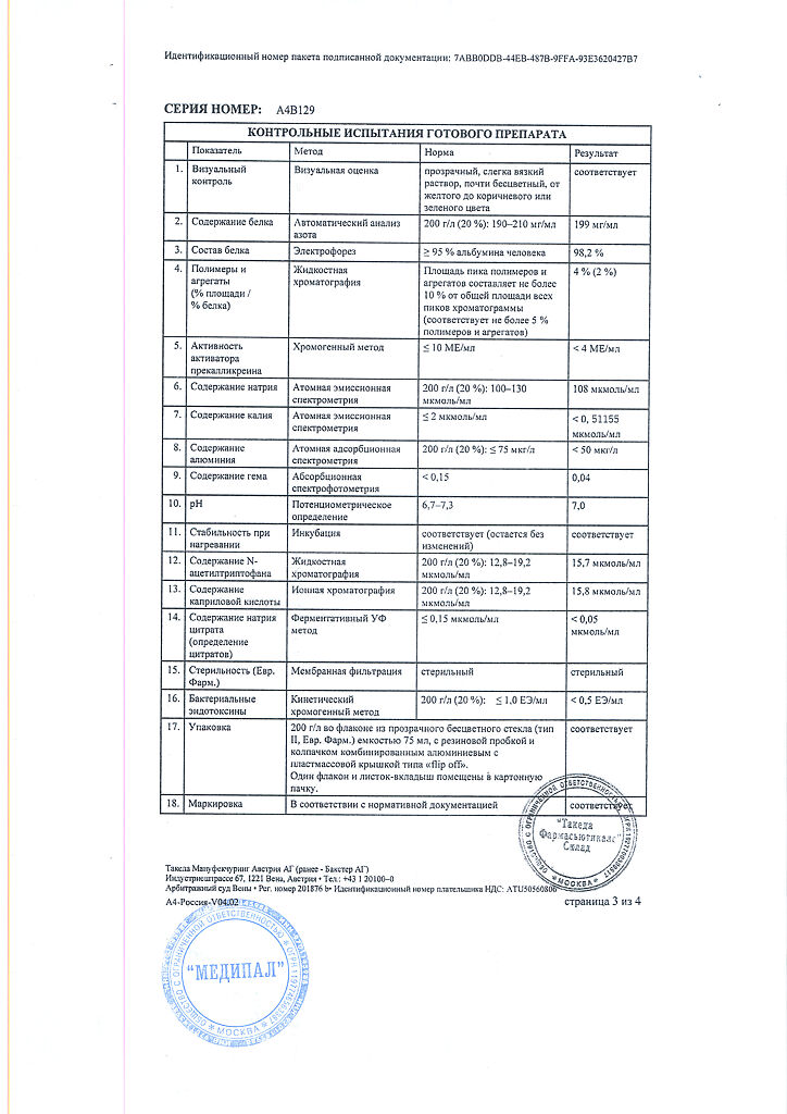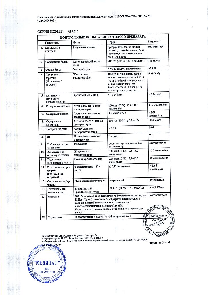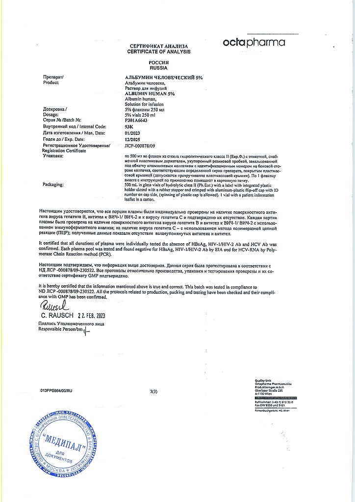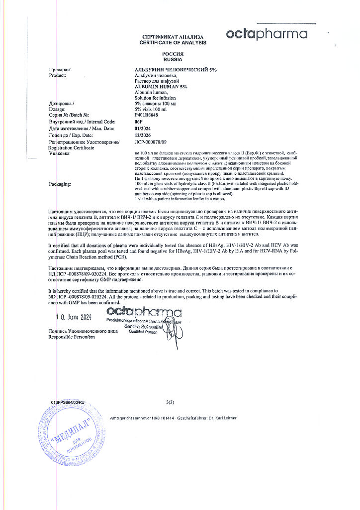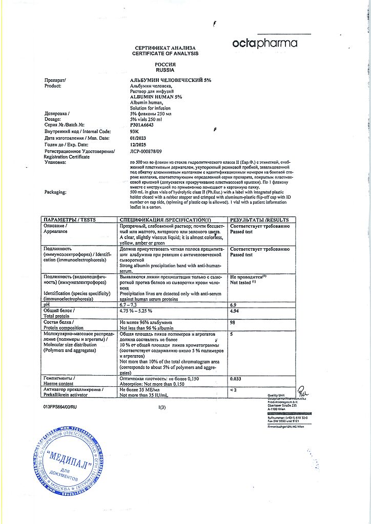Не было сообщений о передаче вирусов с растворами альбумина, произведенными общепринятыми методами в соответствии со спецификациями Европейской Фармакопеи.