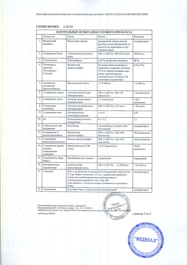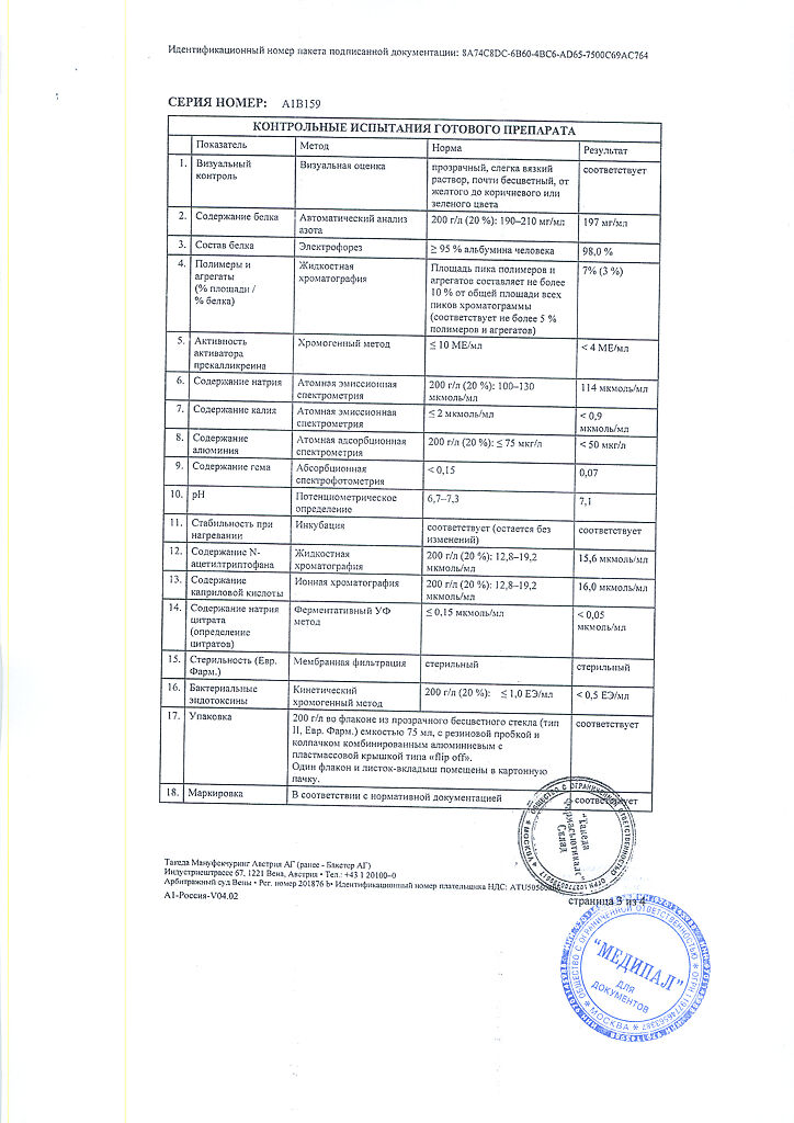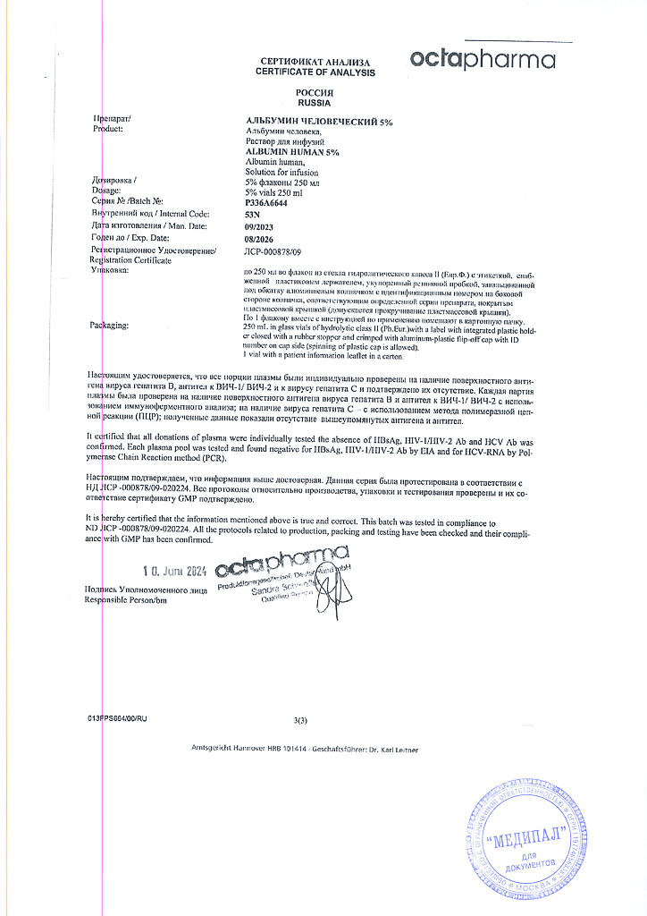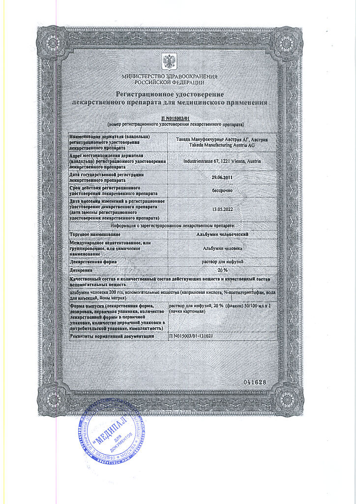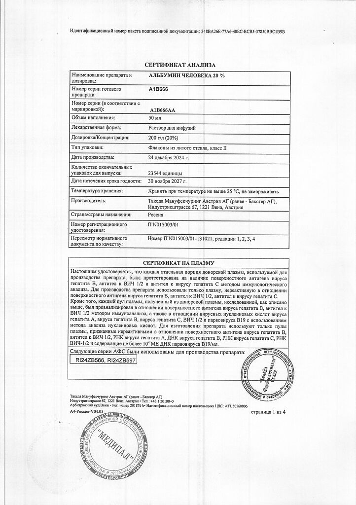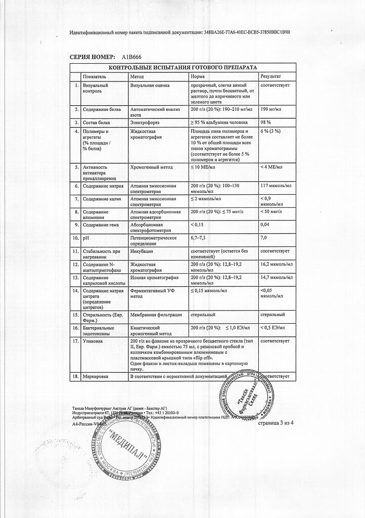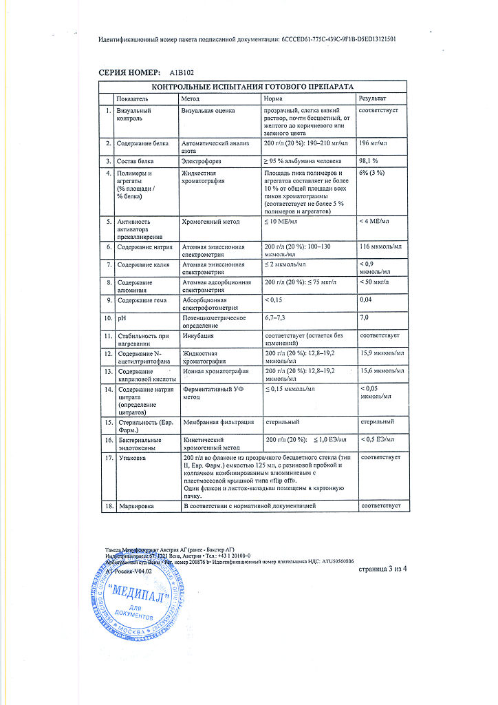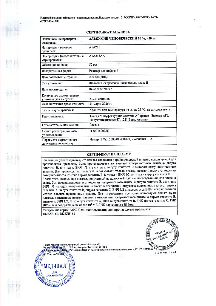 Не было сообщений о передаче вирусов с растворами альбумина, произведенными общепринятыми методами в соответствии со спецификациями Европейской Фармакопеи.