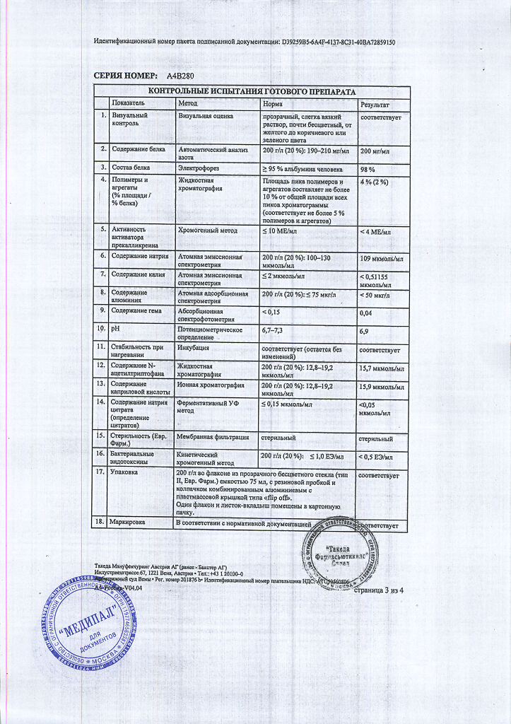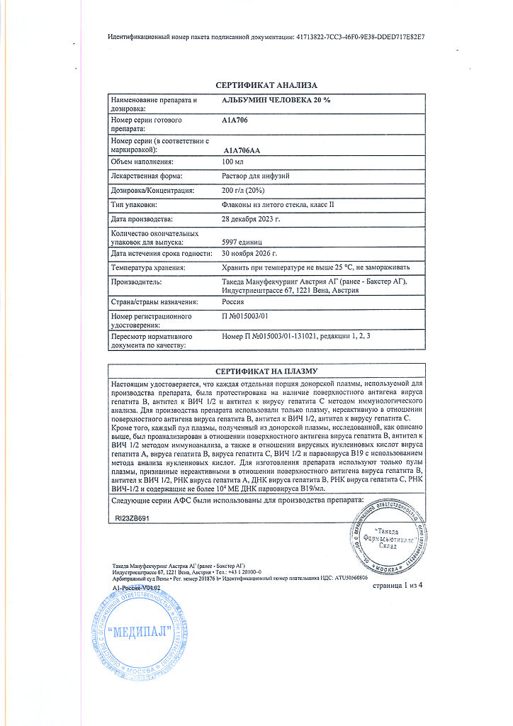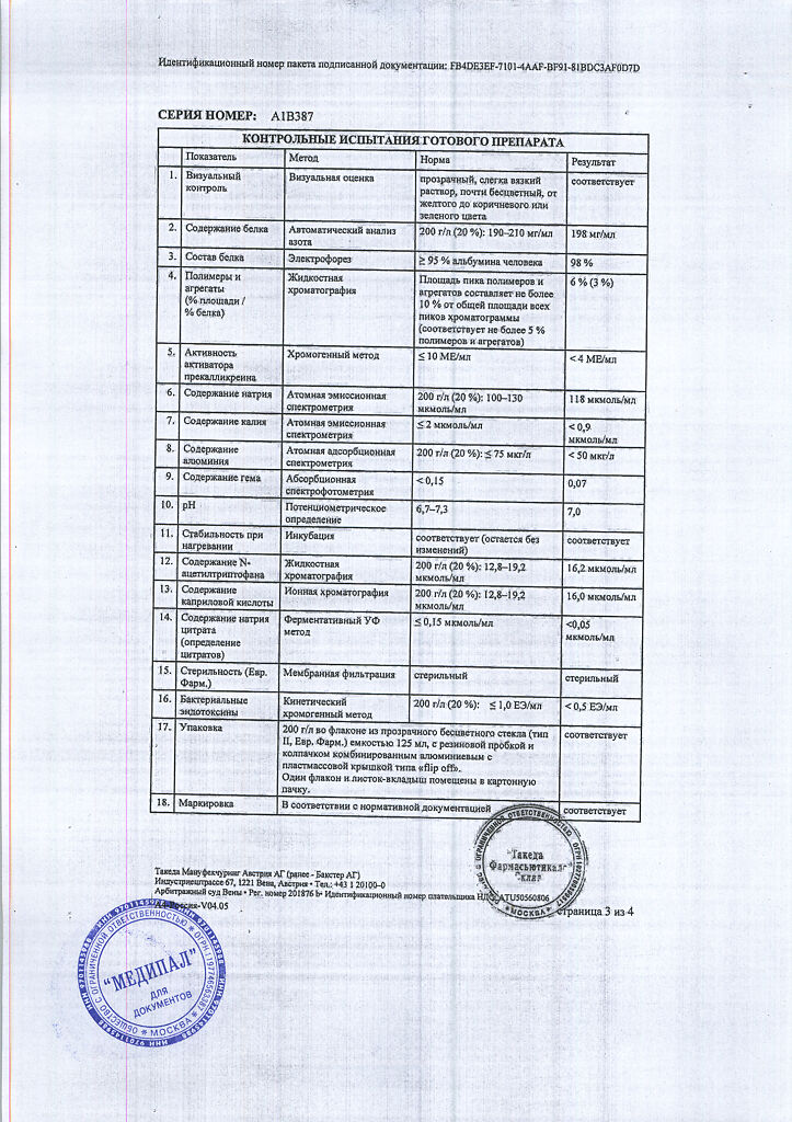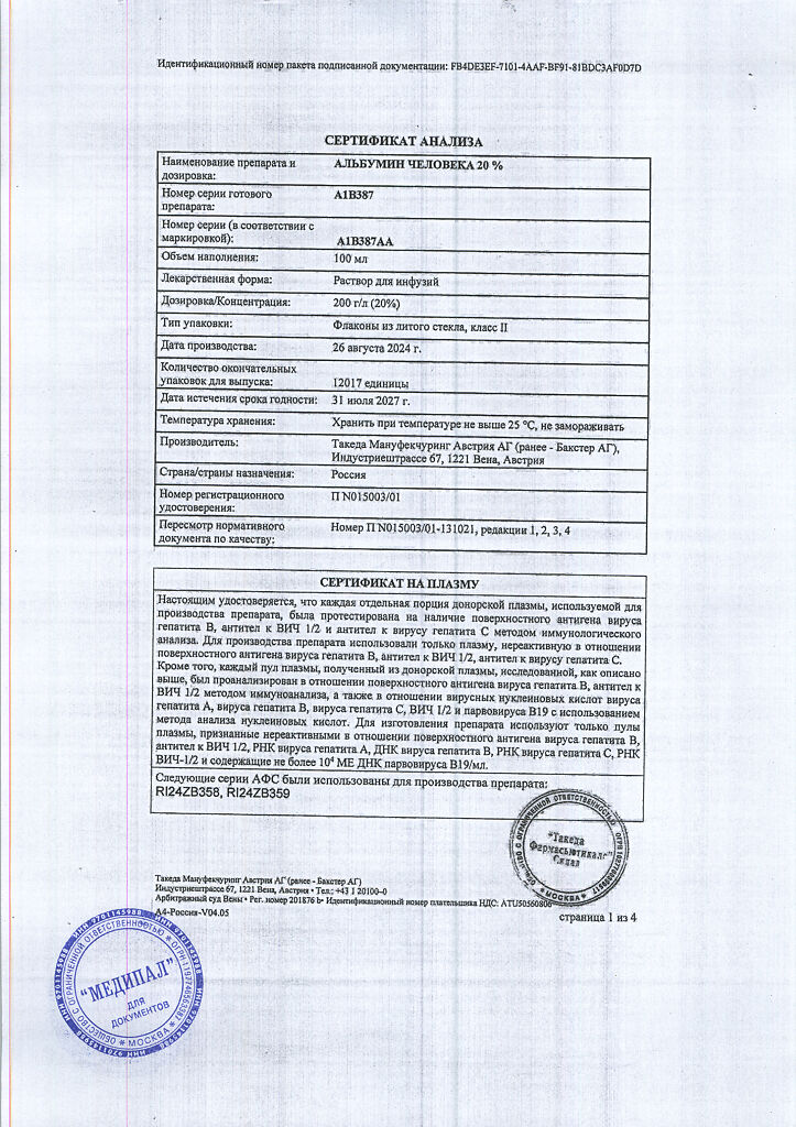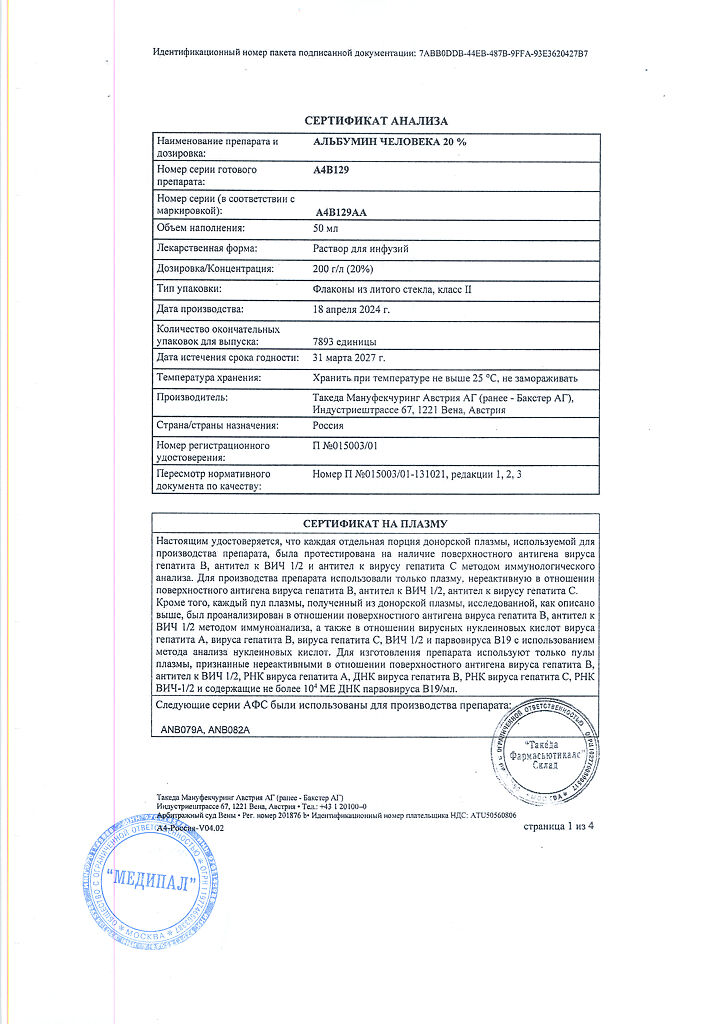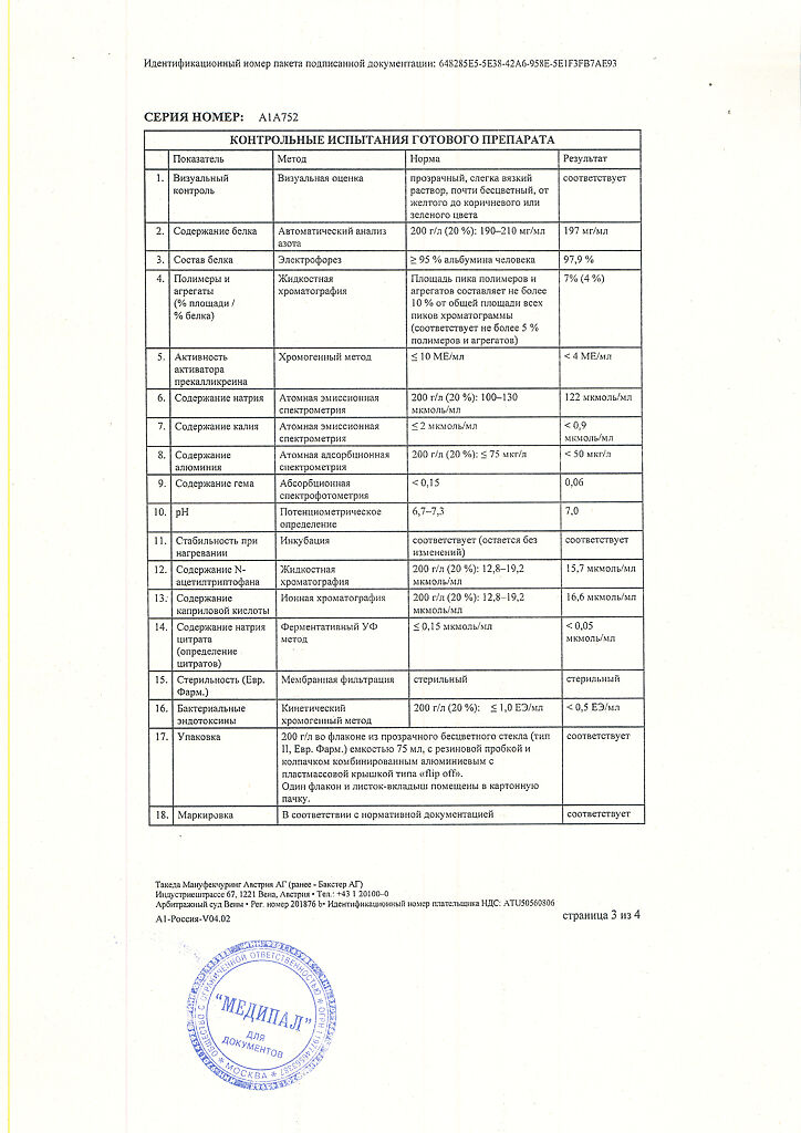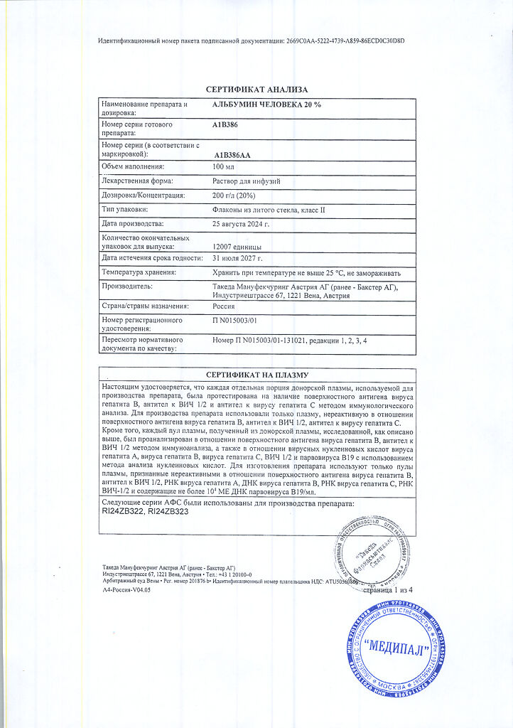 Не было сообщений о передаче вирусов с растворами альбумина, произведенными общепринятыми методами в соответствии со спецификациями Европейской Фармакопеи.