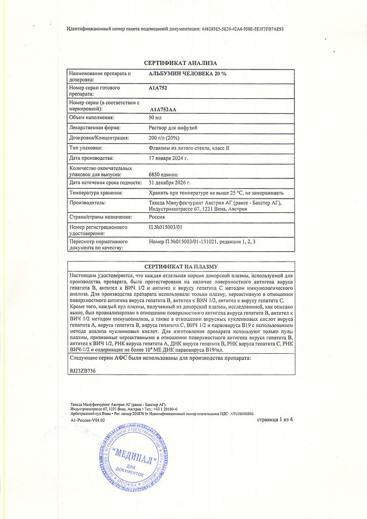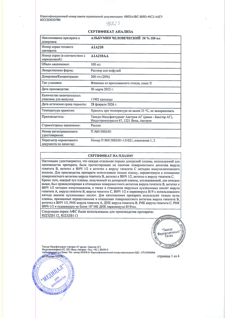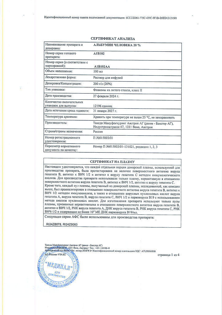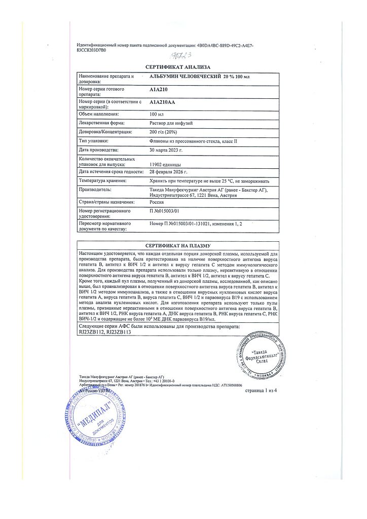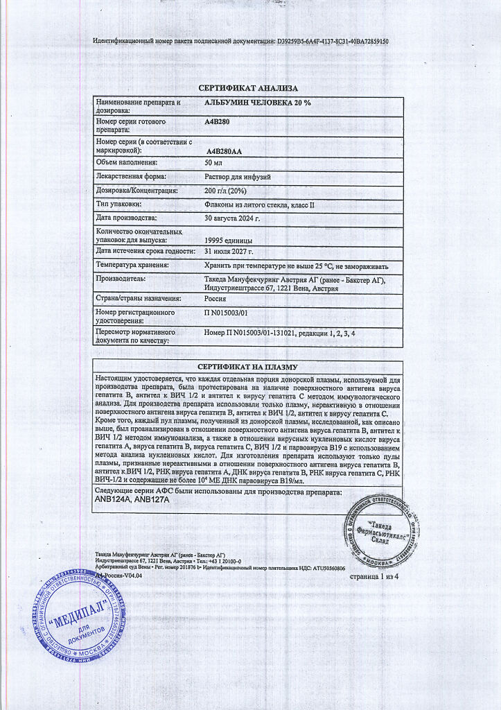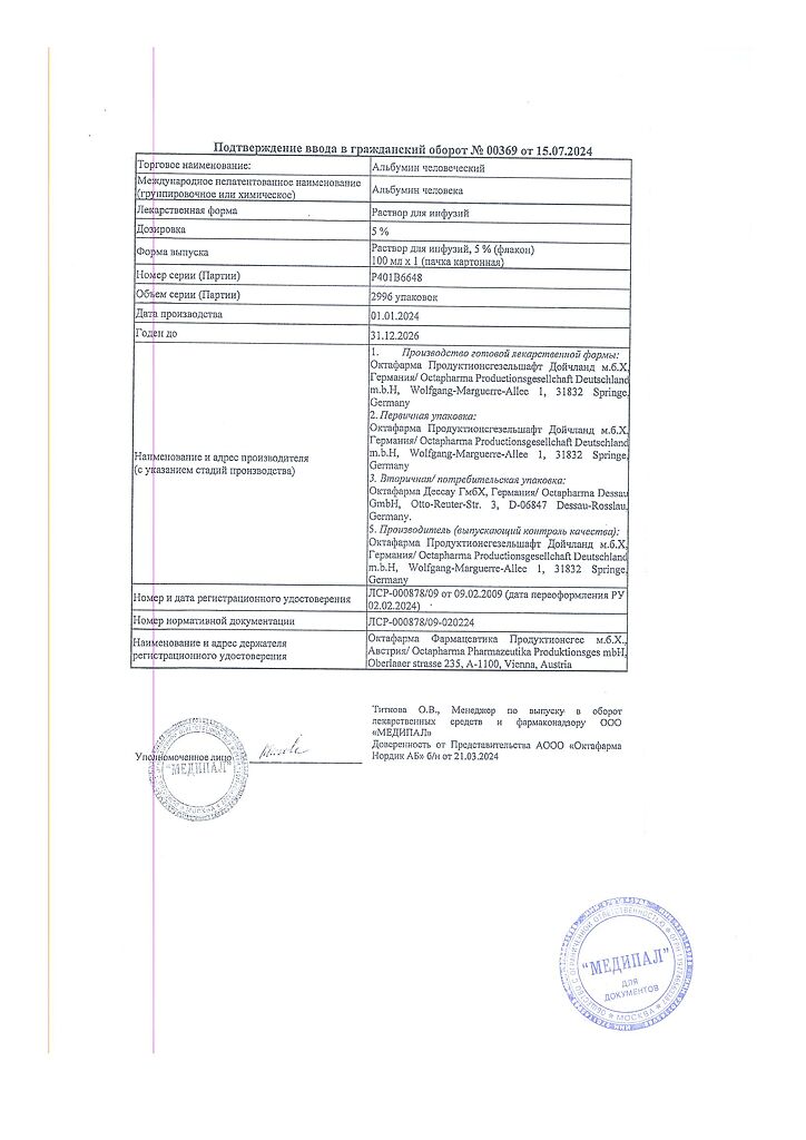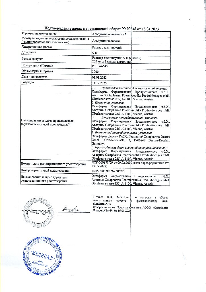 Не было сообщений о передаче вирусов с растворами альбумина, произведенными общепринятыми методами в соответствии со спецификациями Европейской Фармакопеи.