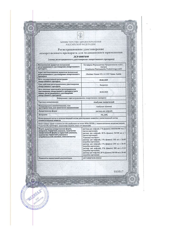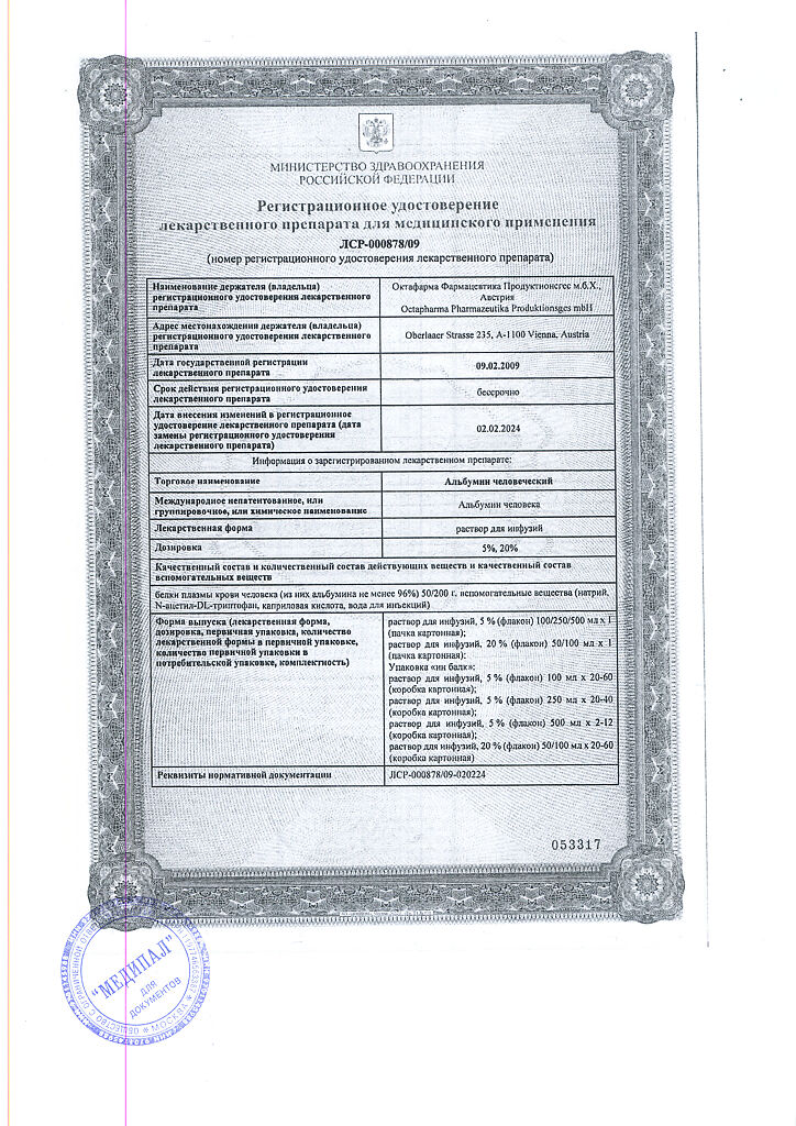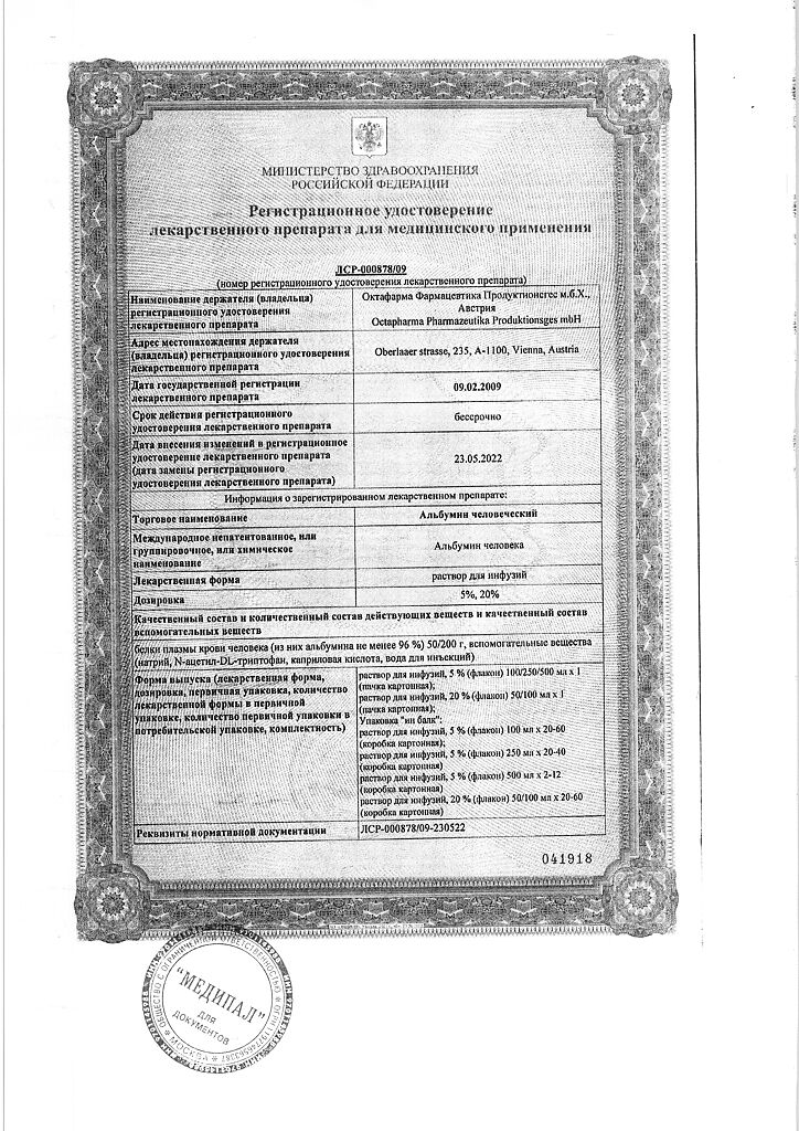 Раствор альбумина 5% является изоонкотическим плазме. Раствор альбумина 20% является гиперонкотическим, и его коллоидно-осмотический эффект превосходит таковой плазмы примерно в 4 раза. При в/в введении препарата повышается онкотическое давление во внутрисосудистом пространстве, что приводит к увеличению и поддержанию ОЦК. Продолжительность этого эффекта у разных пациентов может различаться. У некоторых пациентов увеличение объема плазмы может сохраняться в течение нескольких часов. Альбумин является также транспортным белком, связывающим и переносящим в сосудистом русле гормоны, ферменты, лекарственные препараты.