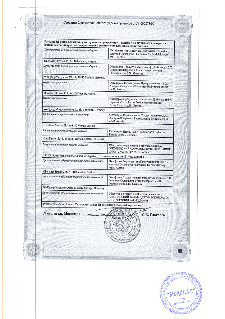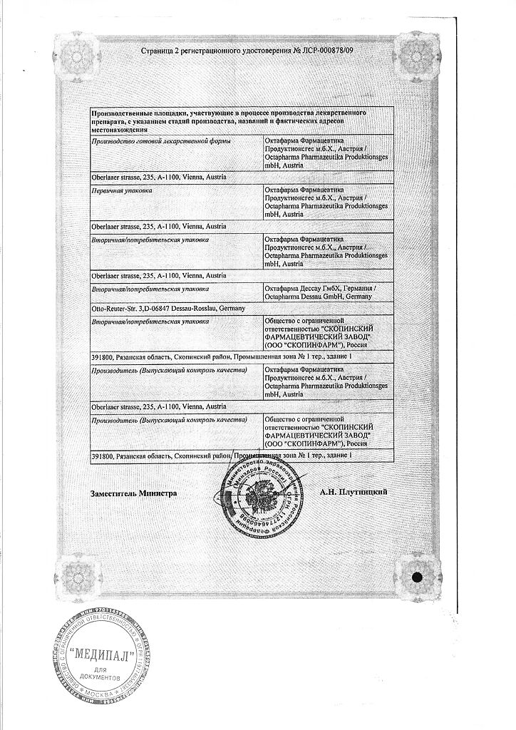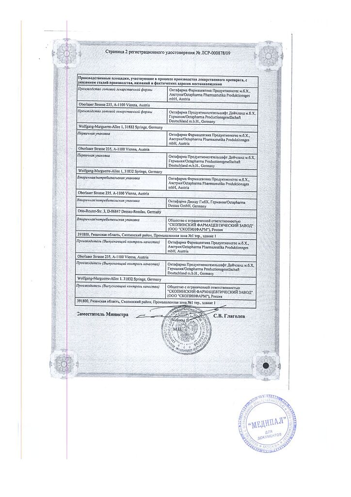 Стандартные меры для предотвращения инфекций, вызываемых применением лекарственных препаратов, произведенных из крови или плазмы человека, включают отбор доноров, проверку индивидуальных порций и пулов плазмы на специфические маркеры инфекции, а также включение в процесс производства эффективных мер по инактивации/элиминации вирусов. Тем не менее, при применении лекарственных препаратов, произведенных из крови или плазмы человека, нельзя полностью исключить вероятность передачи возбудителей инфекций. Это также относится к неизвестным или недавно выявленным вирусам и другим патогенным микроорганизмам.