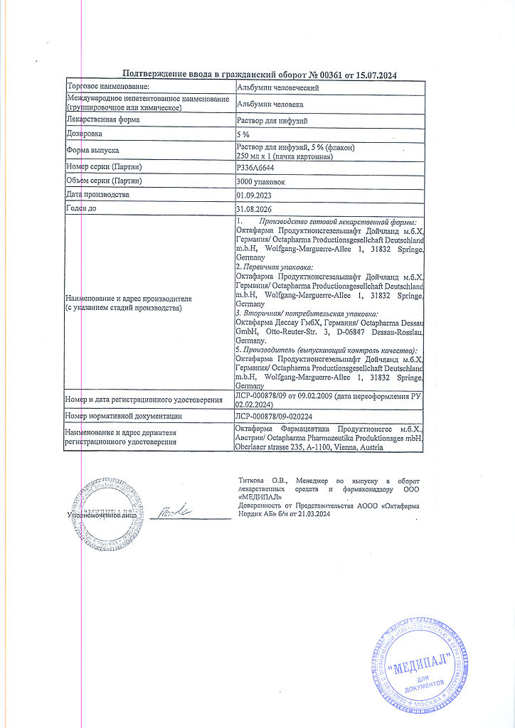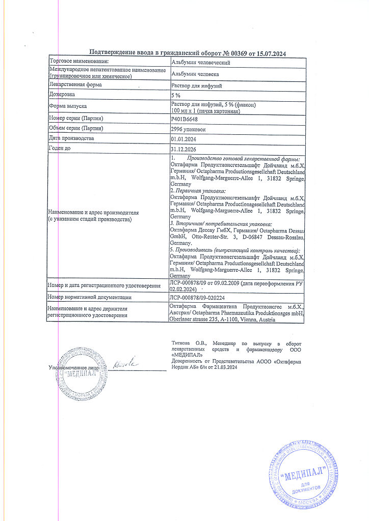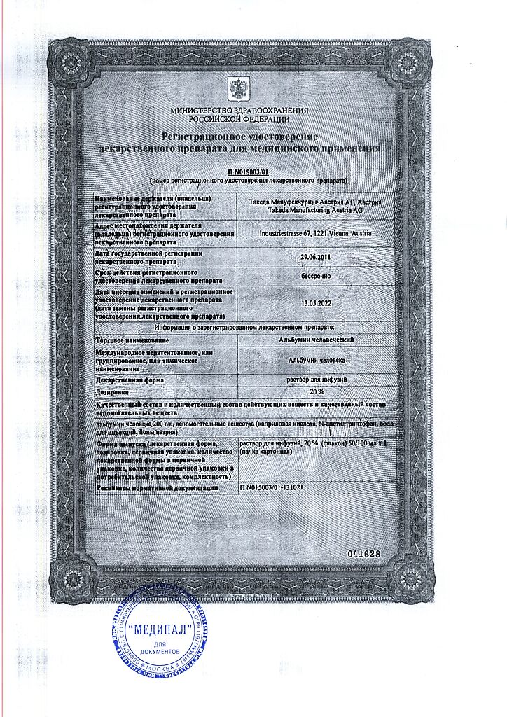 У здоровых добровольцев менее 10% в/в введенного альбумина выводится из сосудистого русла в течение первых 2 ч после инфузии. Однако пациенты, находящиеся в критическом состоянии, могут терять существенные количества альбумина, причем скорость его выхода из сосудистого русла непредсказуема.