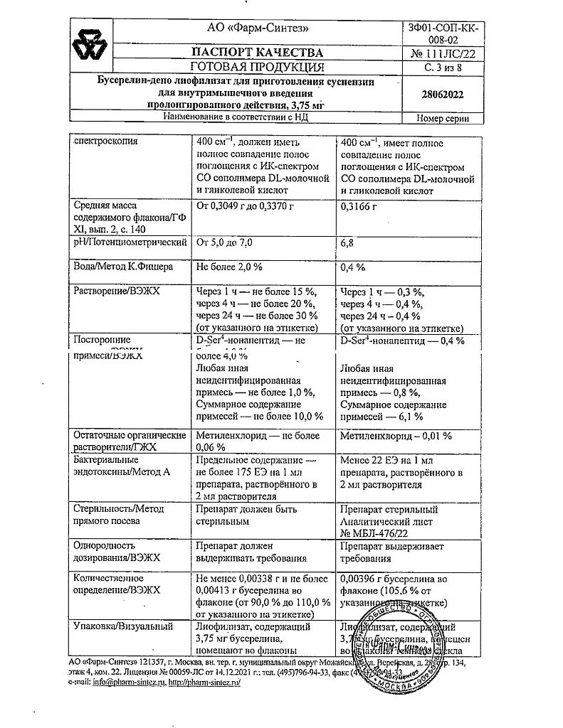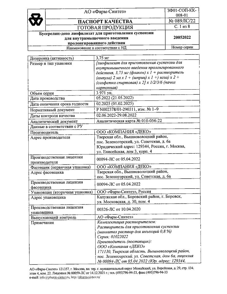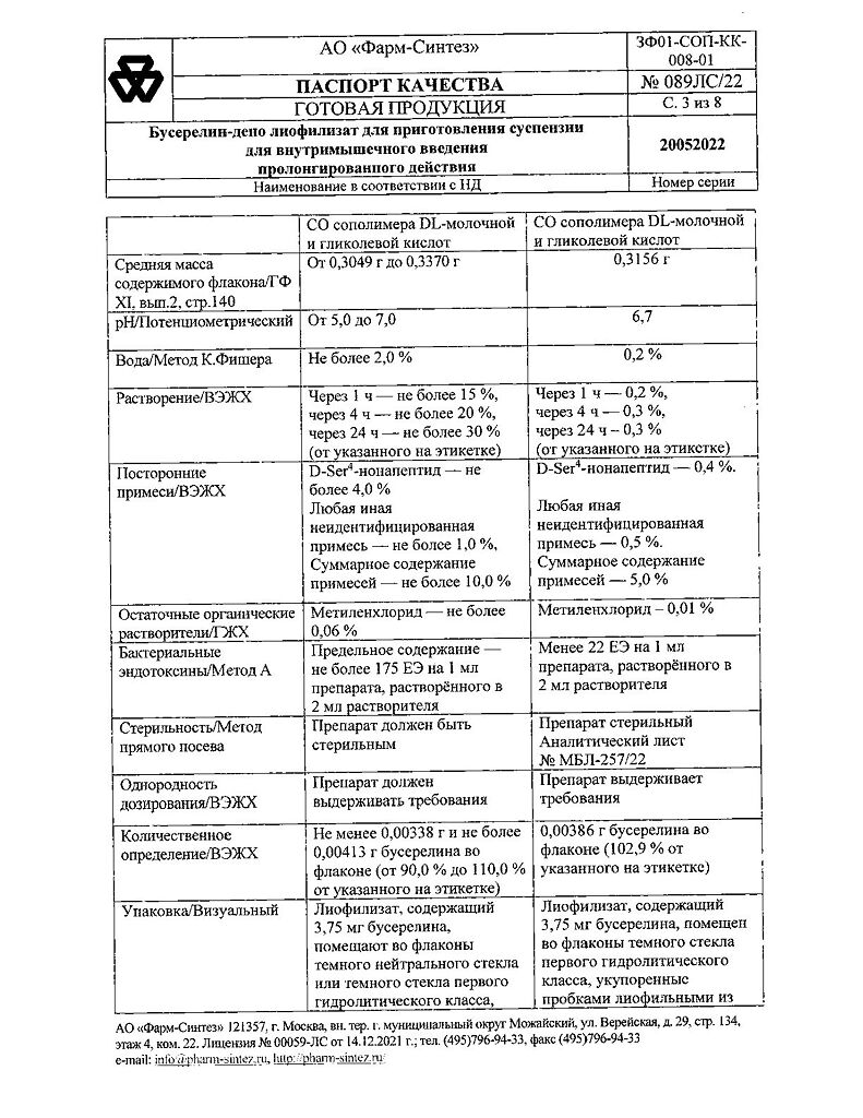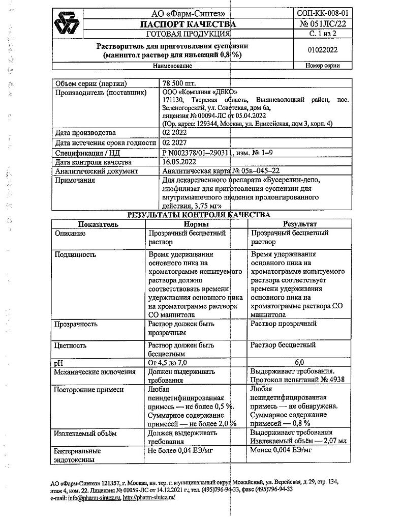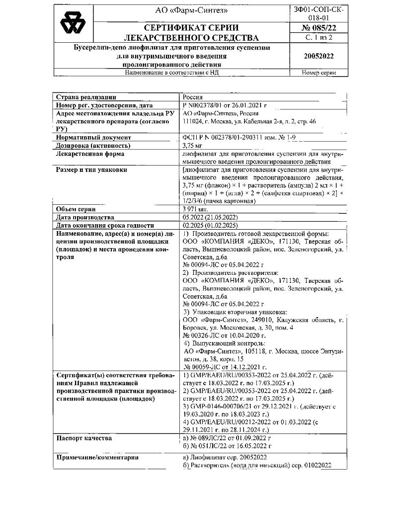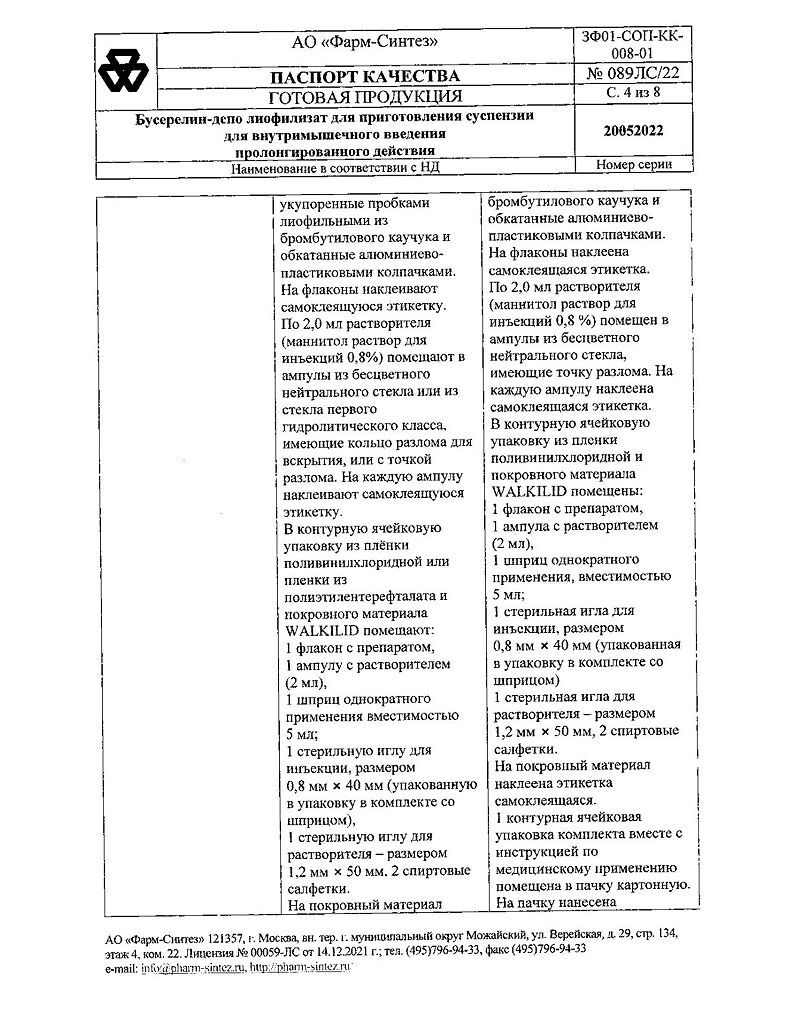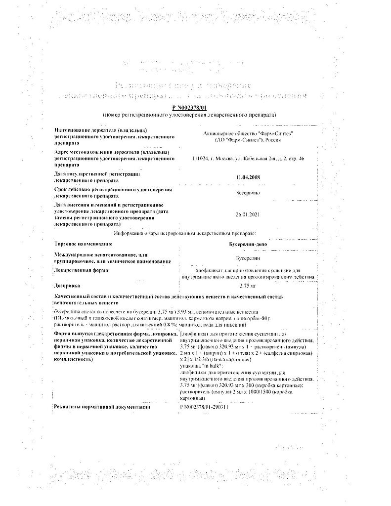 Действующие вещества: бусерелина ацетат 3,93 мг, что соответствует содержанию бусерелина 3,75 мг