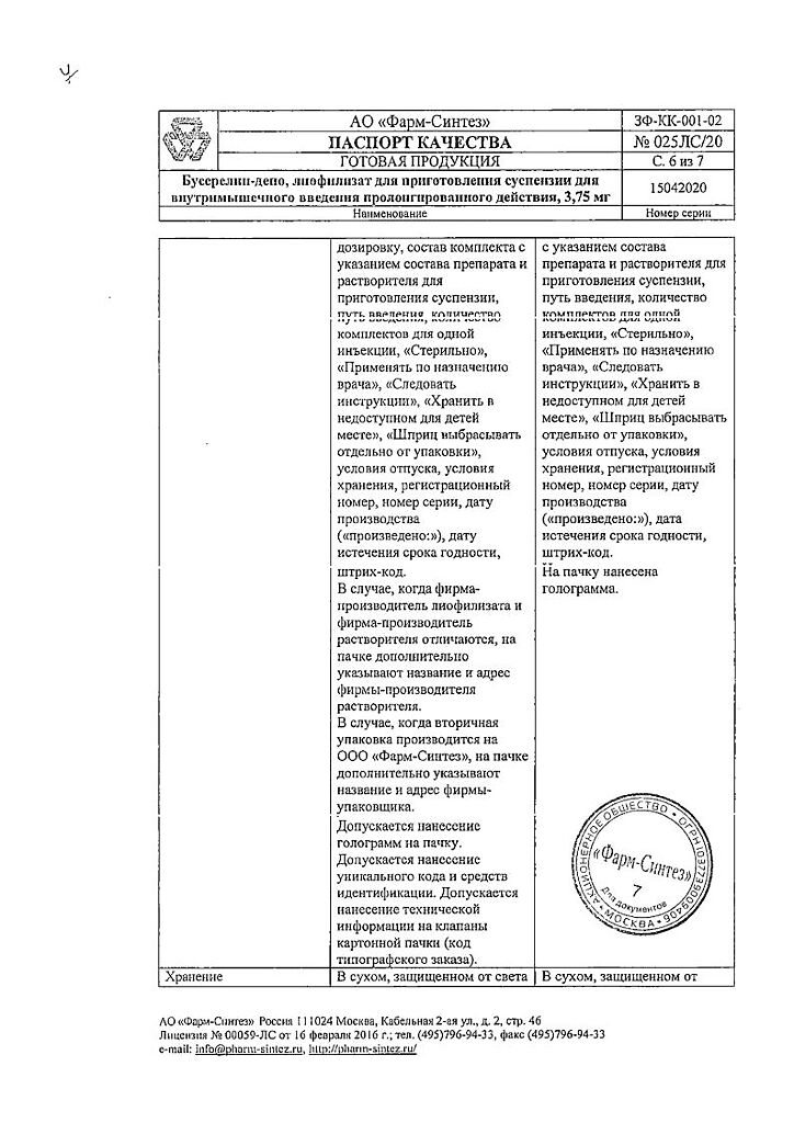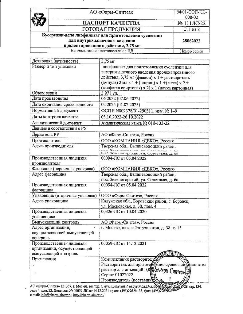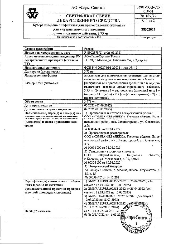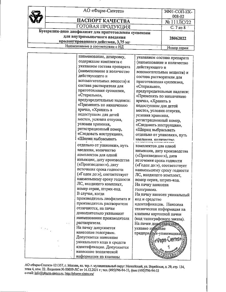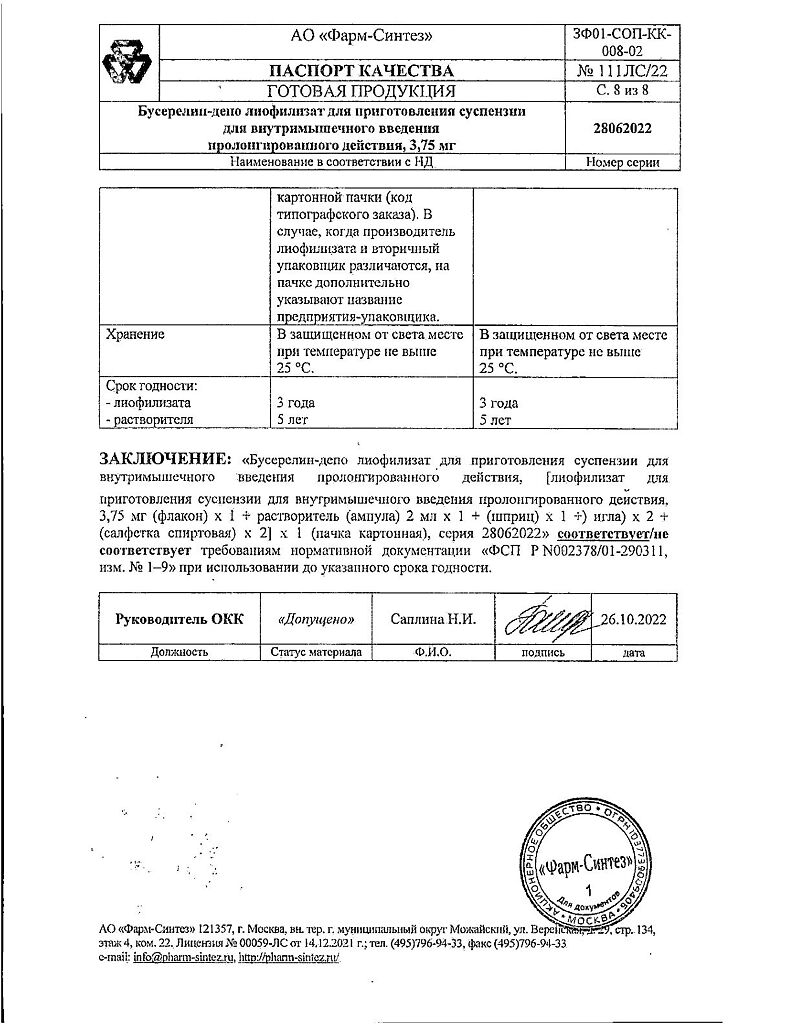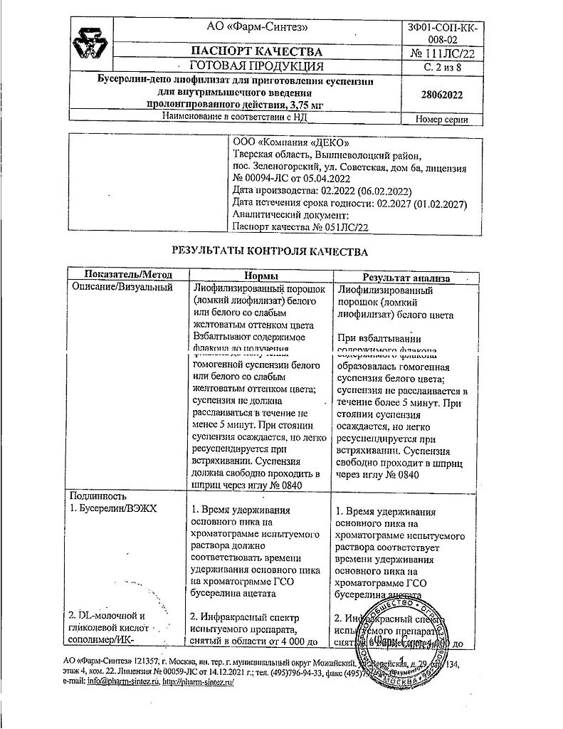 Действующие вещества: бусерелина ацетат 3,93 мг, что соответствует содержанию бусерелина 3,75 мг