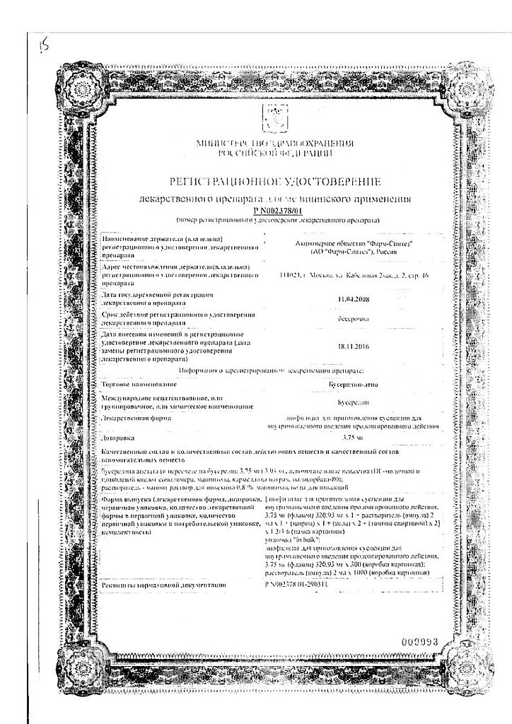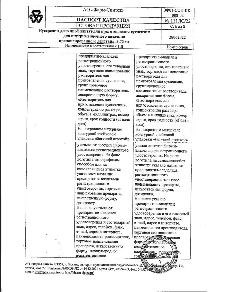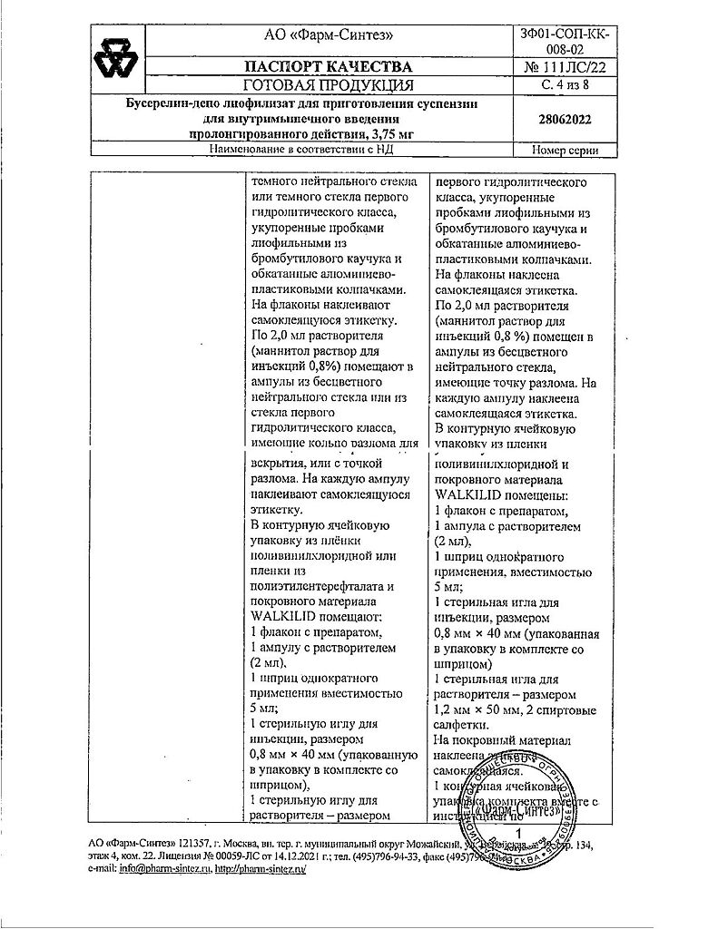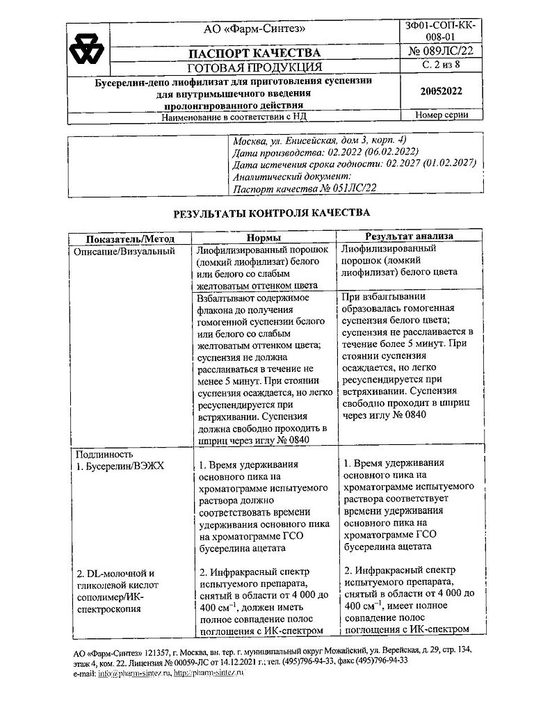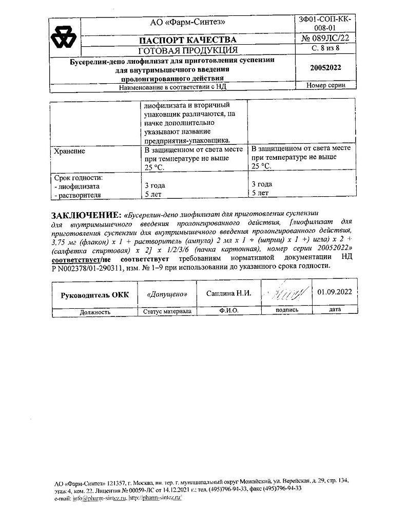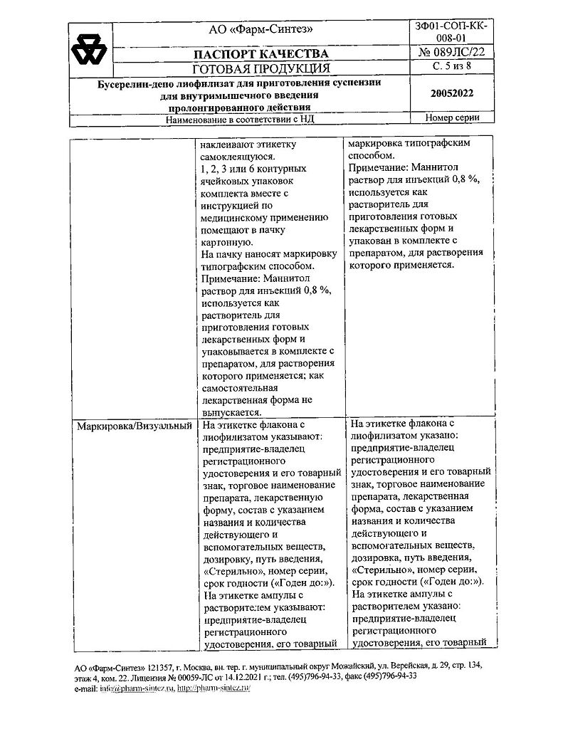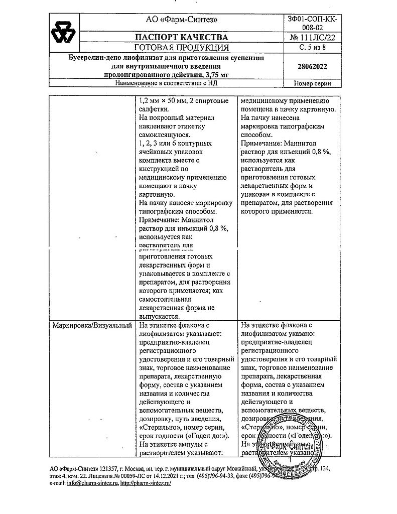 Действующие вещества: бусерелина ацетат 3,93 мг, что соответствует содержанию бусерелина 3,75 мг