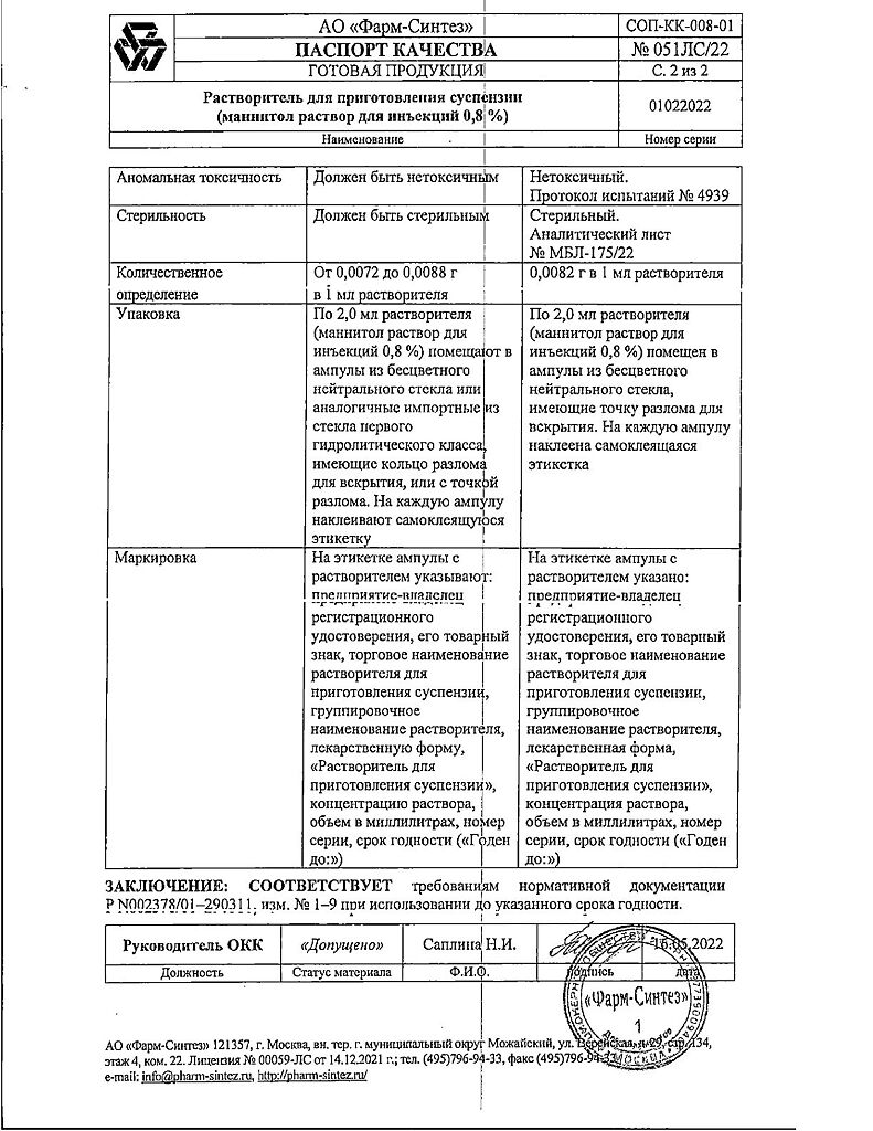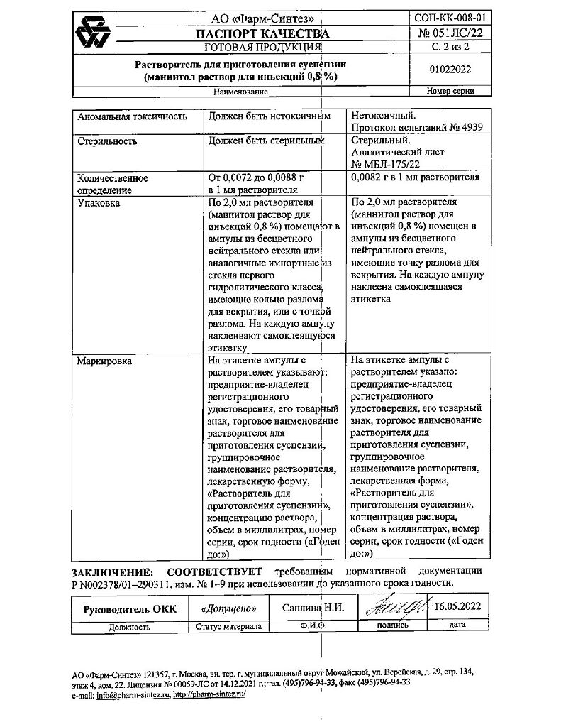 Растворитель: р-р маннита 0,8% д/и - 2 мл.