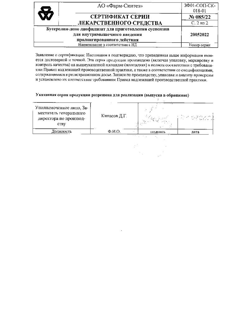 Биодоступность высокая. Cmax в плазме достигается примерно через 2-3 ч после в/м введения и сохраняется на уровне, достаточном для ингибирования синтеза гонадотропинов гипофизом не менее 4 недель.