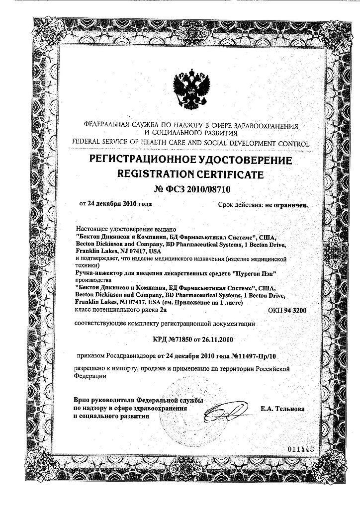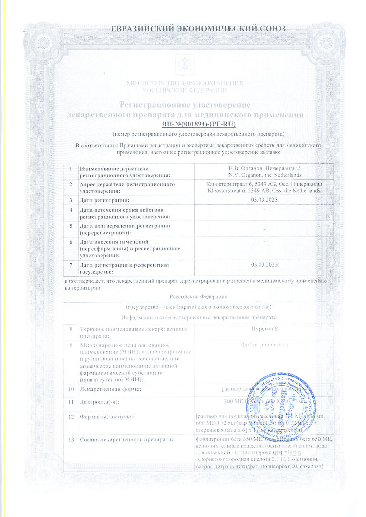 Внутримышечно, подкожно (медленно). Ановуляция — начинают с ежедневного введения 50–75 МЕ в течение 7 дней, при отсутствии ответа яичников дозу постепенно увеличивают (оптимально ежедневное повышение концентрации эстрадиола в плазме на 40–100%); при достижении доминантным фолликулом диаметра 18 мм или уровня эстрадиола 300–900 пг/мл, Пурегон отменяют и вводят человеческий хорионический гонадотропин. Индукция суперовуляции яичников при проведении экстракорпорального оплодотворения в первые 4 дня — 100–200 МЕ, затем дозу подбирают индивидуально, исходя из реакции яичников; обычно достаточно 75–375 МЕ в день в течение 1–2нед; при наличии 3 фолликулов диаметром 16–20 мм и концентрации эстрадиола в плазме 300–400 пг/мл/фолликул, конечную фазу созревания фолликула стимулируют человеческим хорионическим гонадотропином; через 34–35 ч проводят аспирацию яйцеклеток.