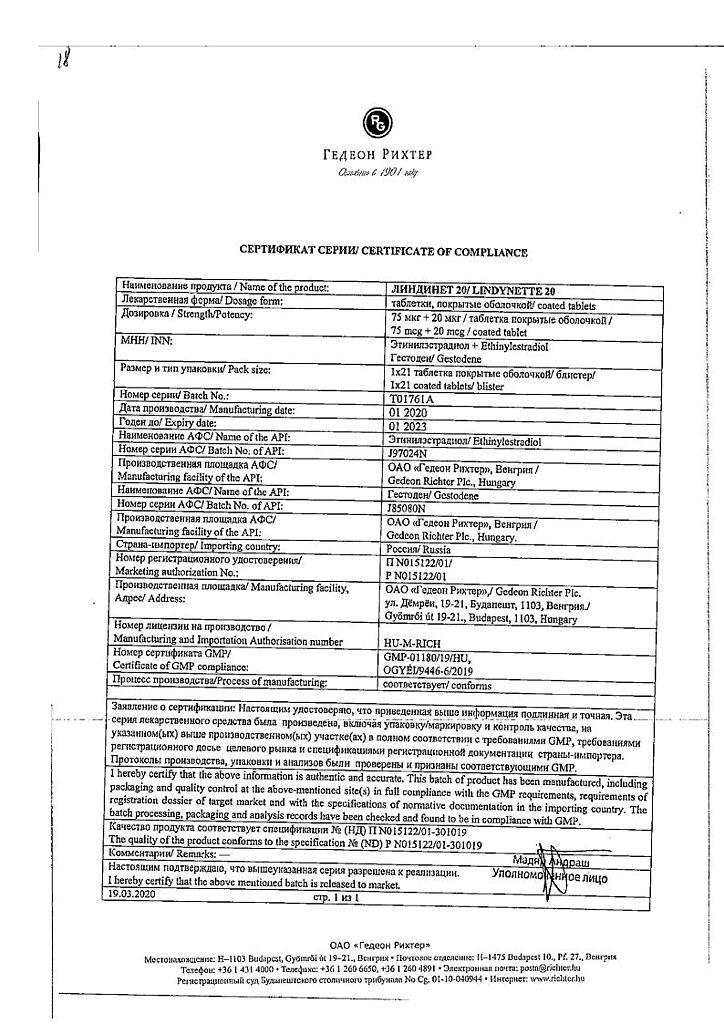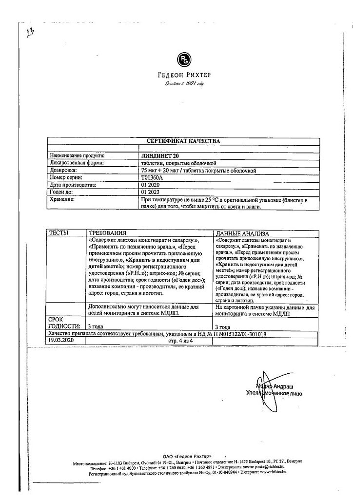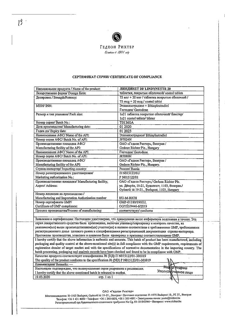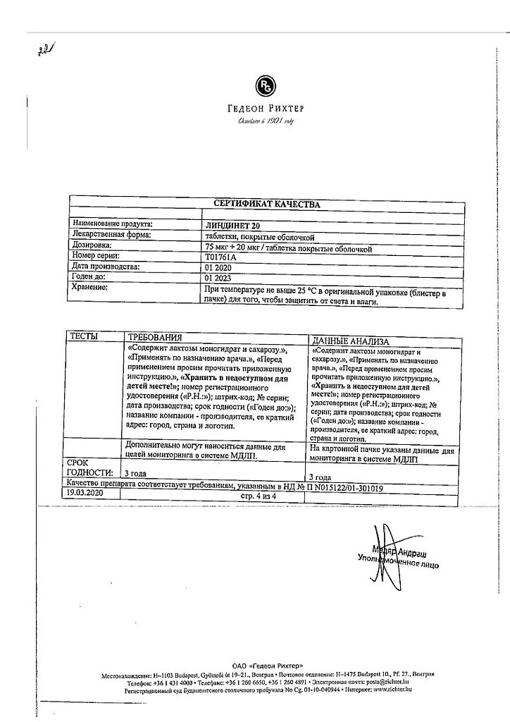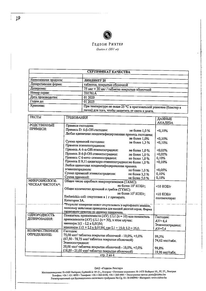 Линдинет 20, помимо предупреждения беременности, оказывает положительное влияние на менструальный цикл (при его нарушении): месячный цикл становится регулярным, снижается объем кровопотери во время менструации и частота развития железодефицитной анемии, снижается частота дисменореи, снижается частота появления функциональных овариальных кист, снижается частота внематочной беременности.