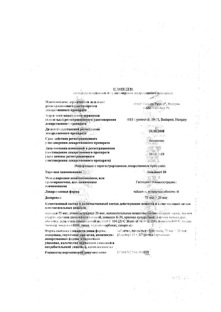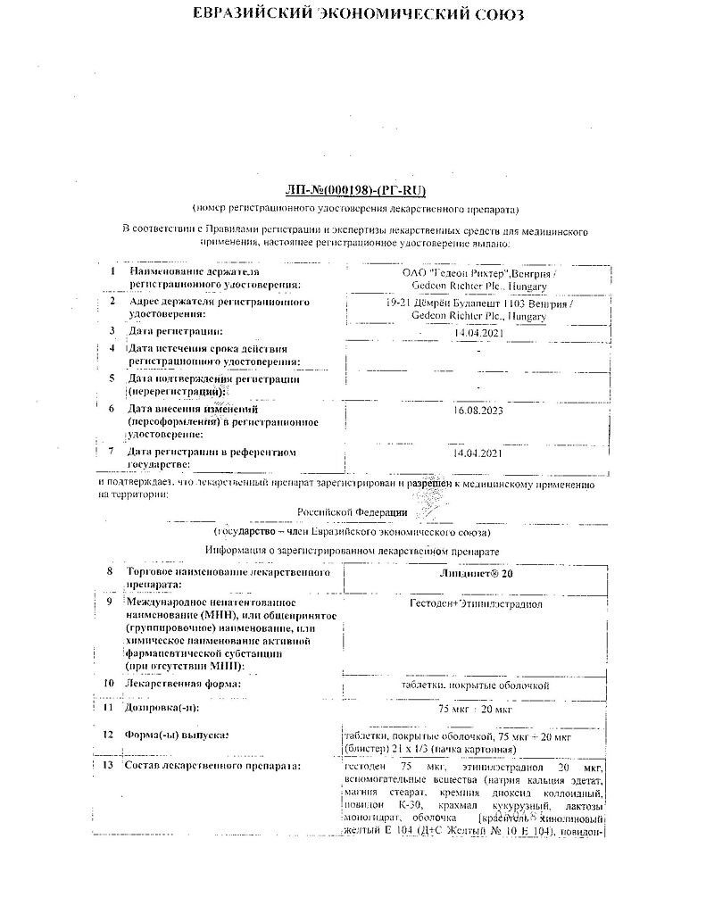 1 таблетка содержит этинилэстрадиола 20 мкг; гестодена 75 мкг;