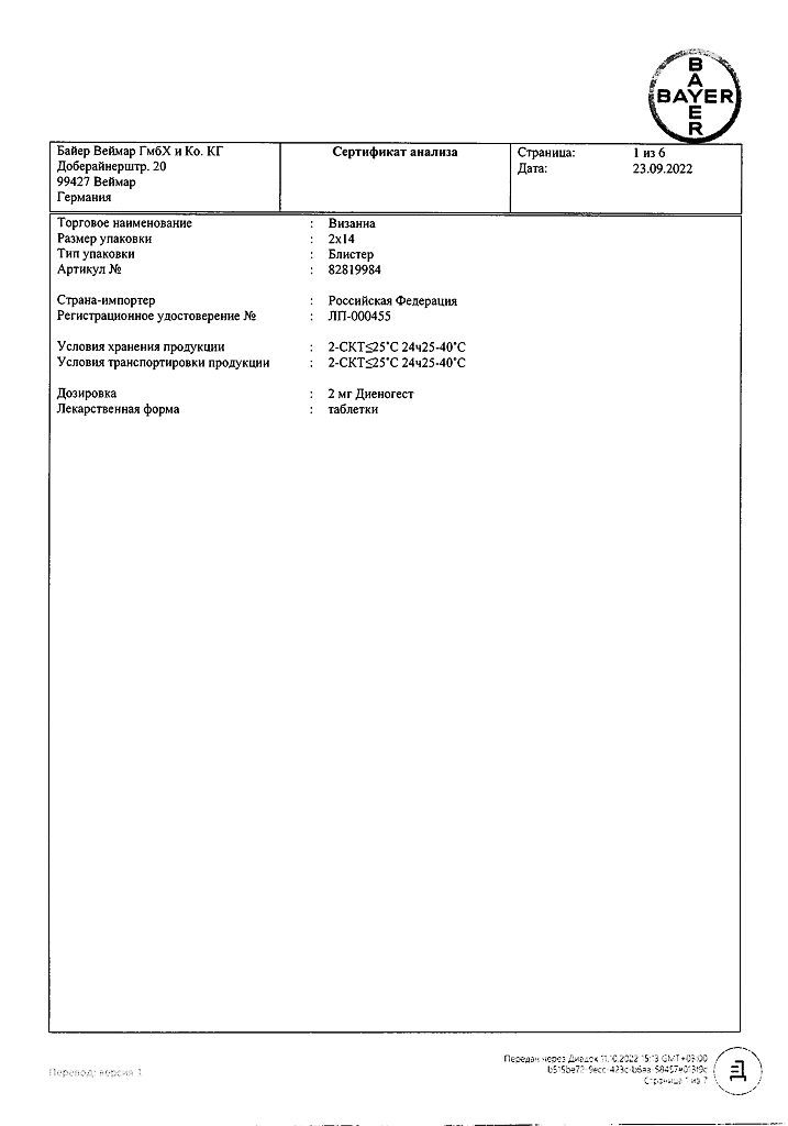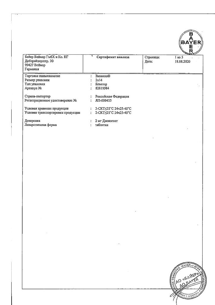 Согласно имеющимся данным, физиологический менструальный цикл восстанавливается в пределах 2 мес после прекращения приема препарата Визанна.