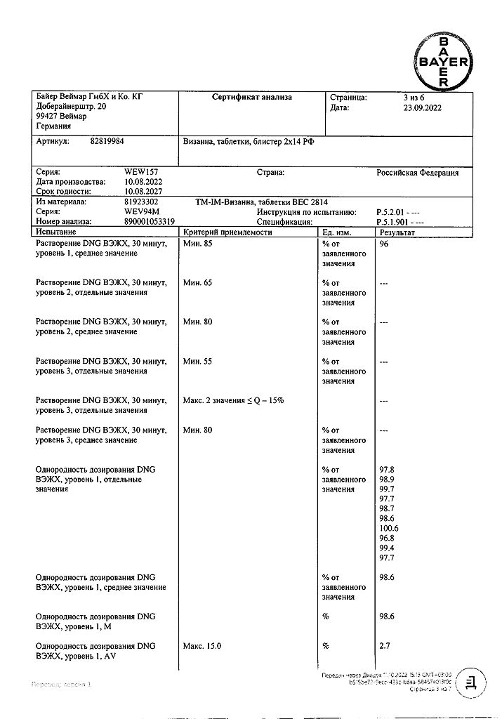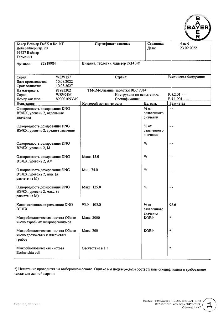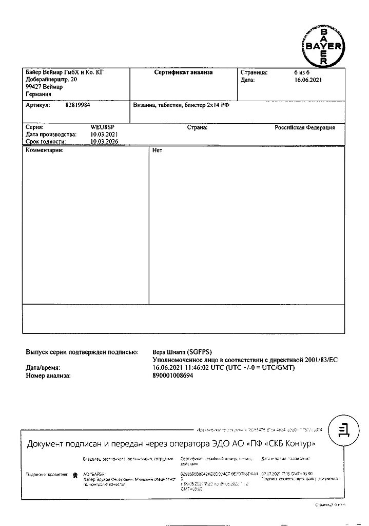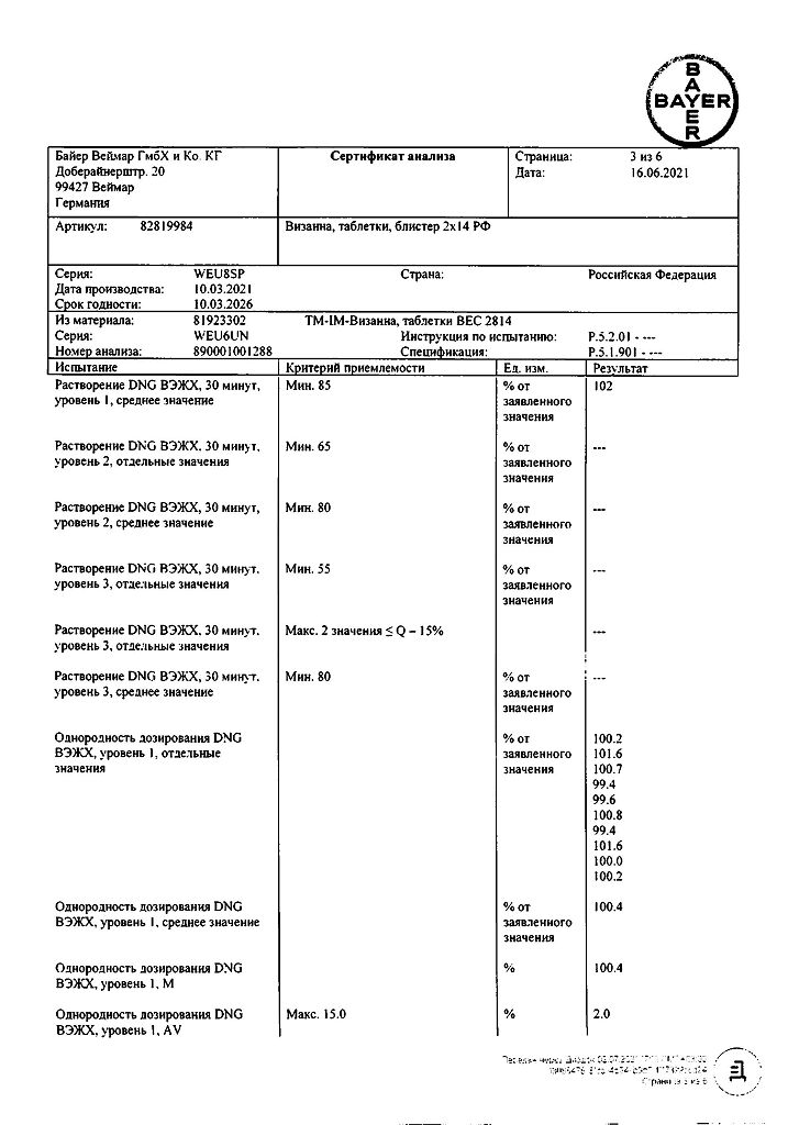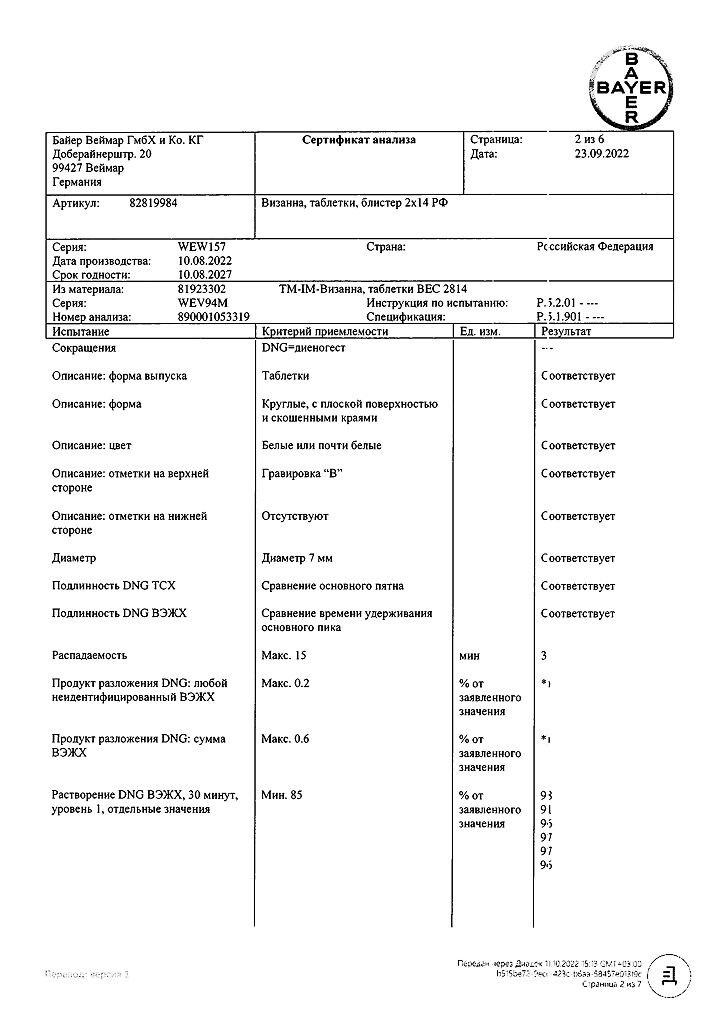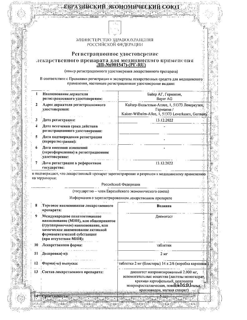 В одной таблетке препарата Визанна содержится 63 мг лактозы моногидрата. Находящимся на безлактозной диете пациенткам с редкими наследственными нарушениями, такими как непереносимость галактозы, дефицит лактазы Lapp или глюкозо-галактозная мальабсорбция, следует учитывать содержащийся в препарате Визанна объем лактозы.