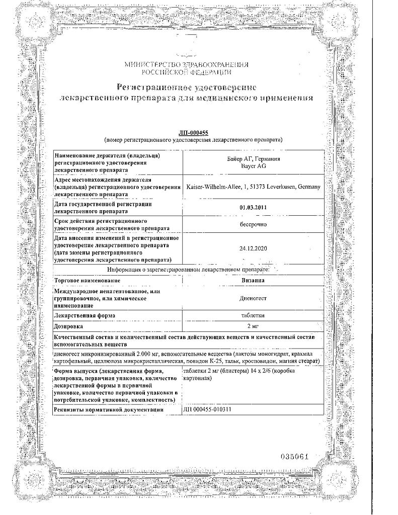 Не отмечено снижения минеральной плотности костной ткани, а также существенного влияния препарата Визанна на стандартные лабораторные параметры, включая общие и биохимические показатели крови, печеночные ферменты, липиды и HbA1C. Диеногест умеренно снижает выработку эстрогенов в яичниках.