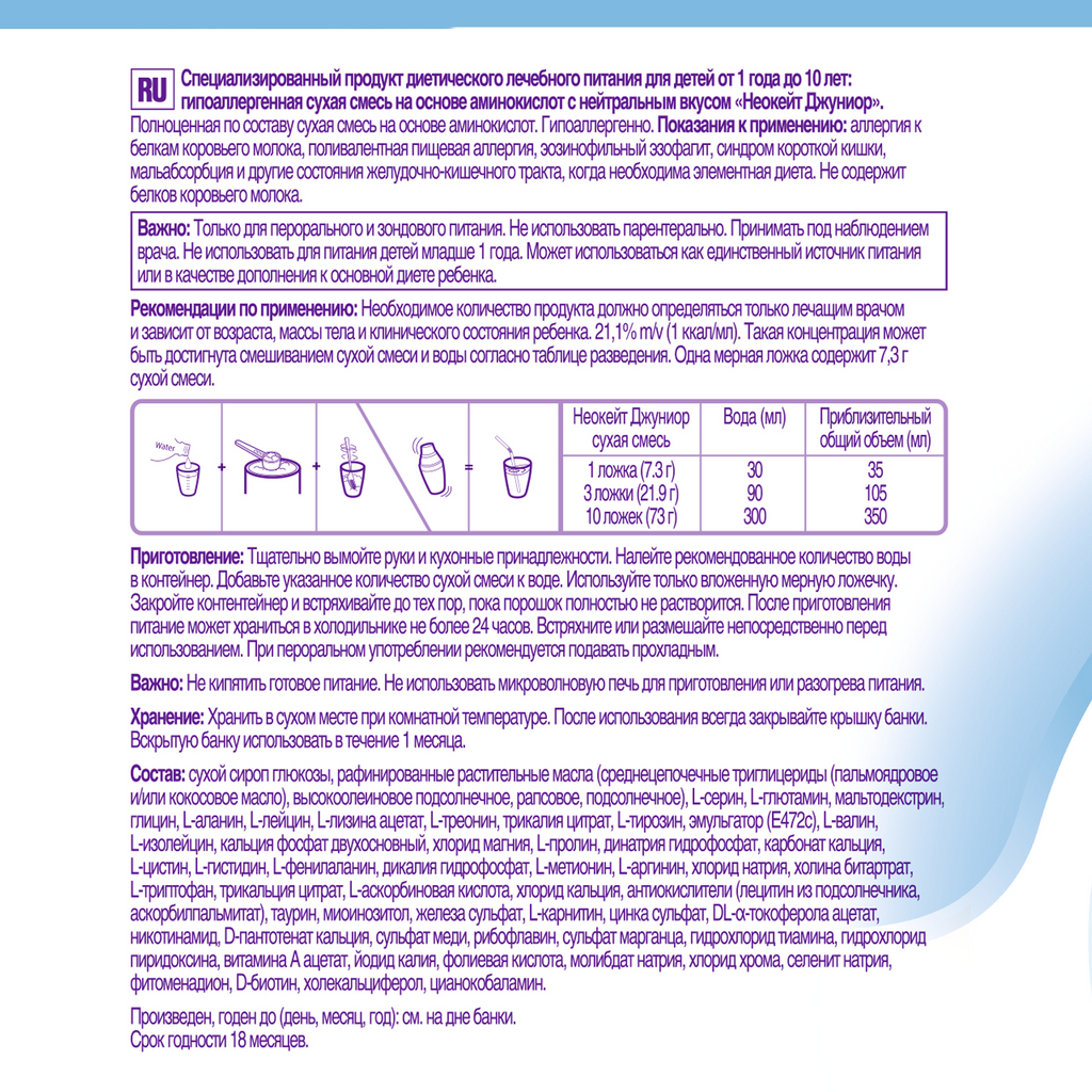 Расчет объема детской смеси Neocate для конкретного ребенка производится лечащим врачом или диетологом с учетом возраста, веса, нутритивного статуса, сопутствующих заболеваний и состояний.