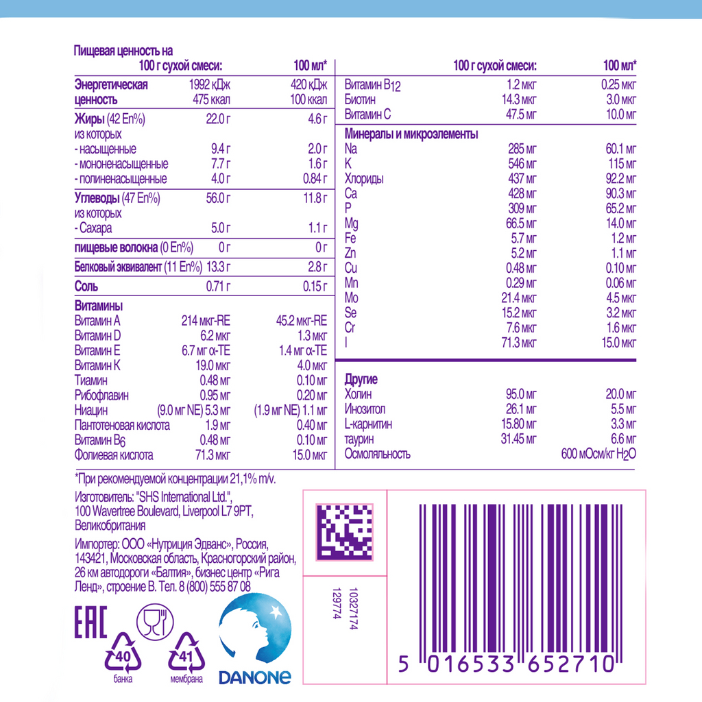 Пищевая ценность и свойства на 100 мл готовой смеси: энергия - 71 Ккал, белковый эквивалент (10% энергии) - 1,95г, углеводы (45% энергии) - 8,1г, жиры (45% энергии) - 3,5г, насыщенные ЖК - 1,0 г, мононенасыщенные ЖК - 1,6г, полиненасыщенные ЖК - 0,6г.